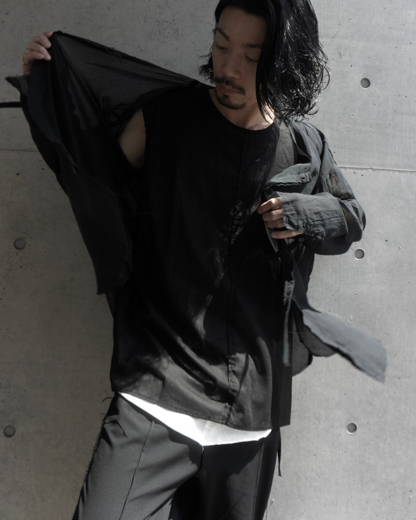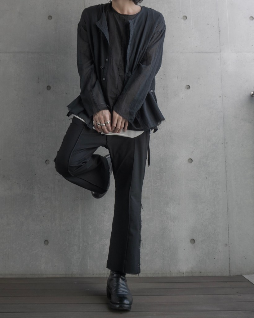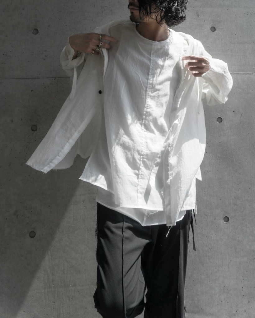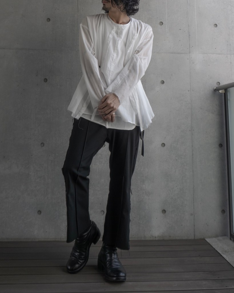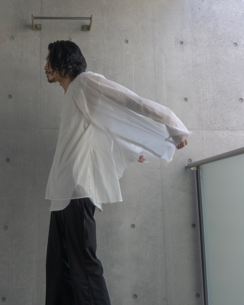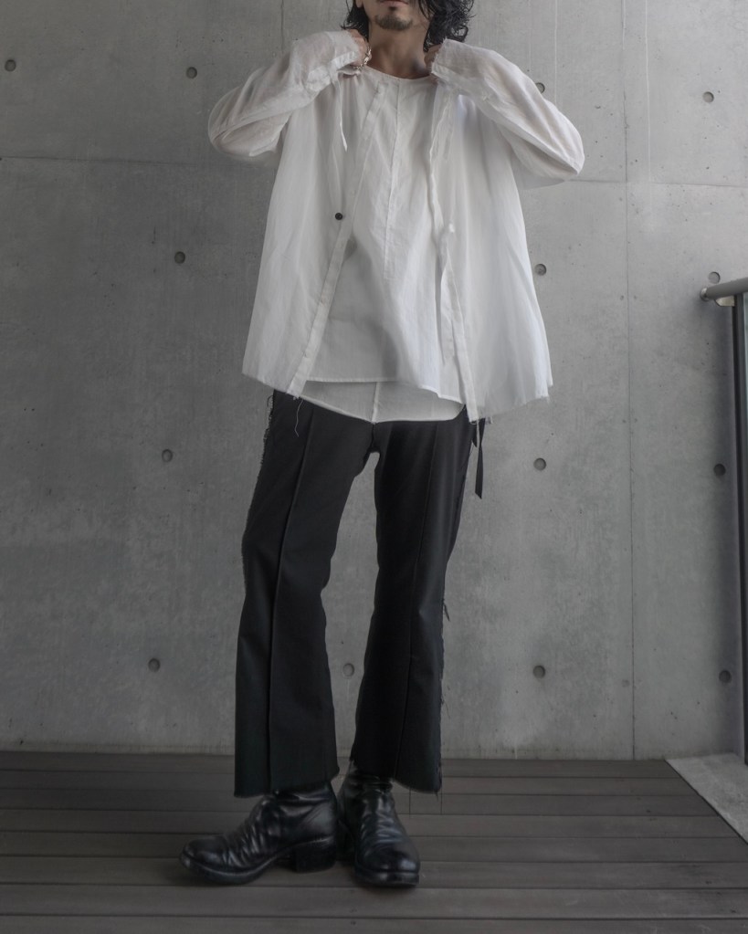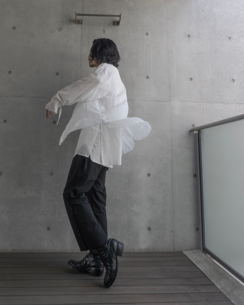 ASKYYのクリエイションにおいてこれまで一貫してきたのは一型一型への全集中であり、個々の完成度こそが正義であると信じてきました。しかし、今回初めて「対」を前提としたものづくりに挑みました。量子力学における量子もつれのような相互性。一方がAであれば、もう一方は必然的にBである。両者があって初めて成立する整合性。それは、ありふれたセットアップや同素材のレイヤードといった短絡的な手法とは一線を画します。今までセパレートという概念もとりいれて作成してきましたが、それとも違う。今回はレイヤードを分解し、セパレートし、その単体をそれぞれ拡張させるという新たな挑戦。