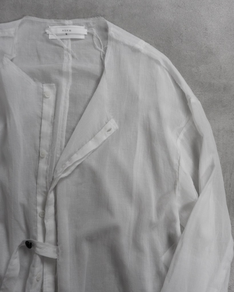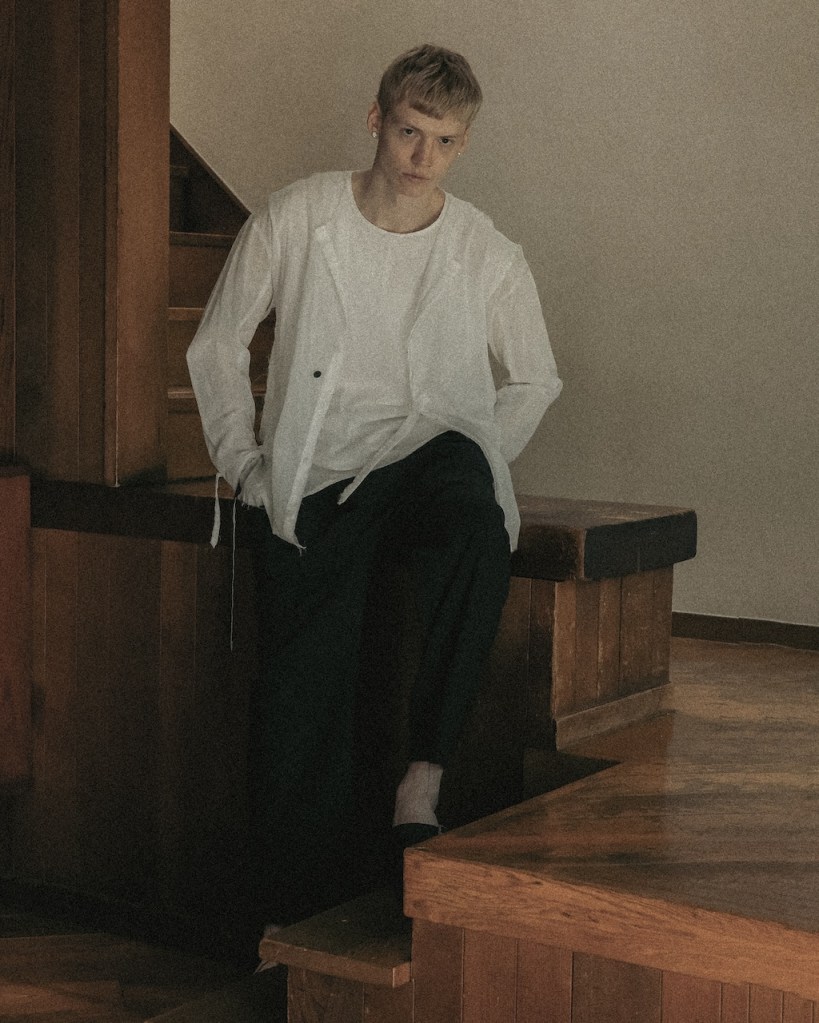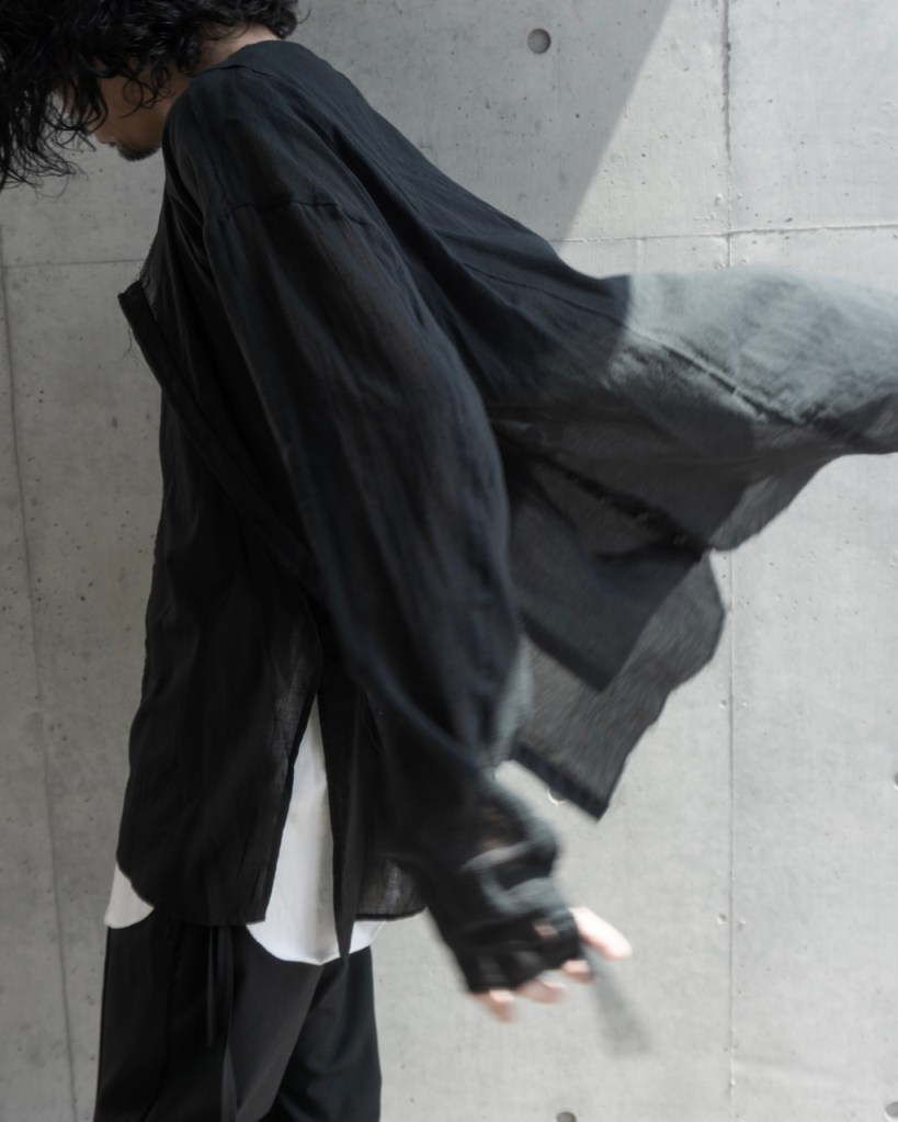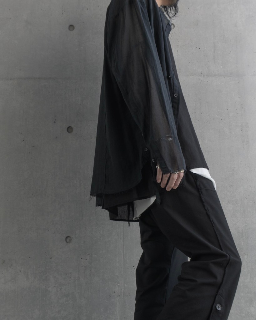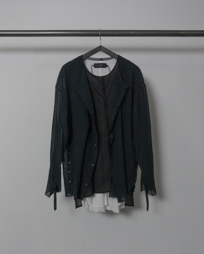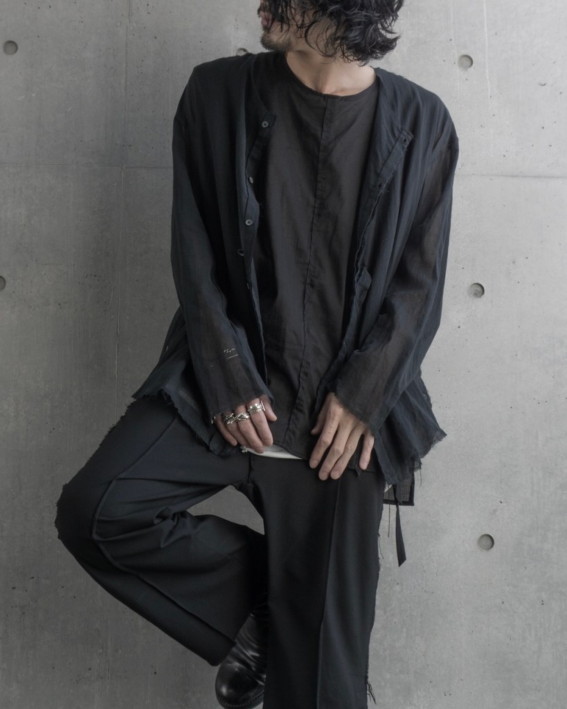ASKYYのクリエイションにおいてこれまで一貫してきたのは一型一型への全集中であり、個々の完成度こそが正義であると信じてきました。しかし、今回初めて「対」を前提としたものづくりに挑みました。量子力学における量子もつれのような相互性。一方がAであれば、もう一方は必然的にBである。両者があって初めて成立する整合性。それは、ありふれたセットアップや同素材のレイヤードといった短絡的な手法とは一線を画します。今までセパレートという概念もとりいれて作成してきましたが、それとも違う。今回はレイヤードを分解し、セパレートし、その単体をそれぞれ拡張させるという新たな挑戦。