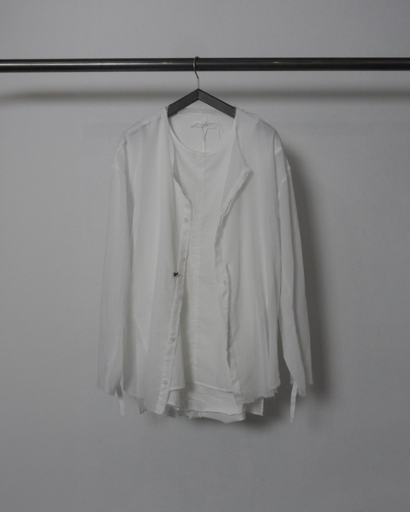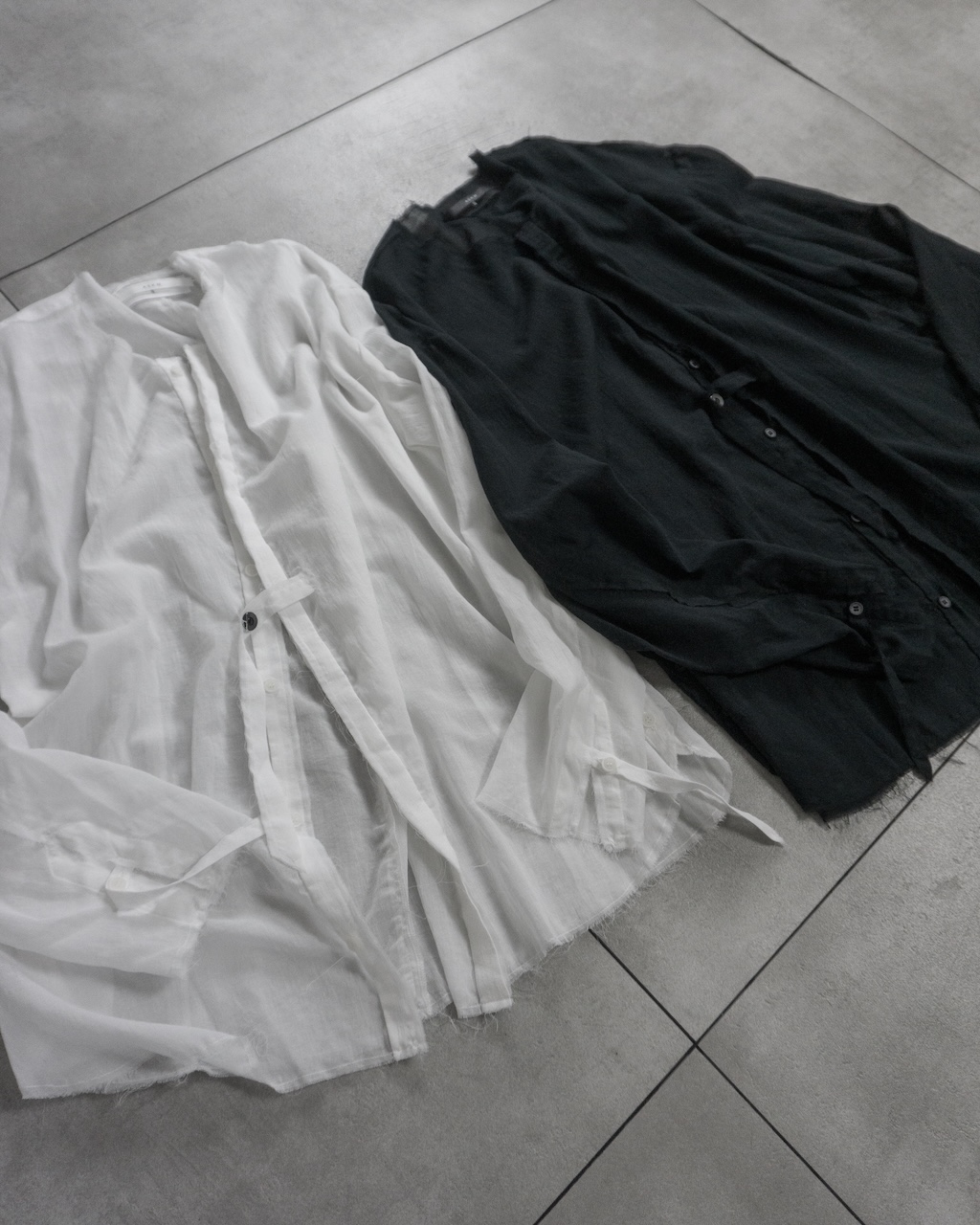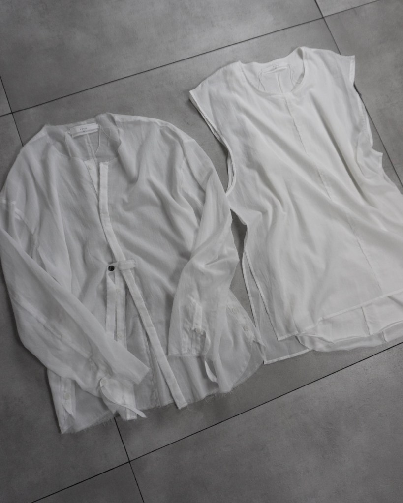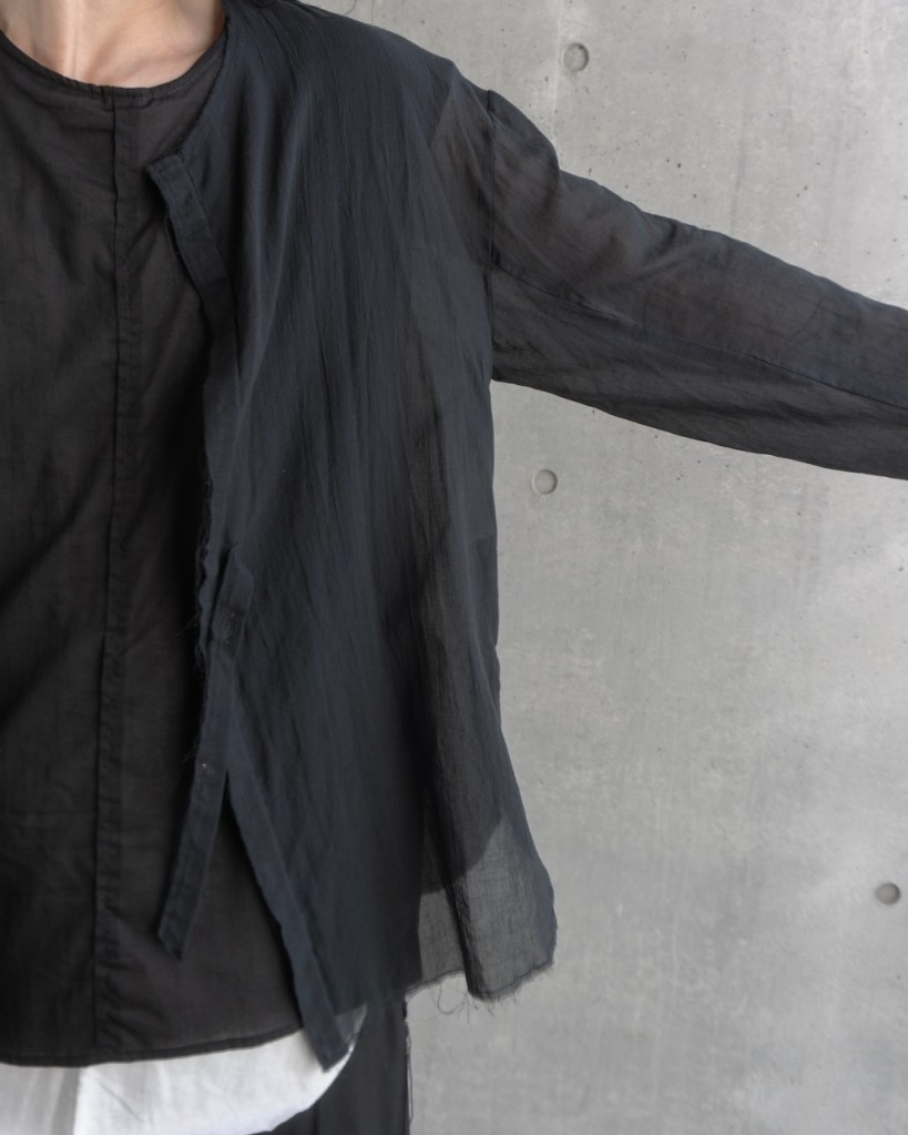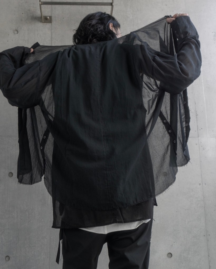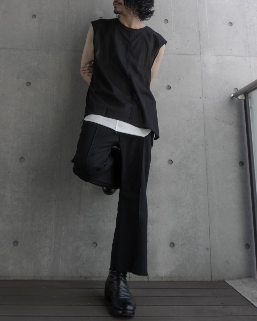 ASKYYのクリエイションにおいてこれまで一貫してきたのは一型一型への全集中であり、個々の完成度こそが正義であると信じてきました。しかし、今回初めて「対」を前提としたものづくりに挑みました。量子力学における量子もつれのような相互性。一方がAであれば、もう一方は必然的にBである。両者があって初めて成立する整合性。それは、ありふれたセットアップや同素材のレイヤードといった短絡的な手法とは一線を画します。今までセパレートという概念もとりいれて作成してきましたが、それとも違う。今回はレイヤードを分解し、セパレートし、その単体をそれぞれ拡張させるという新たな挑戦。