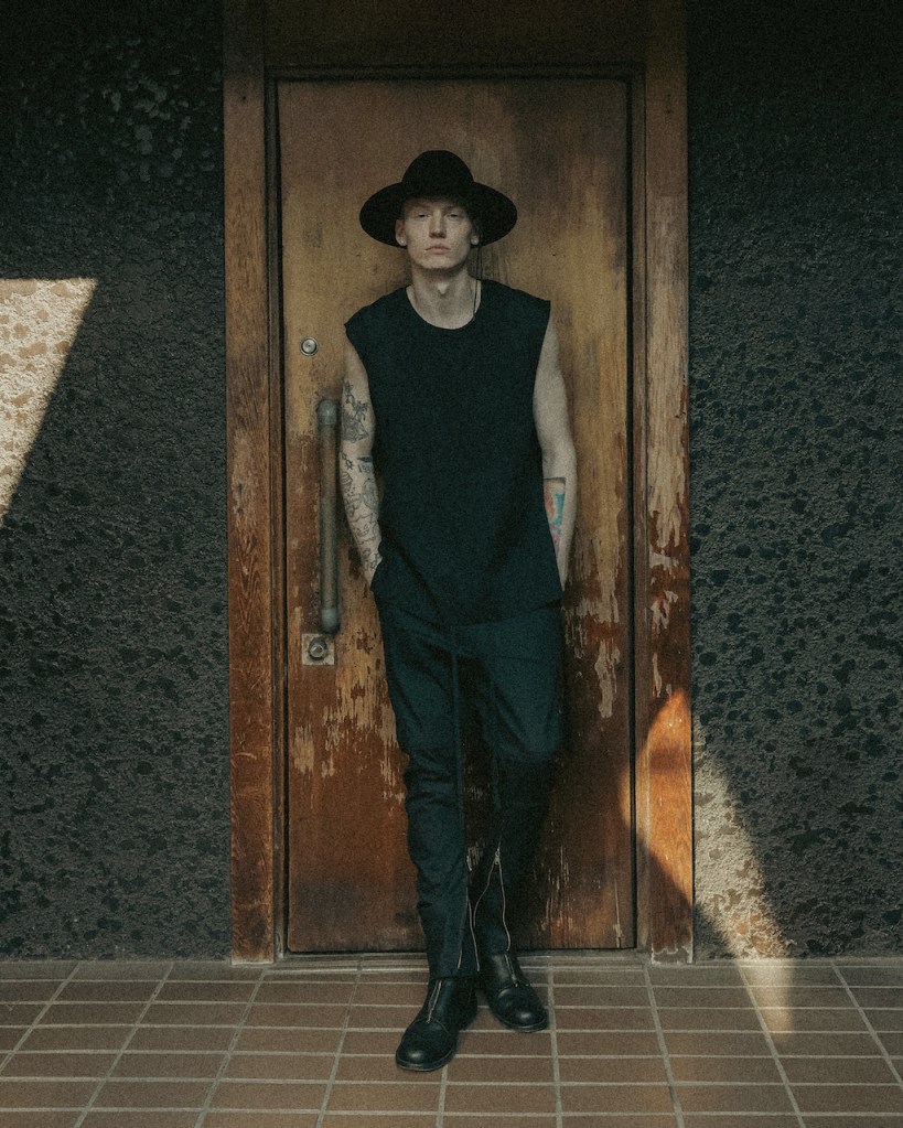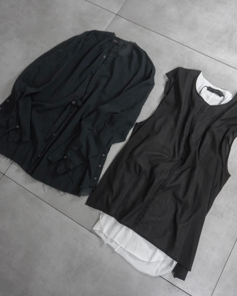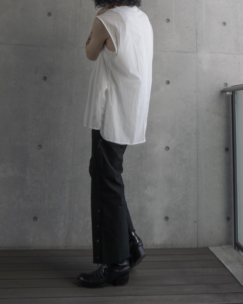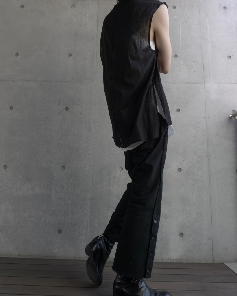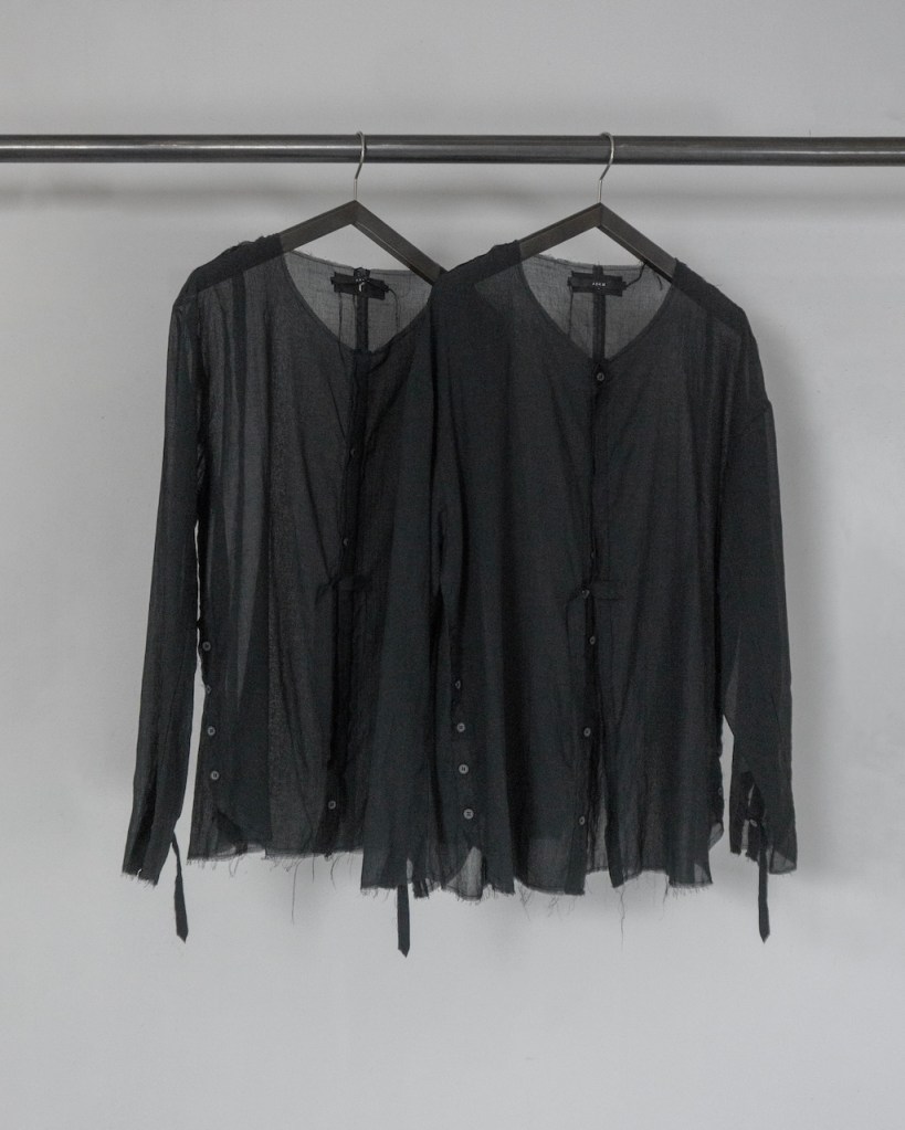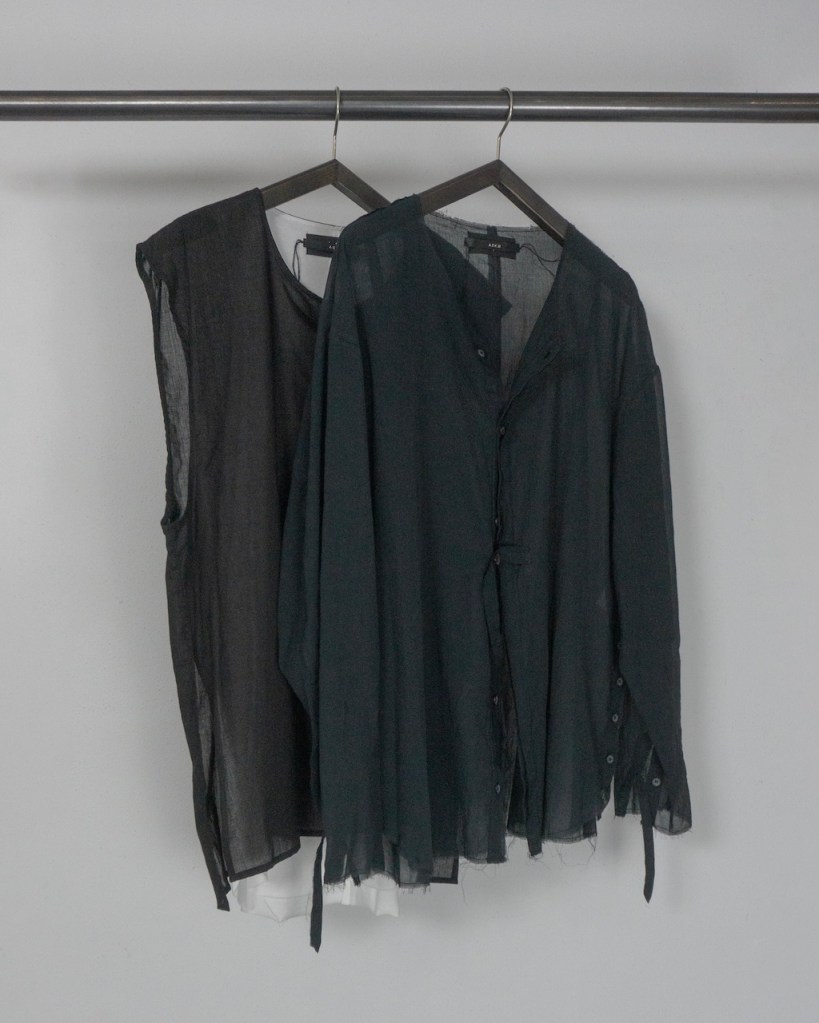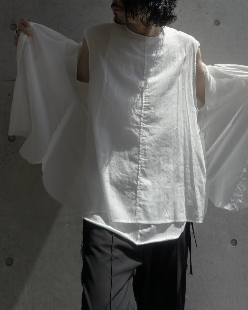 ASKYYのクリエイションにおいてこれまで一貫してきたのは一型一型への全集中であり、個々の完成度こそが正義であると信じてきました。しかし、今回初めて「対」を前提としたものづくりに挑みました。量子力学における量子もつれのような相互性。一方がAであれば、もう一方は必然的にBである。両者があって初めて成立する整合性。それは、ありふれたセットアップや同素材のレイヤードといった短絡的な手法とは一線を画します。今までセパレートという概念もとりいれて作成してきましたが、それとも違う。今回はレイヤードを分解し、セパレートし、その単体をそれぞれ拡張させるという新たな挑戦。