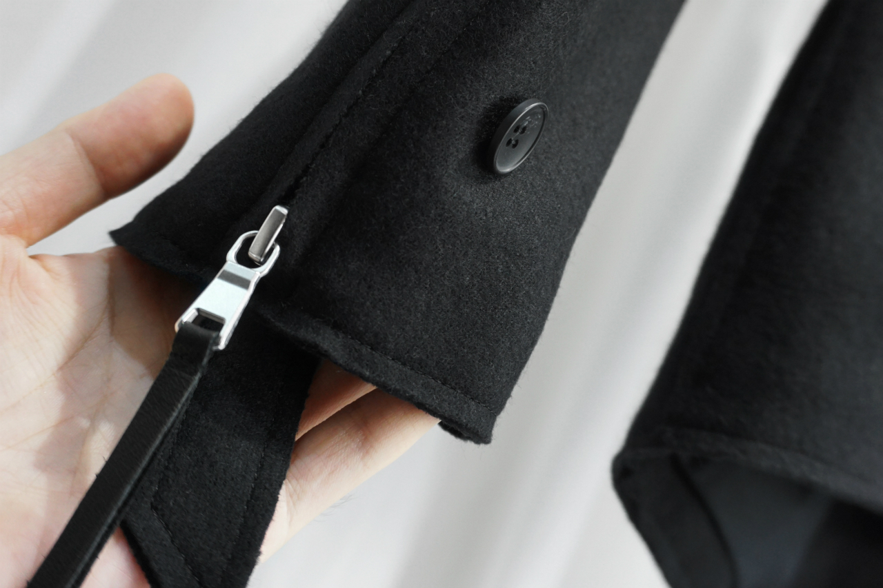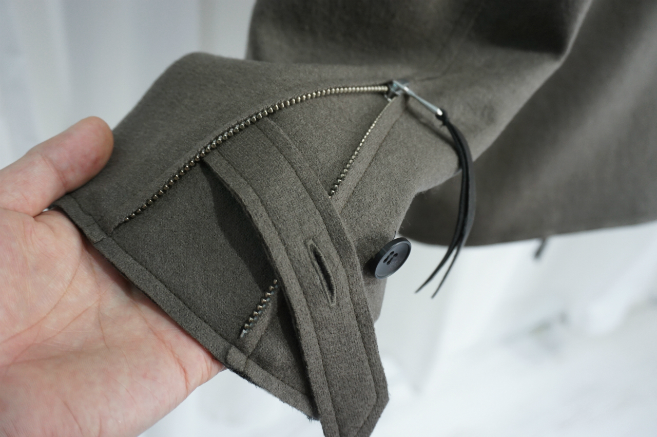 ボタンとファスナーによる作用の実験は、フロントだけではなく袖にも及びます。
