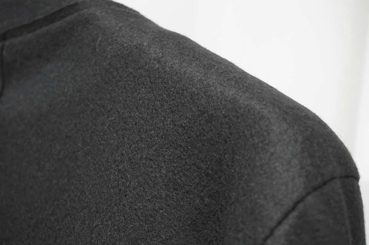 見た目はマットですが、近くに寄ると高級感のある微光沢。着ていてストレスのない重さです。