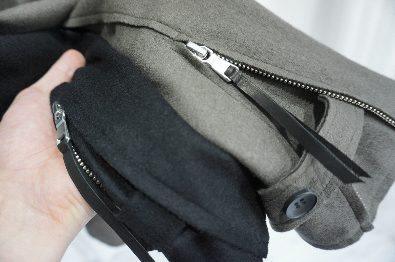 ボタンで留めることも、ファスナーで留めることも可能にしています。