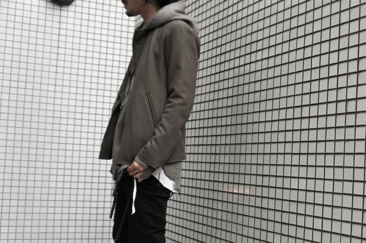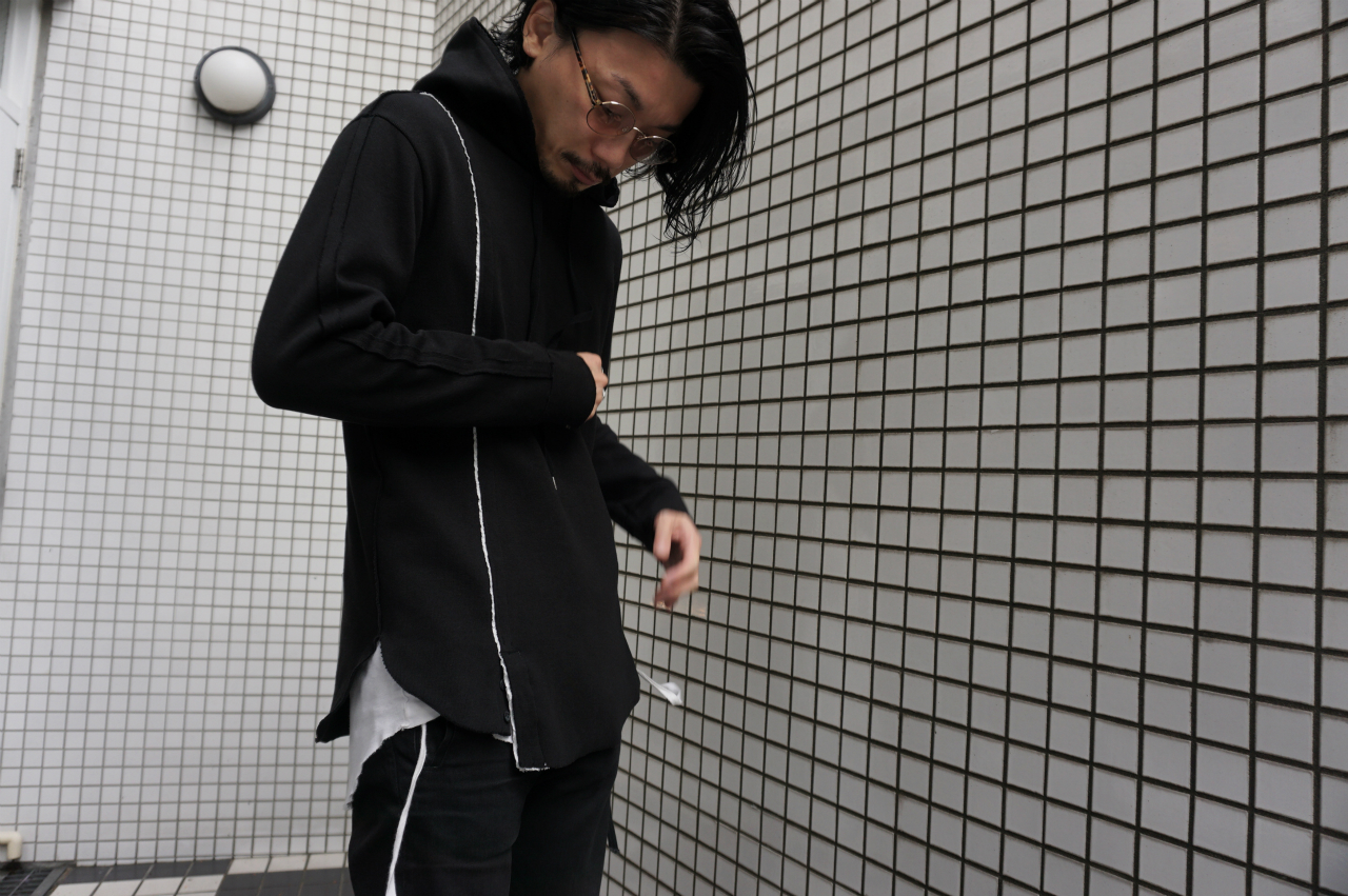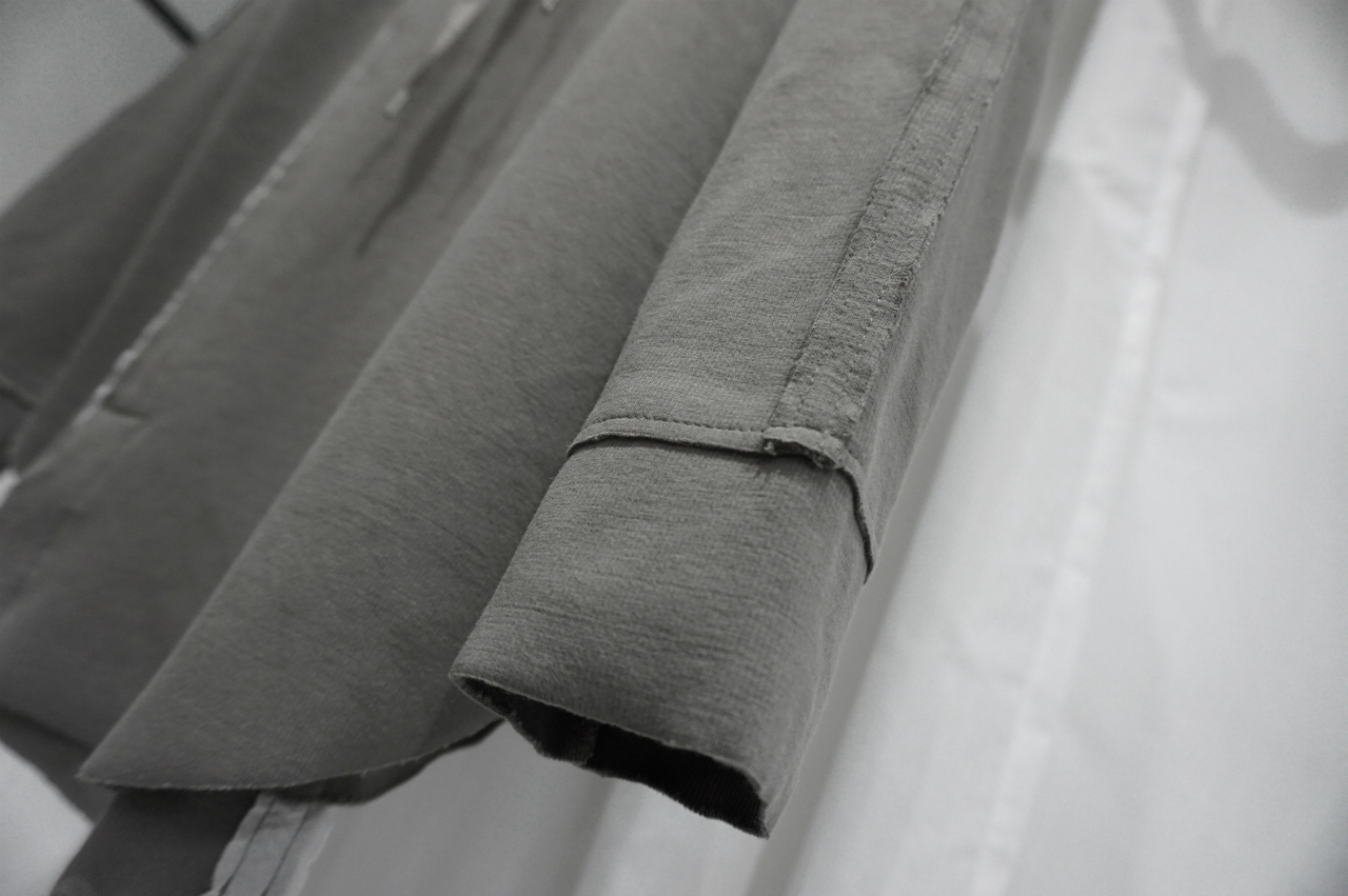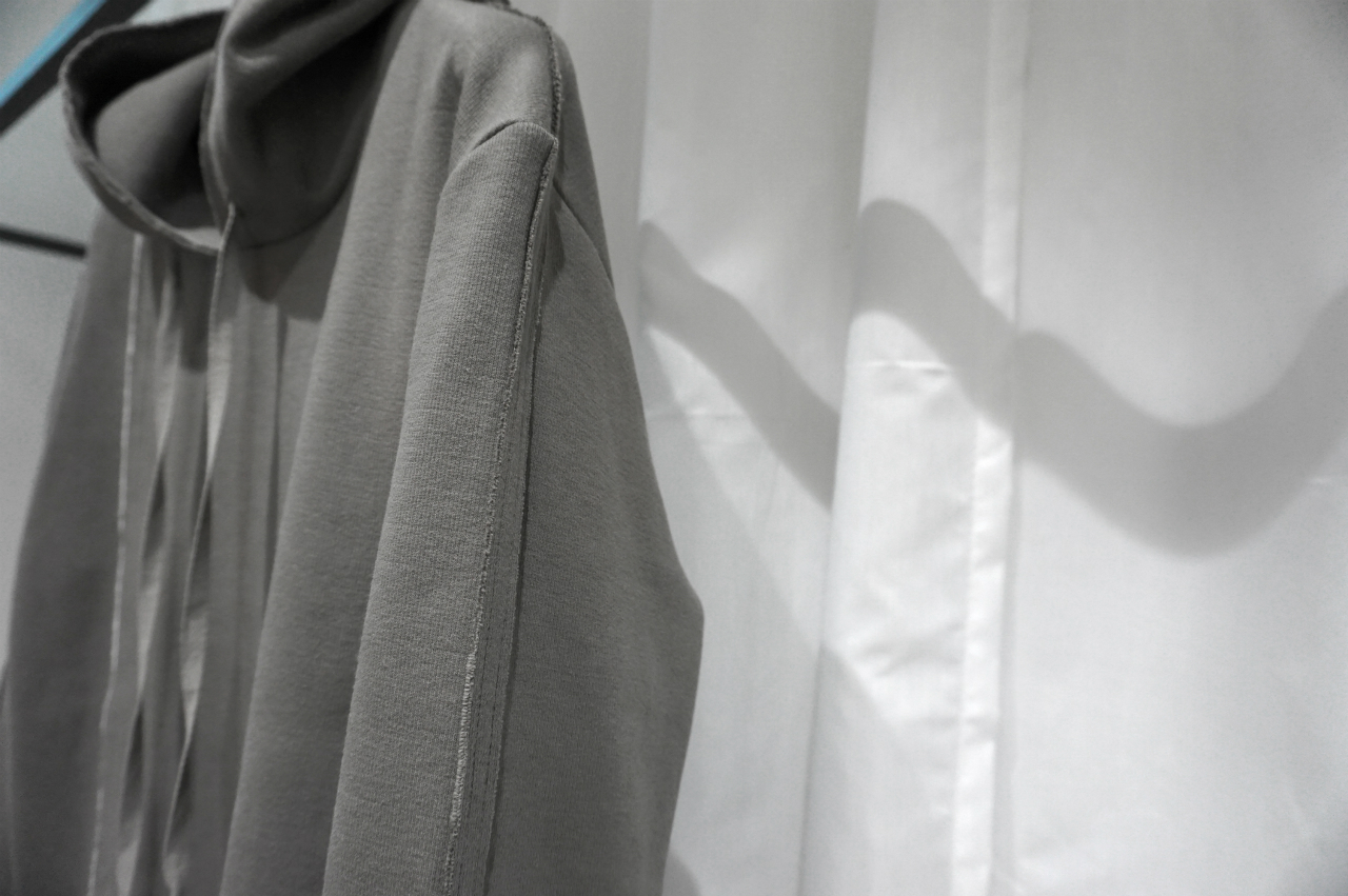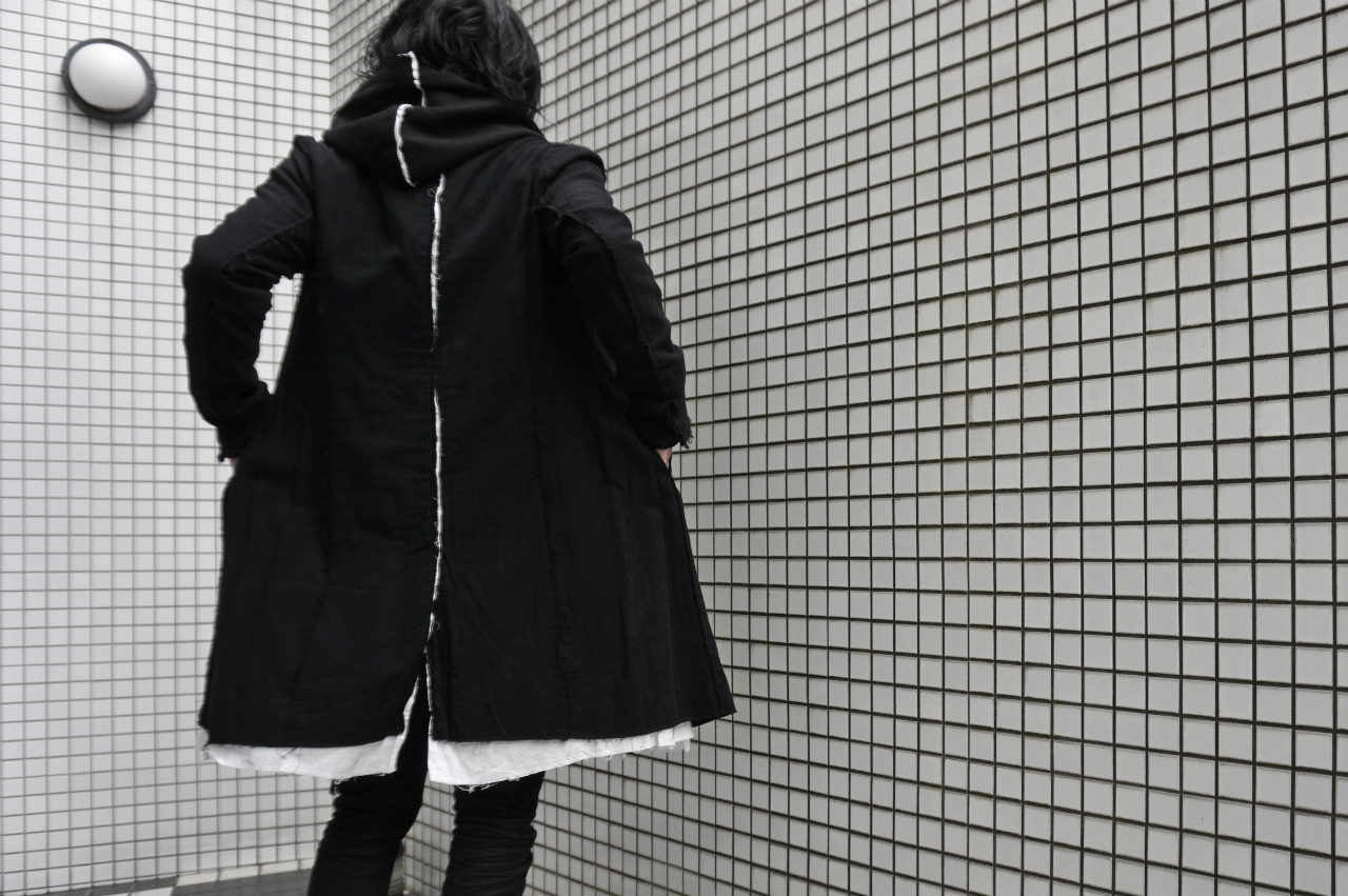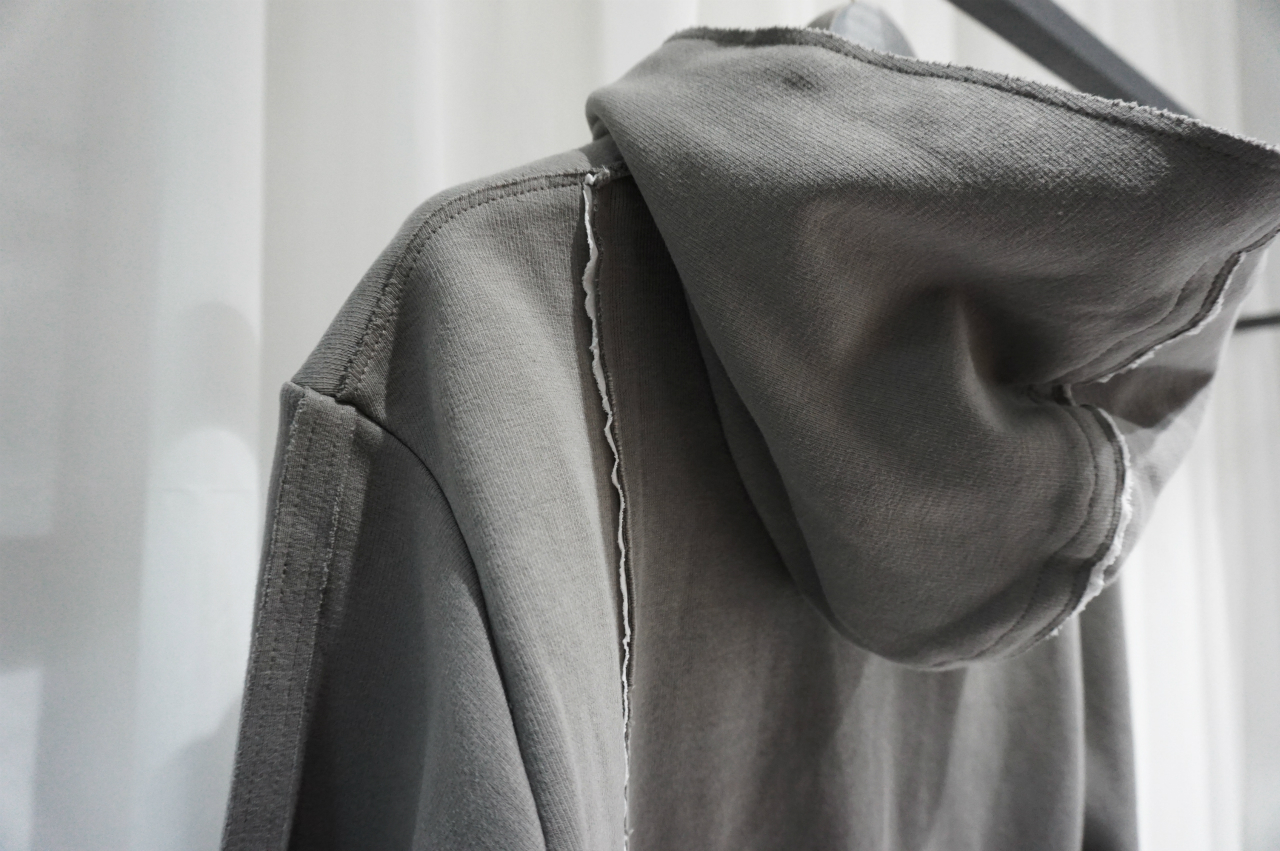 特にASKYYの服は世間一般的に、モードでドレッシーな括りにうつっていたとして(それは意図していませんが、)そういった要素を少しでも緩和してくれる緩和剤の役割がこのフード付き というところ。
