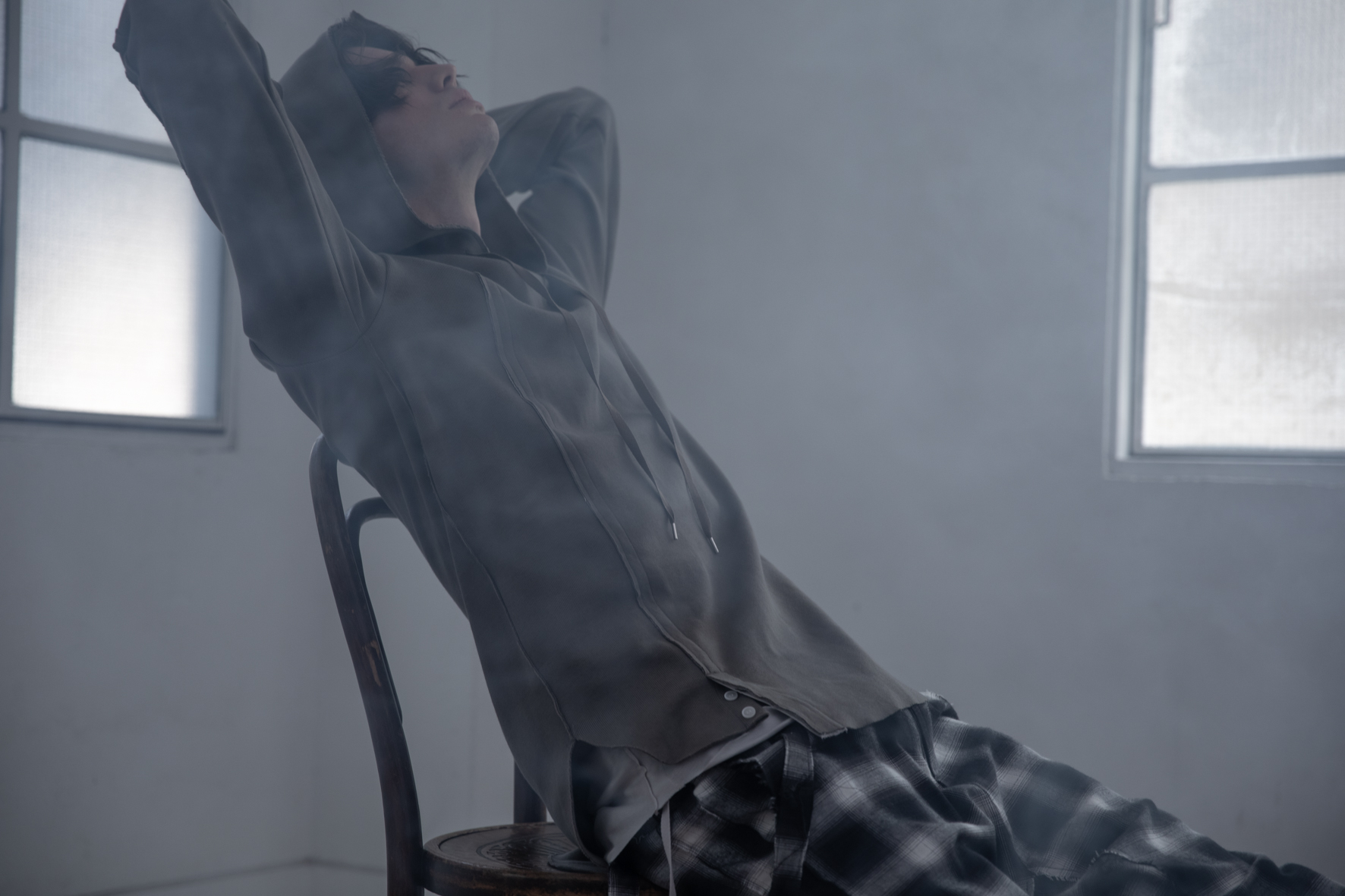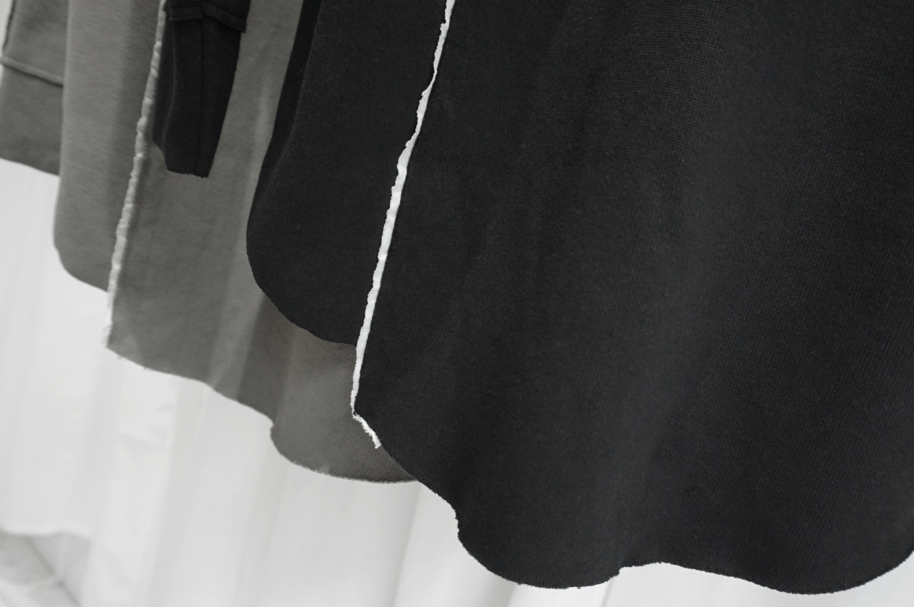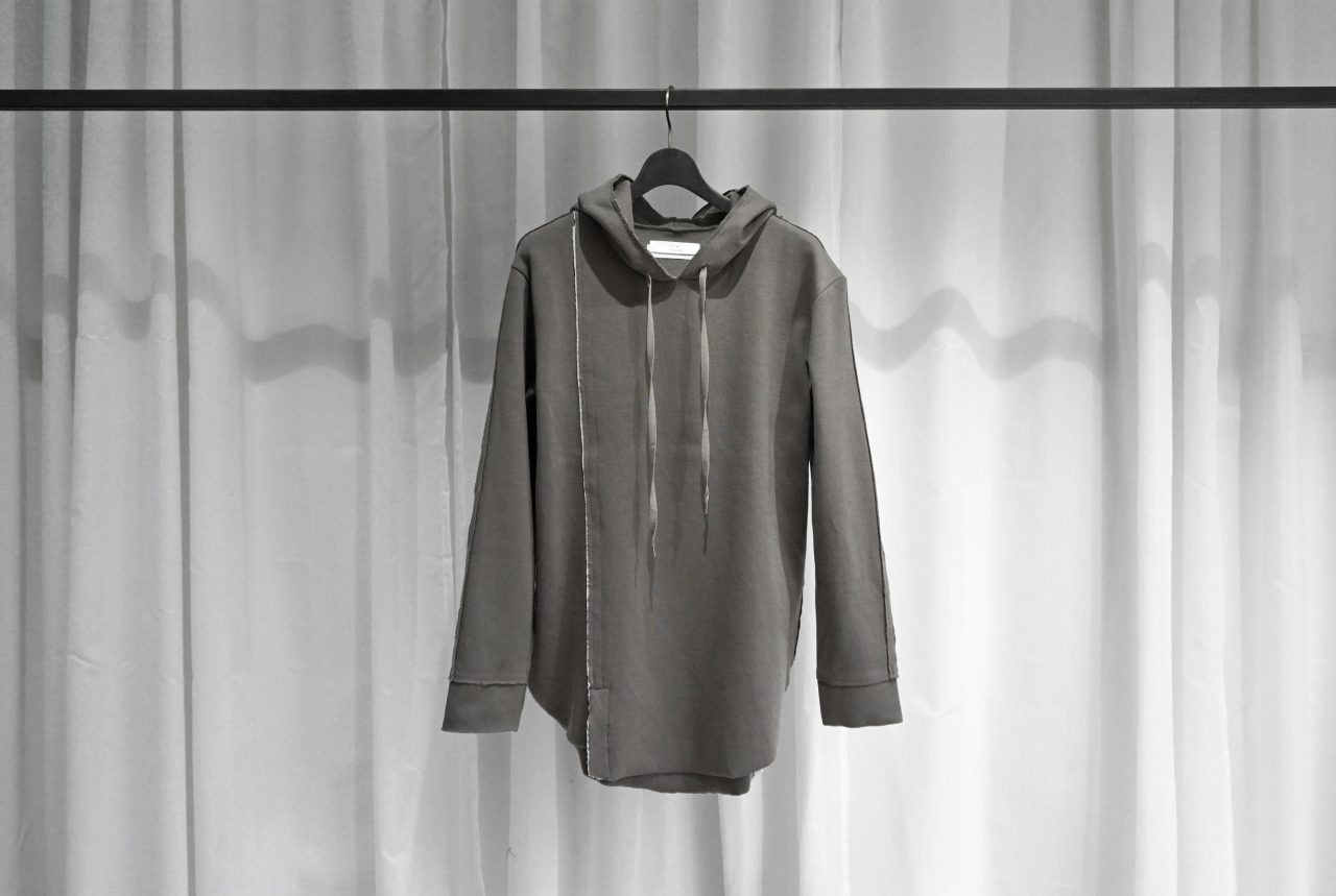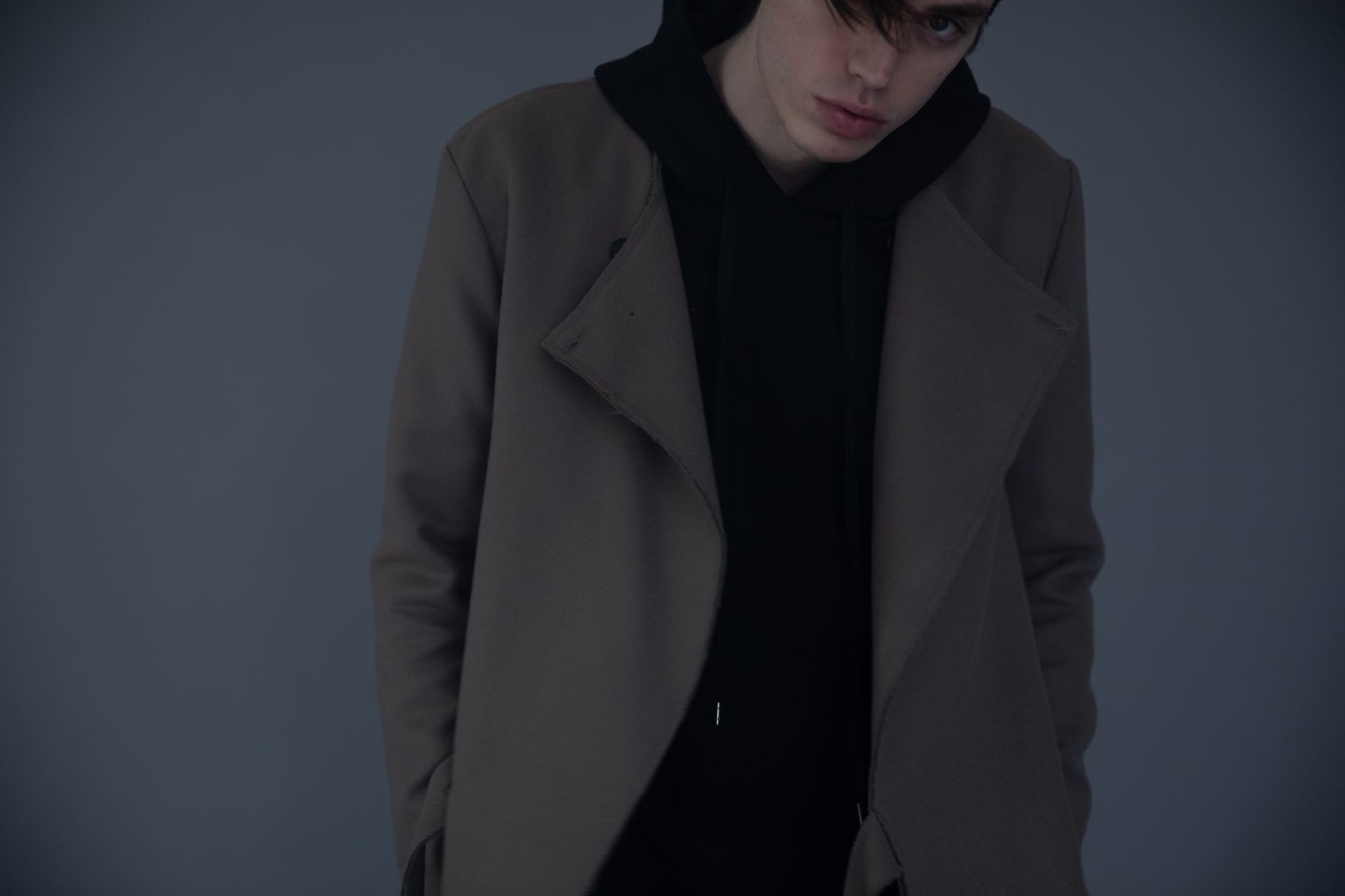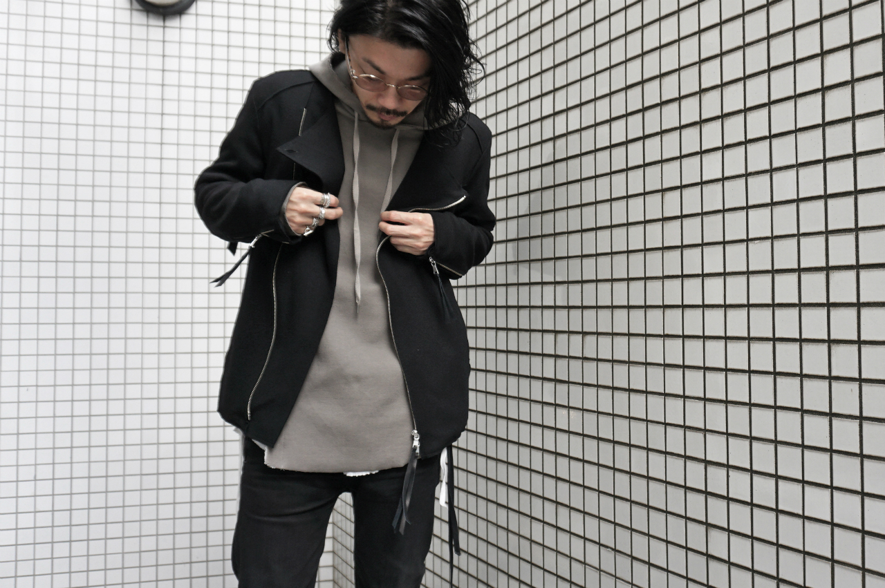 特にASKYYの服は世間一般的に、モードでドレッシーな括りにうつっていたとして(それは意図していませんが、)そういった要素を少しでも緩和してくれる緩和剤の役割がこのフード付き というところ。