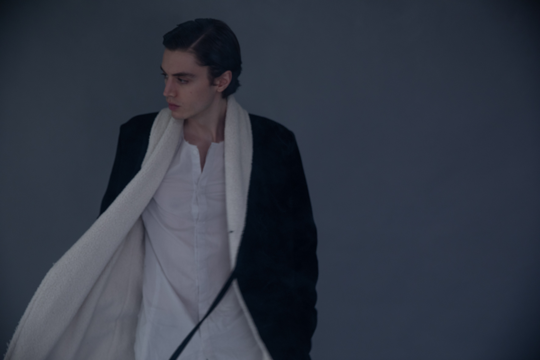 寒くなる首元を包み込む為に、ある程度の高さの勾配をつけショールカラーを採用。