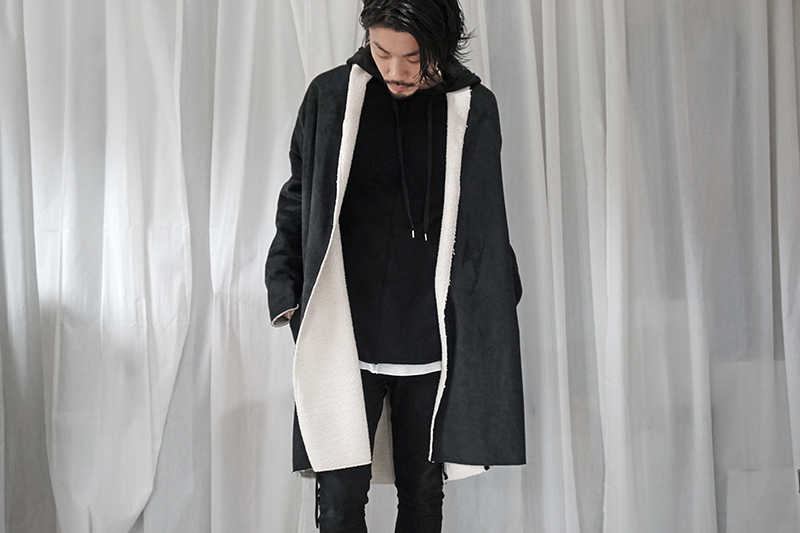 様々な方法で黒に対してのコントラストをつけてきましたが、例によってこのアイテムも表面に5mm程度ムートンが各部はみ出るようにしています。