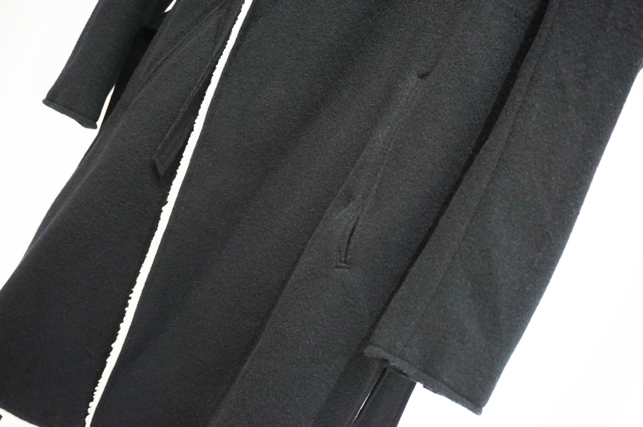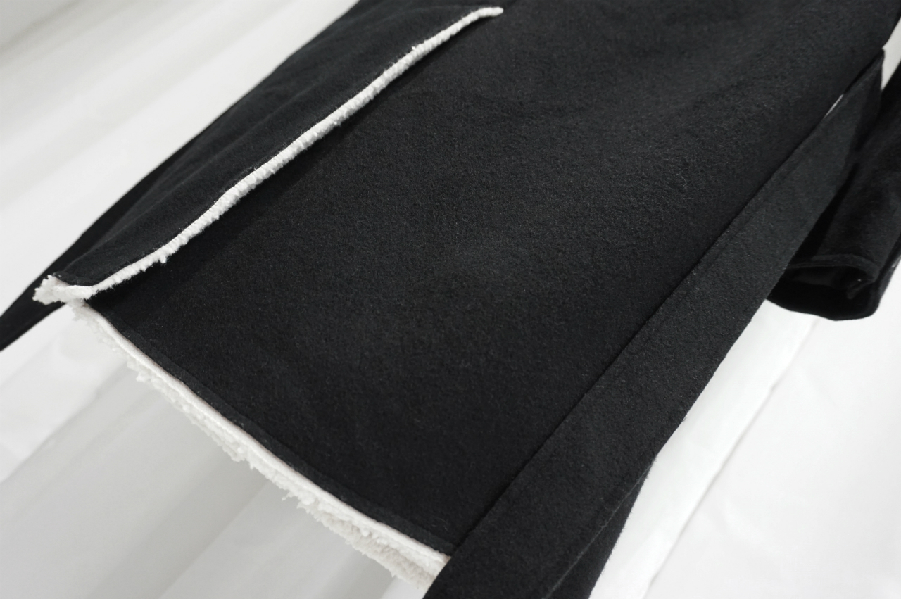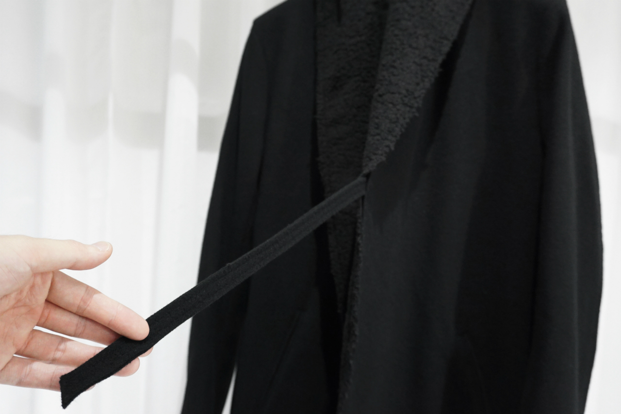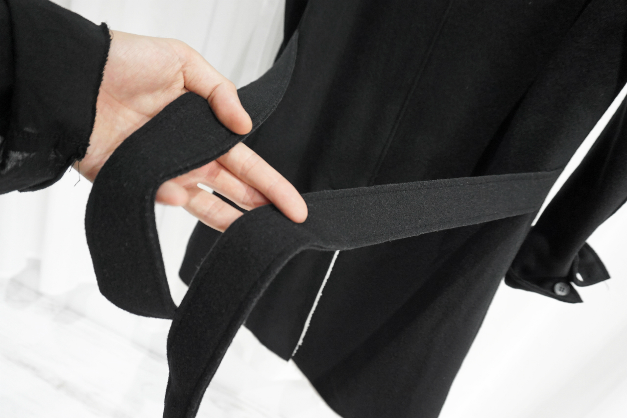 トレンチコートやわかりやすいところでいうとホテルにあるローブを思い出して頂ければわかりやすいかもですが、あの手の形状のコートの紐って結ぶのも面倒だし邪魔くさく感じることありませんか?