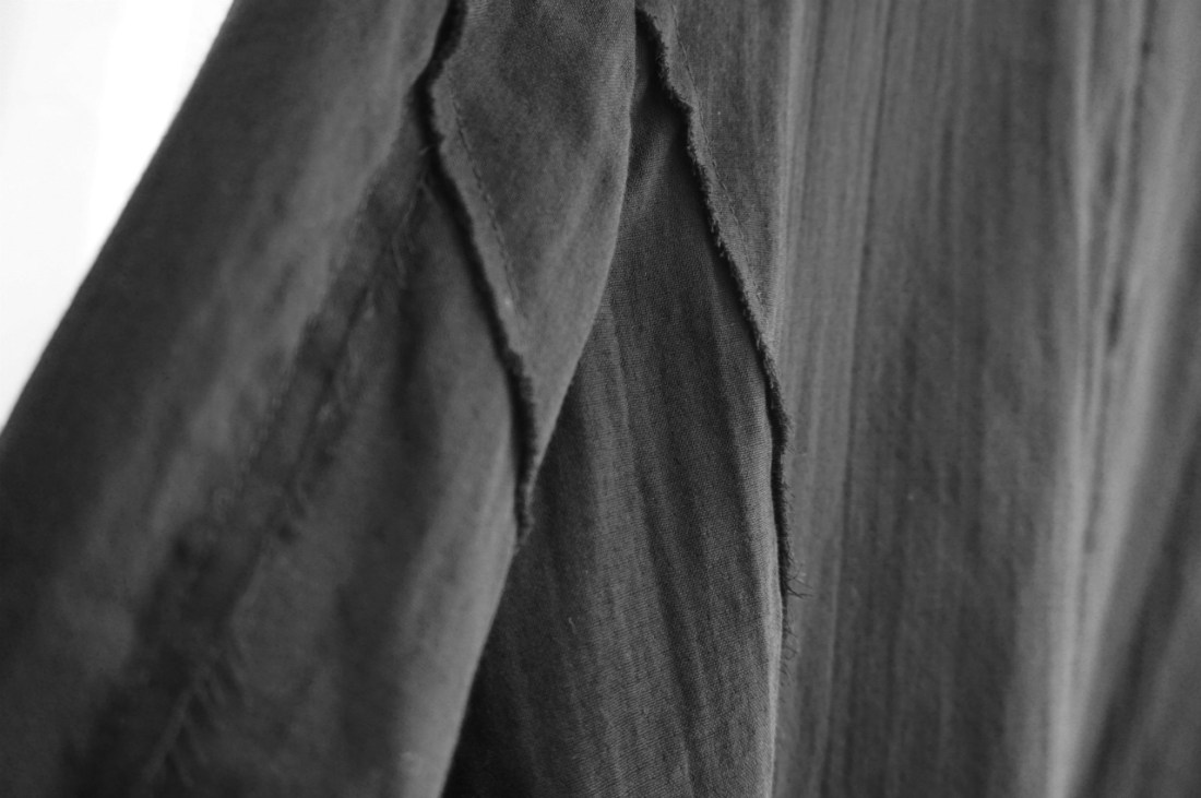 裁ち切りの裾からこぼれる糸の吹き出し。