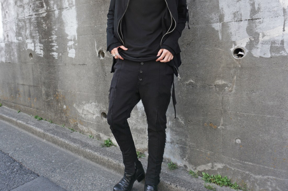 最近のASKYYのパンツではよく採用するギミックですが、これによって立体感が生まれるため、前から見たときのサルエル具合も緩和されますね。
