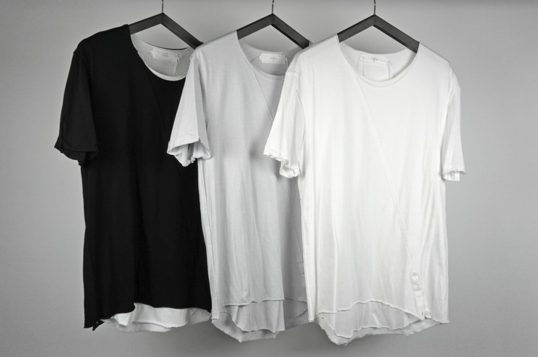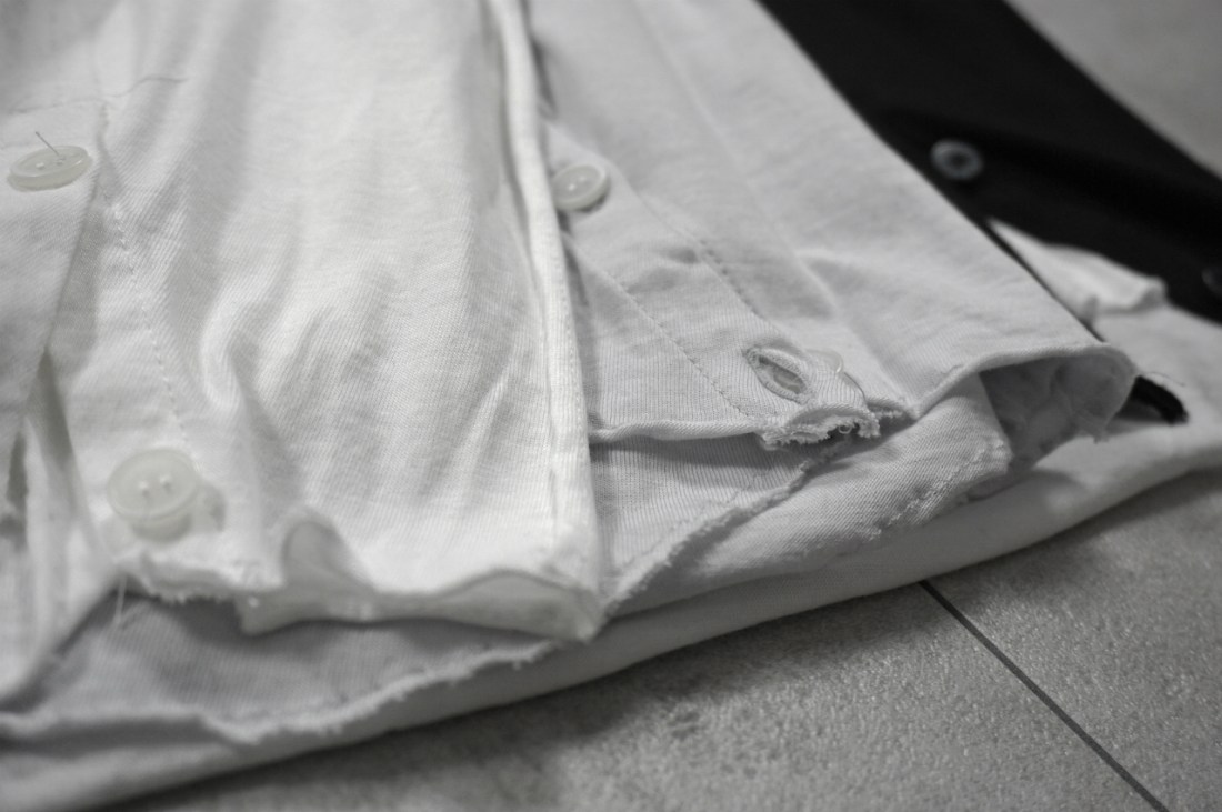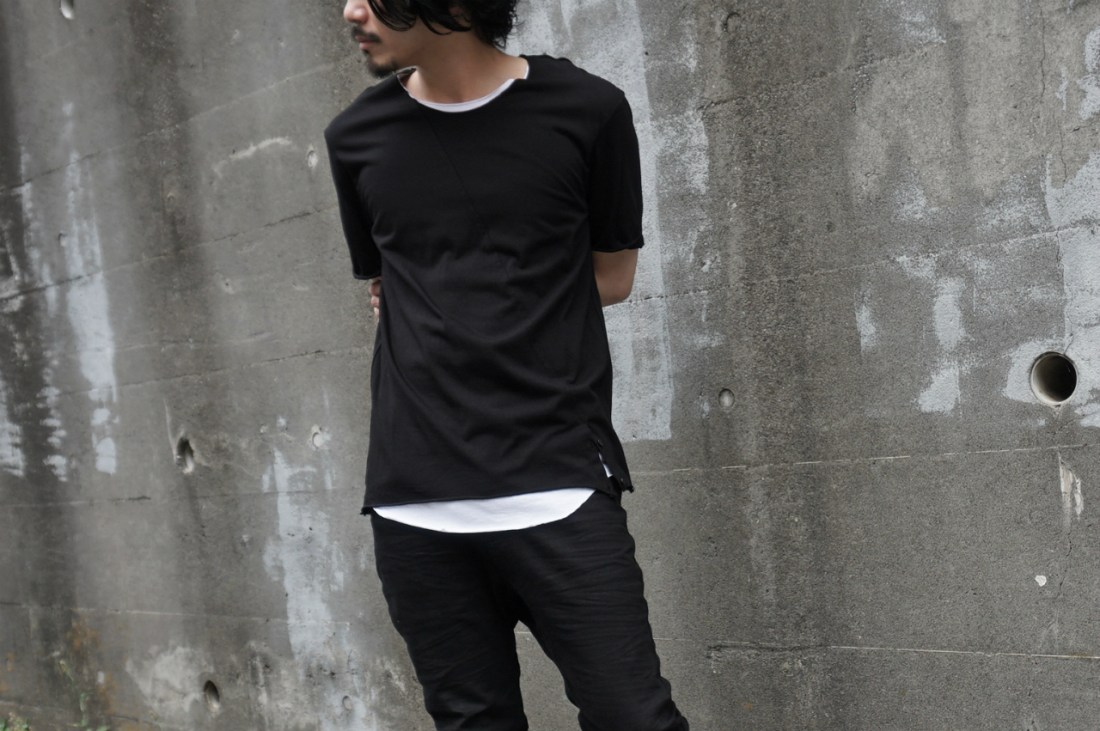いつかの秋冬でSLASH KNIT という作品をリリースしていますが、あの効果をカットソーに混血させました。雑種ではなくサラブレッド。