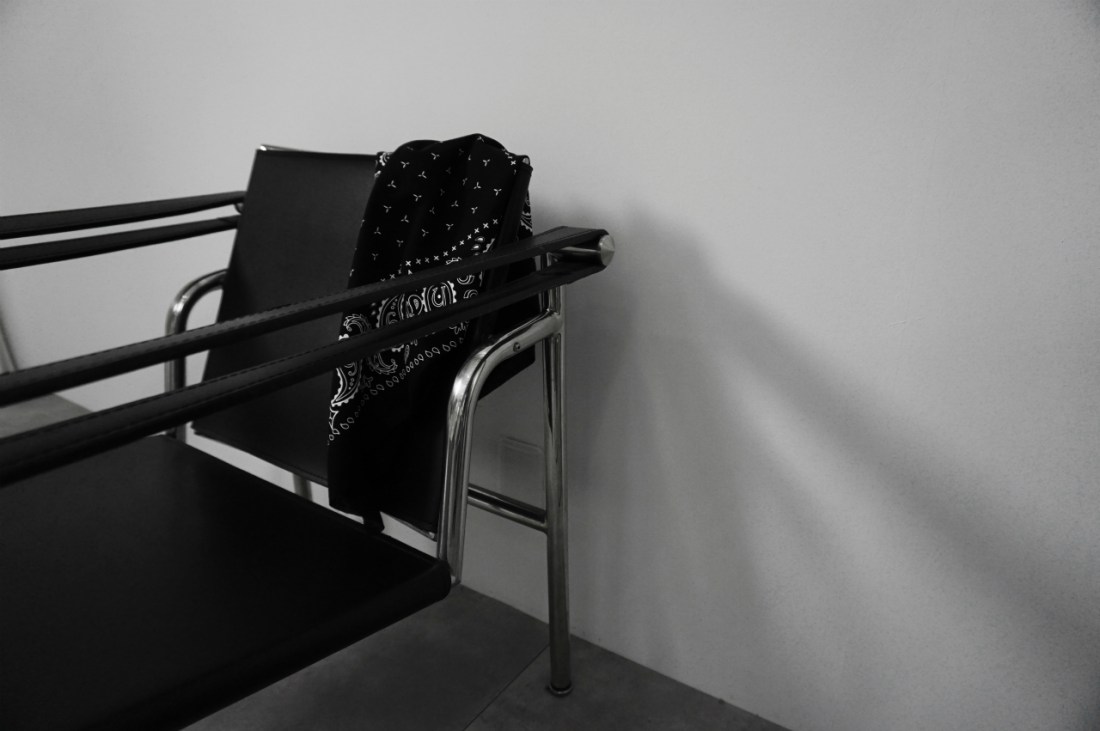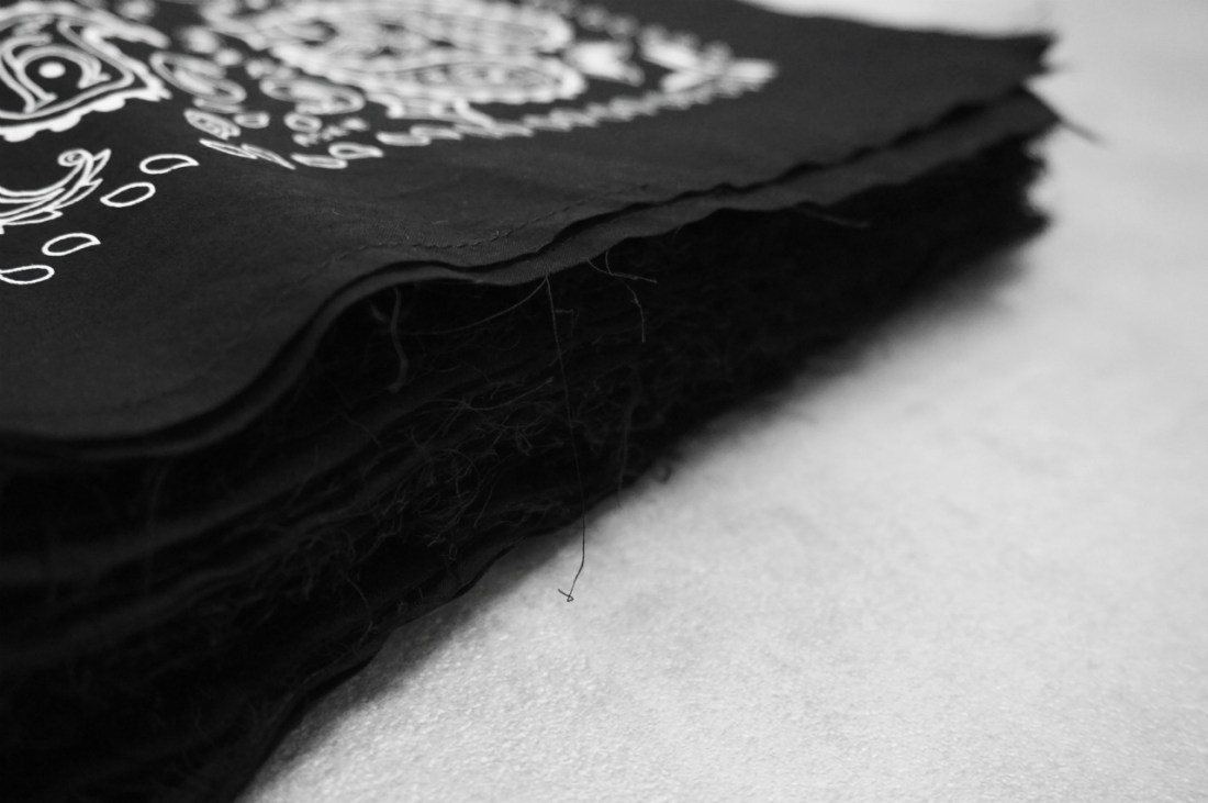 バンダナを作るにあたって古着屋を何件も周り、柄や素材を研究しましたが基本はどれもベーシック。ヴィンテージにはない、差別化の出来るデティールを与えたかったこともあり、ざっくり切ってステッチでたたいています。