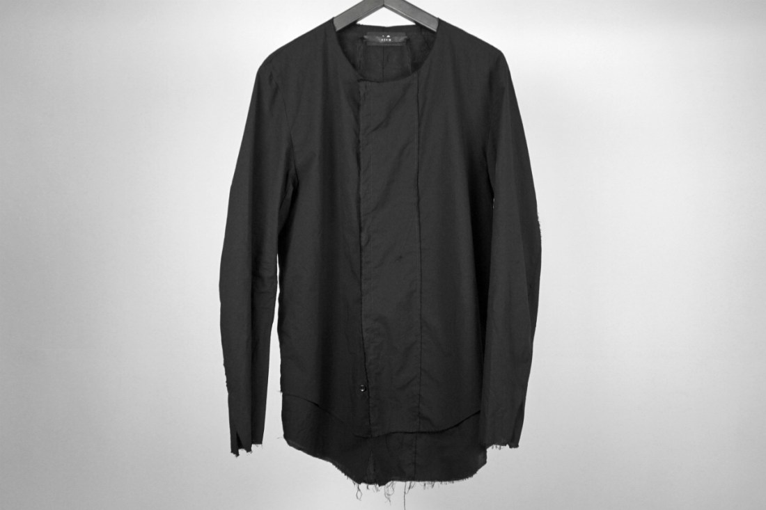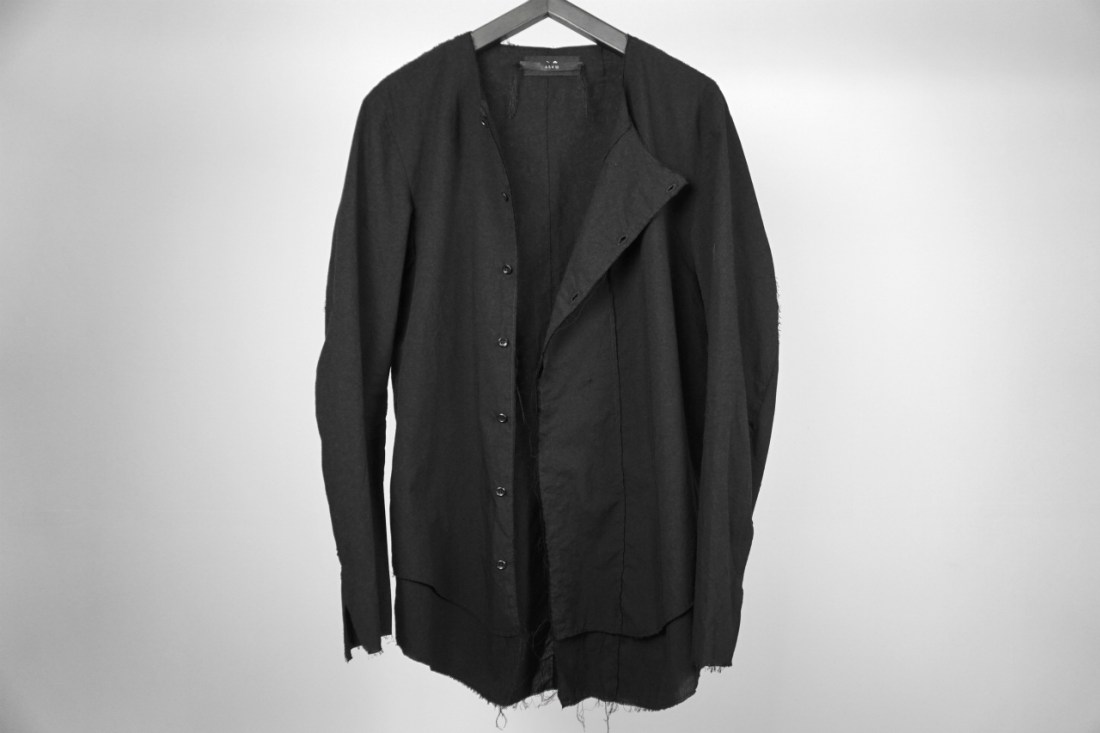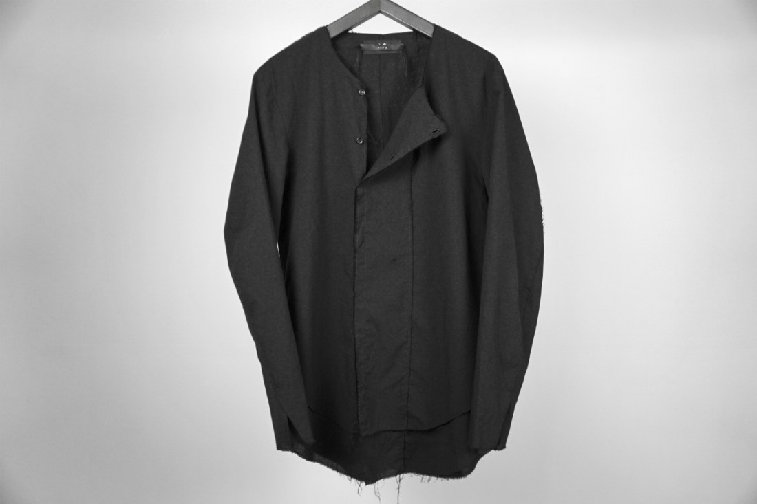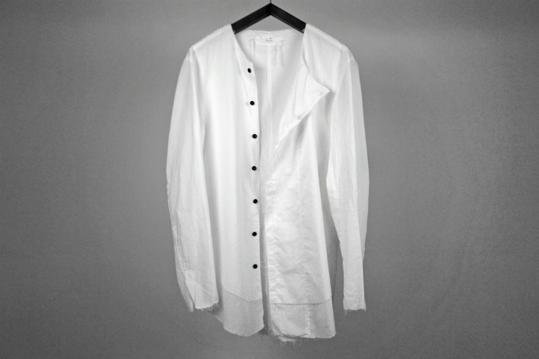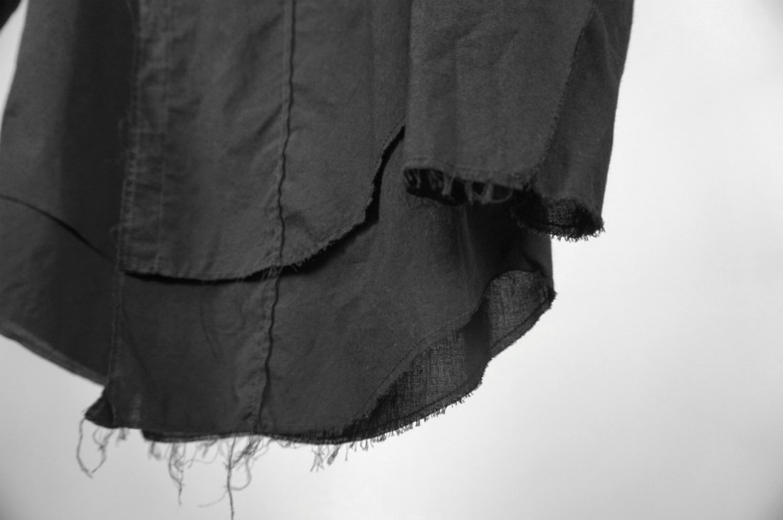 アシメのフロントは前を開けて着用した時、その意味を大きく果たします。つまりシャツから ”羽織物” に化ける付加価値。