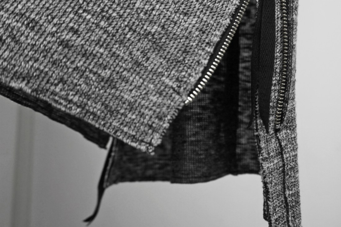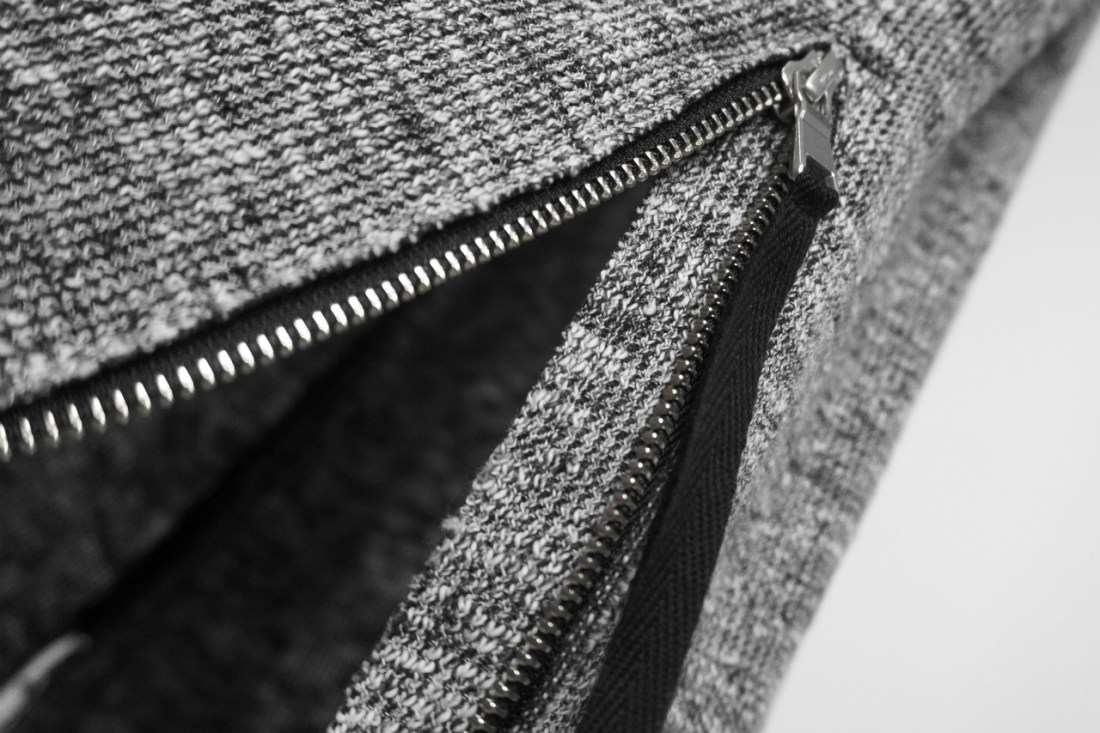 ジップのデザインを生かし、前後いずれもフラットに仕上げ段違いにしています。