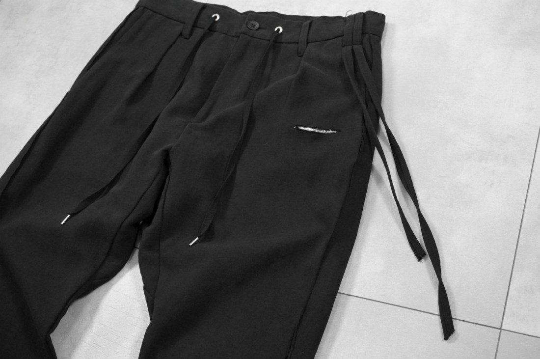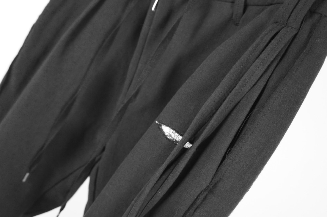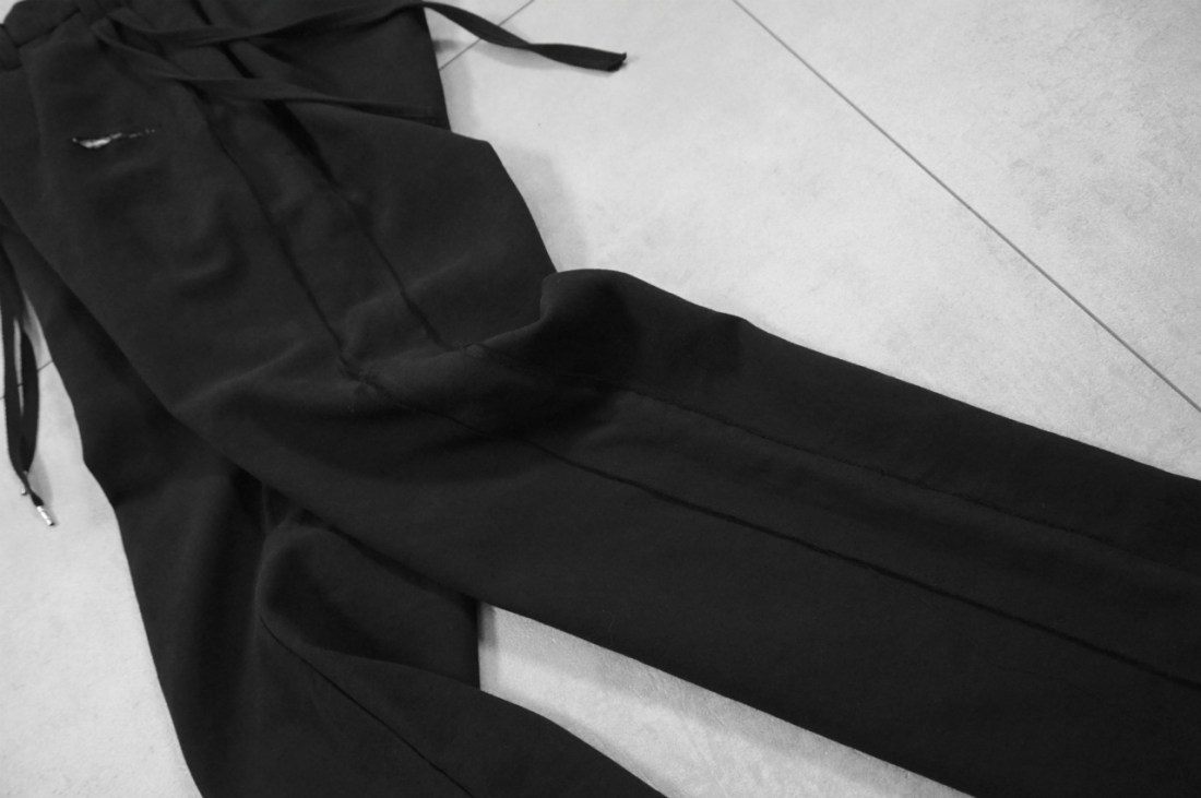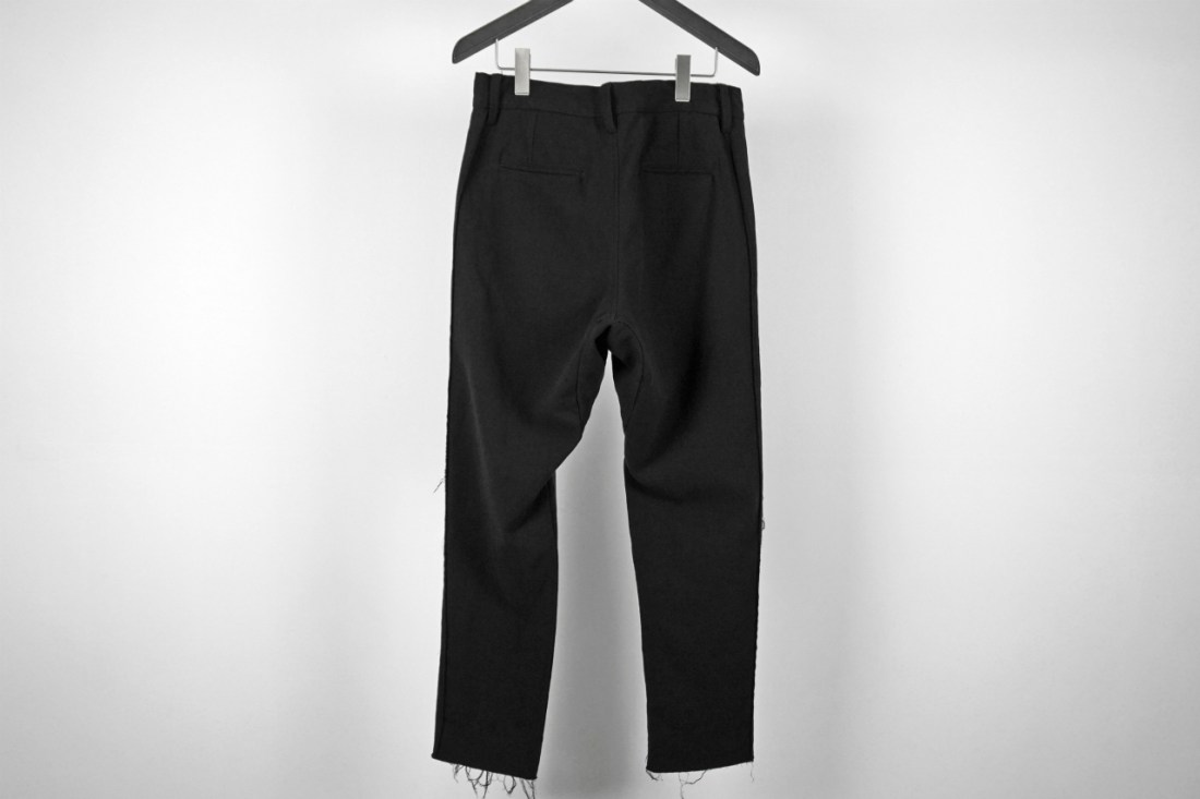 ジャケットのラペル同様、テーパードしたパンツに側章を後付けしたようなデザイン。わざわざな手間をかけました。