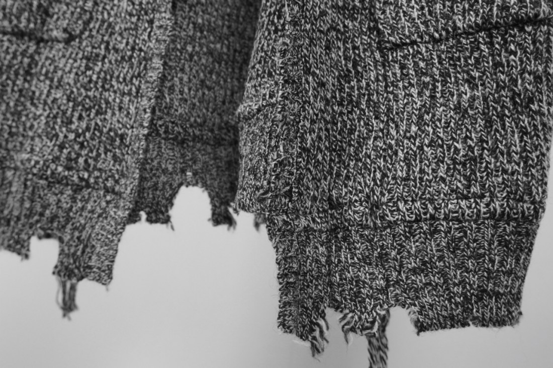 仮に編み込まれたニットをリメイクすると永遠に糸がほどけてダメになりますので編みの時点で形成しました。