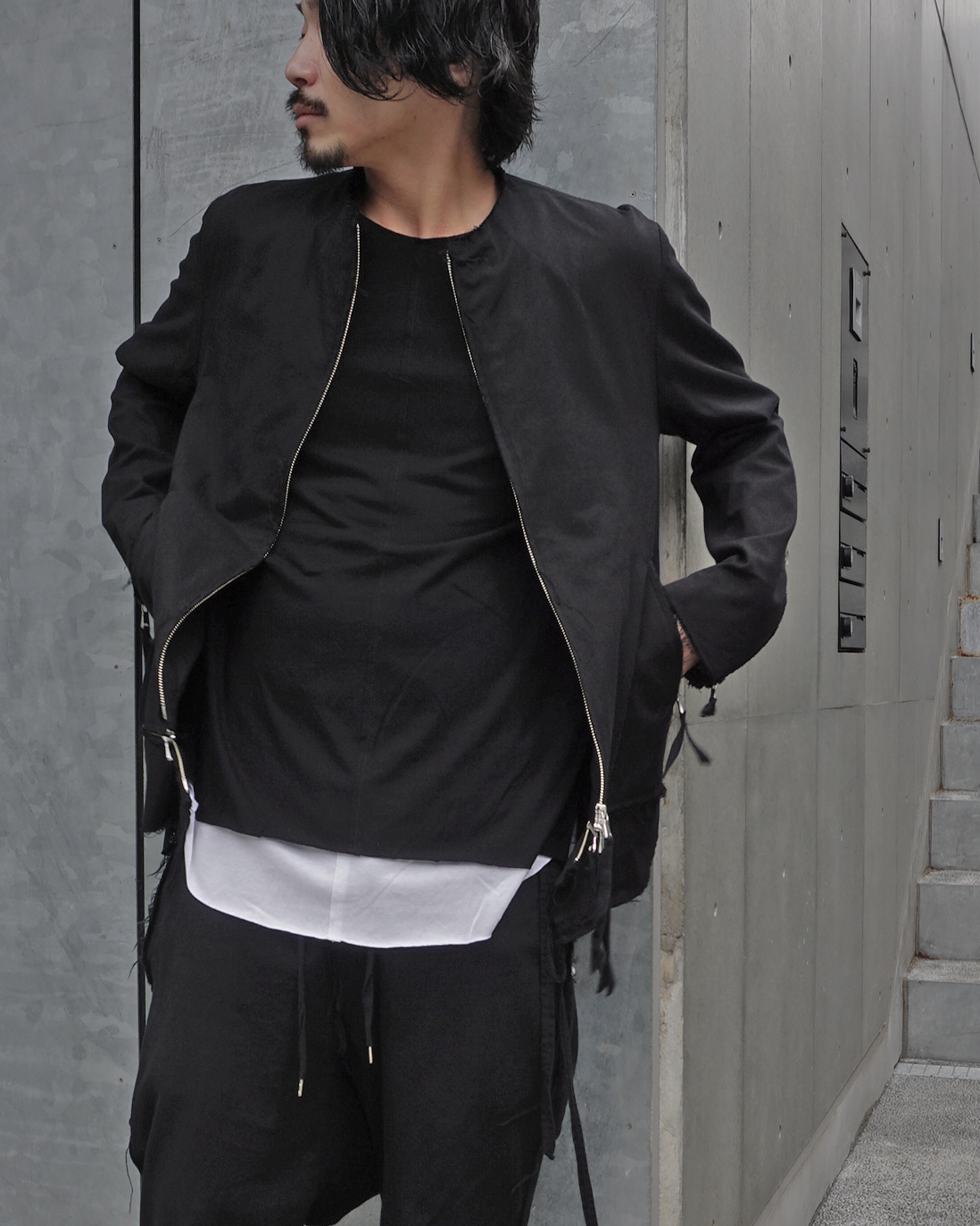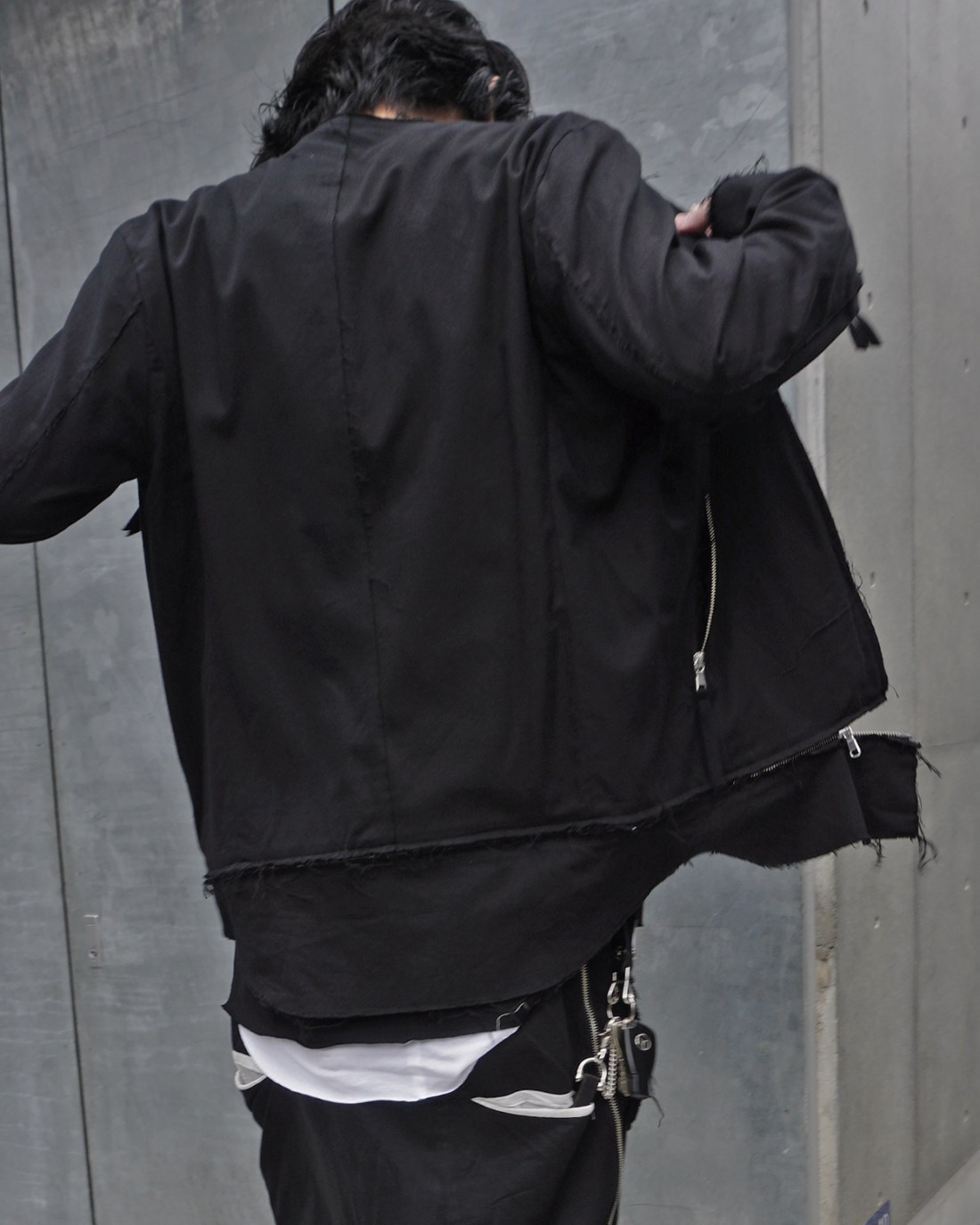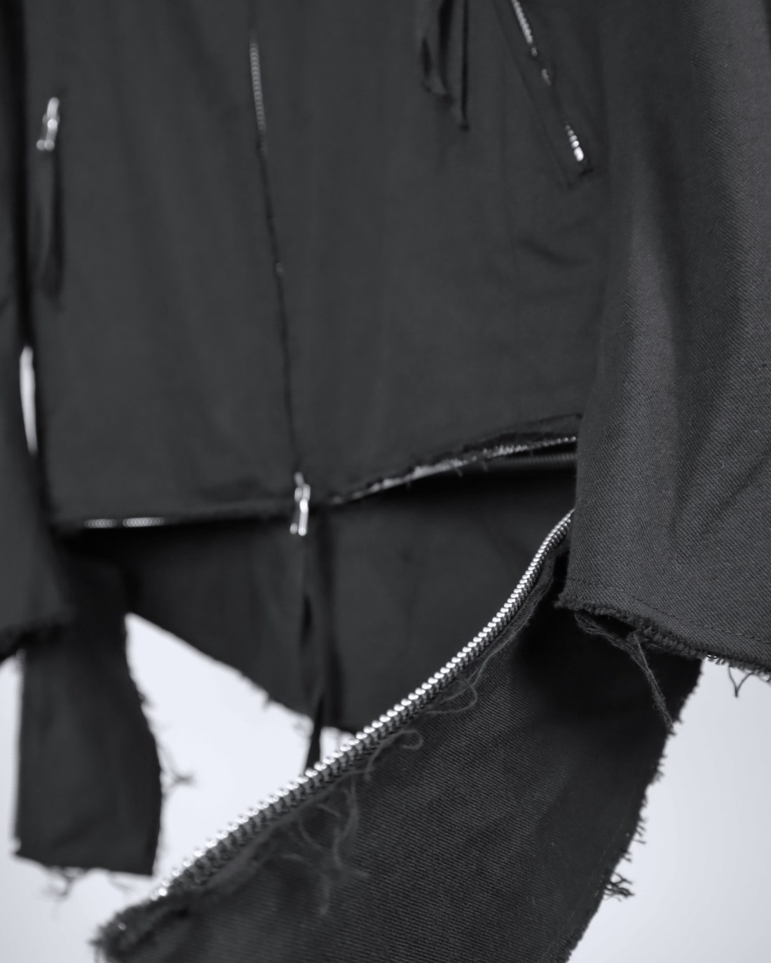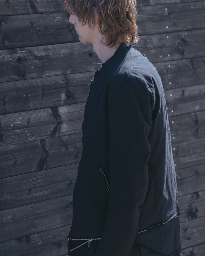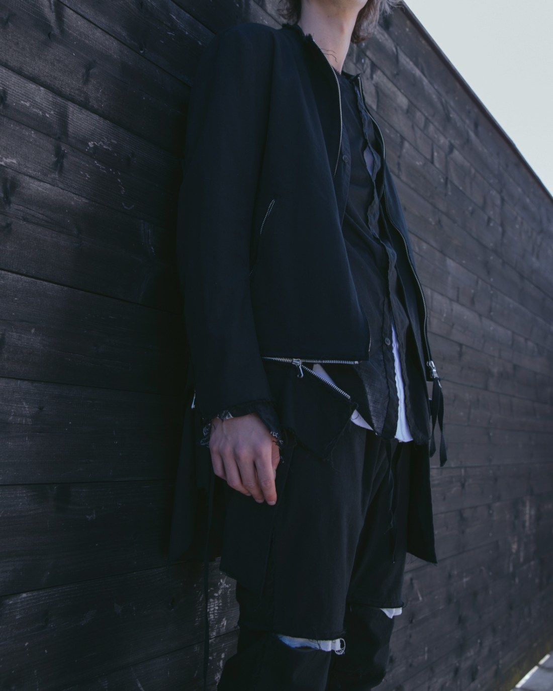 ジップをフロント側へ大胆に打ち出しつつ、開くことで構築的なスタイリングを可能にしたモデル。