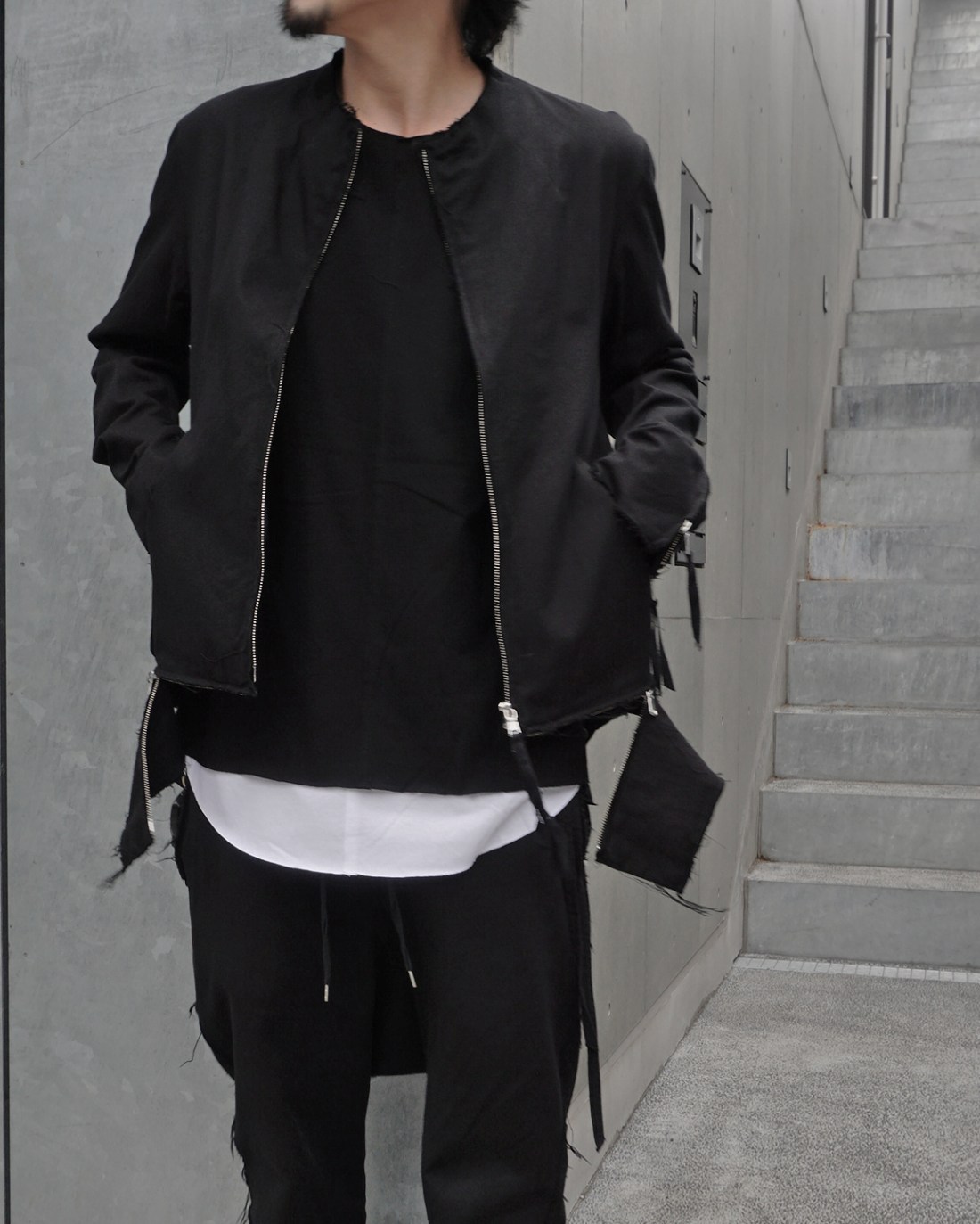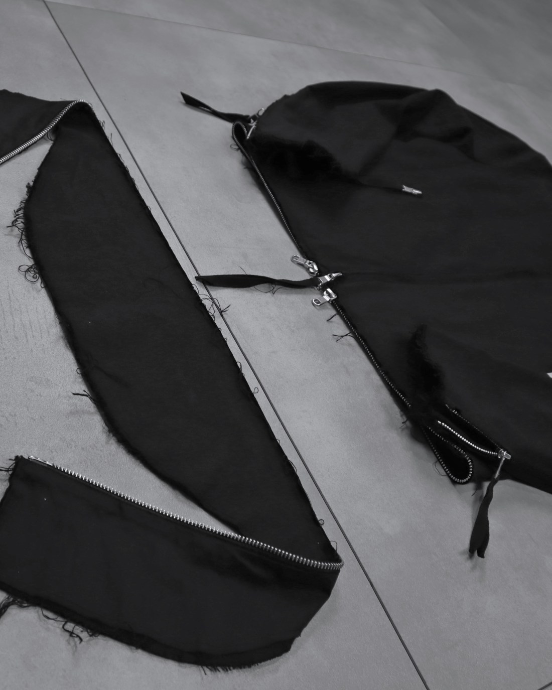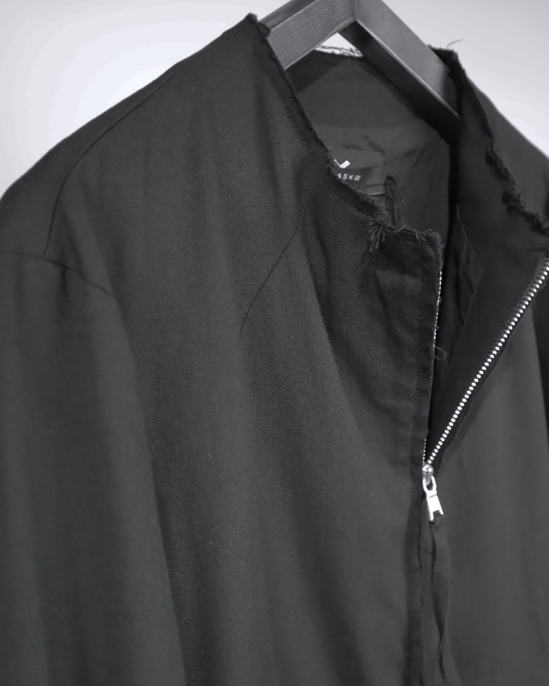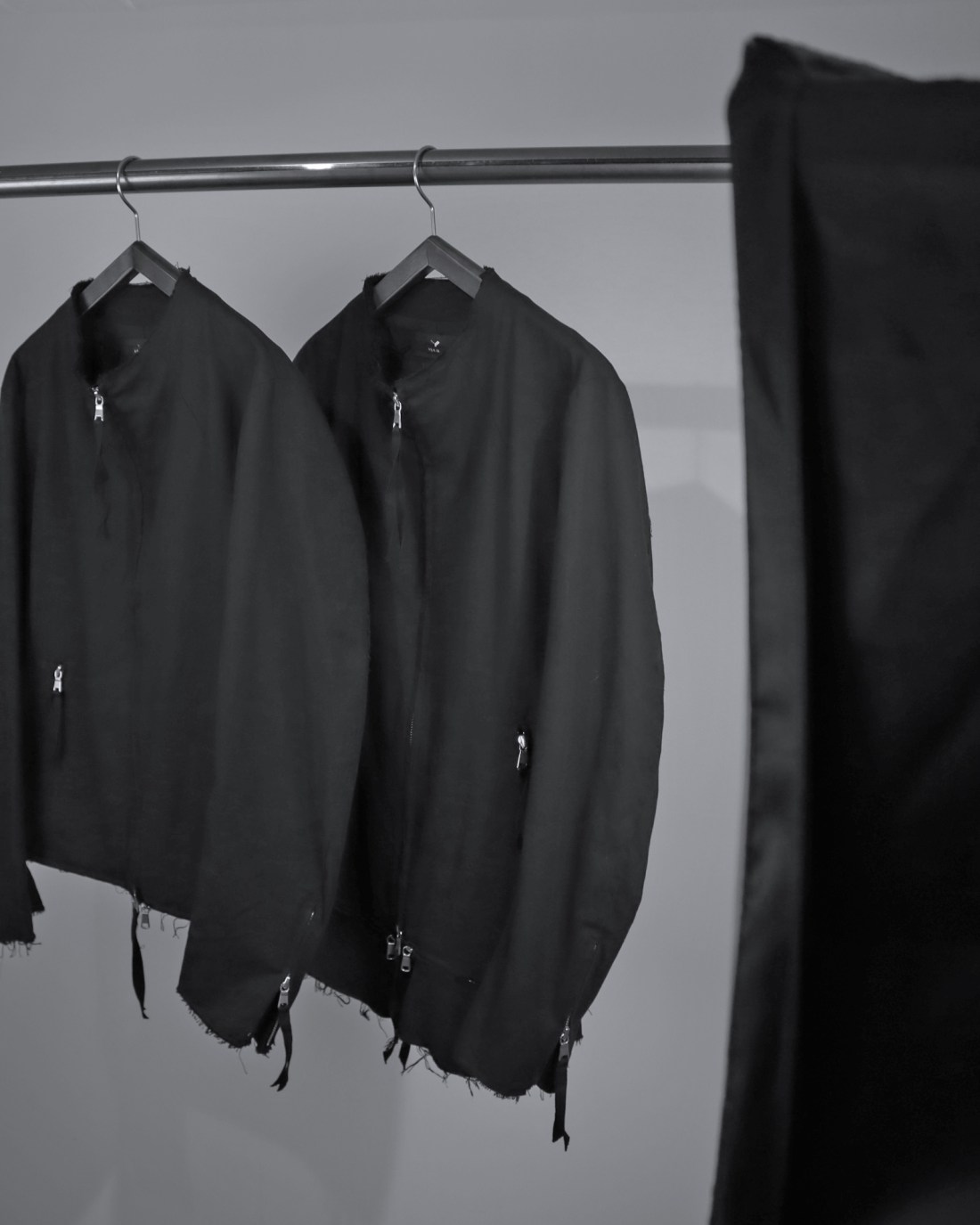 ジップをフロント側へ大胆に打ち出しつつ、開くことで構築的なスタイリングを可能にしたモデル。