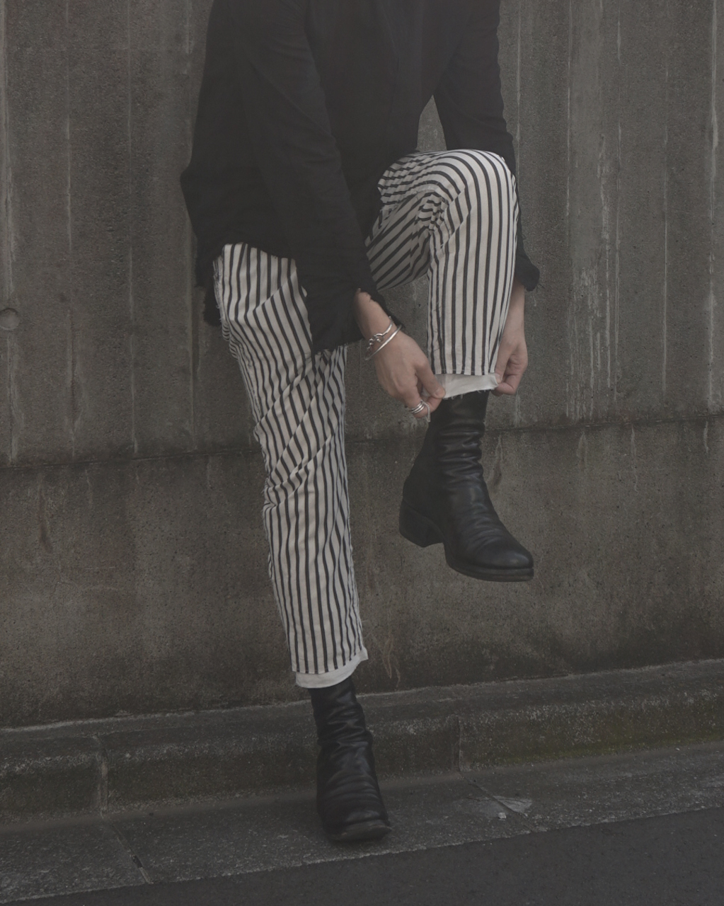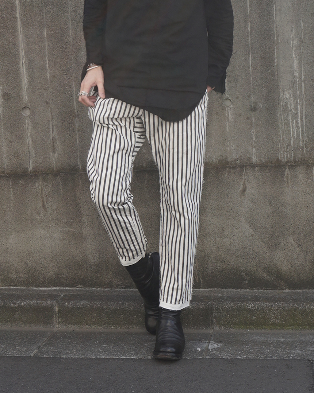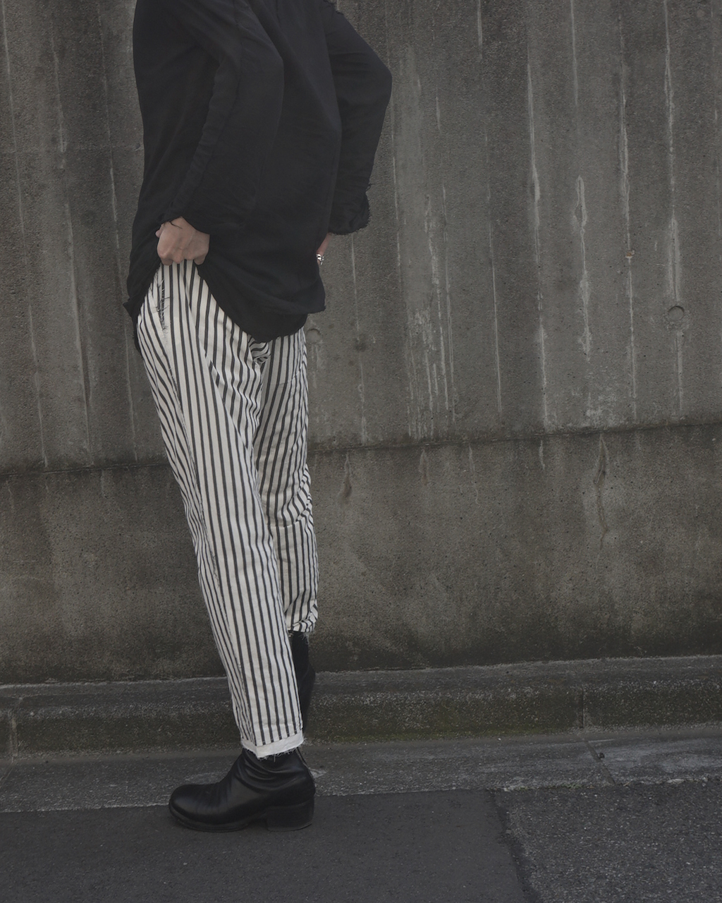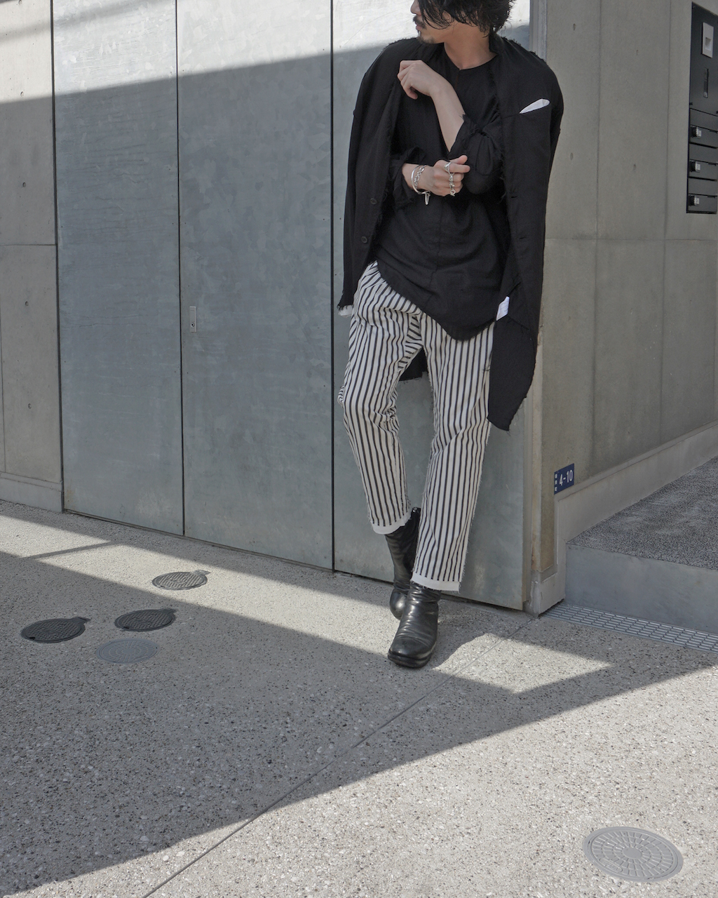 ややルーズなアンクル丈を選択することで、本来ストライプがもつ優等生感を離脱させています。