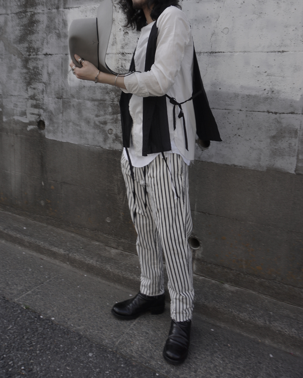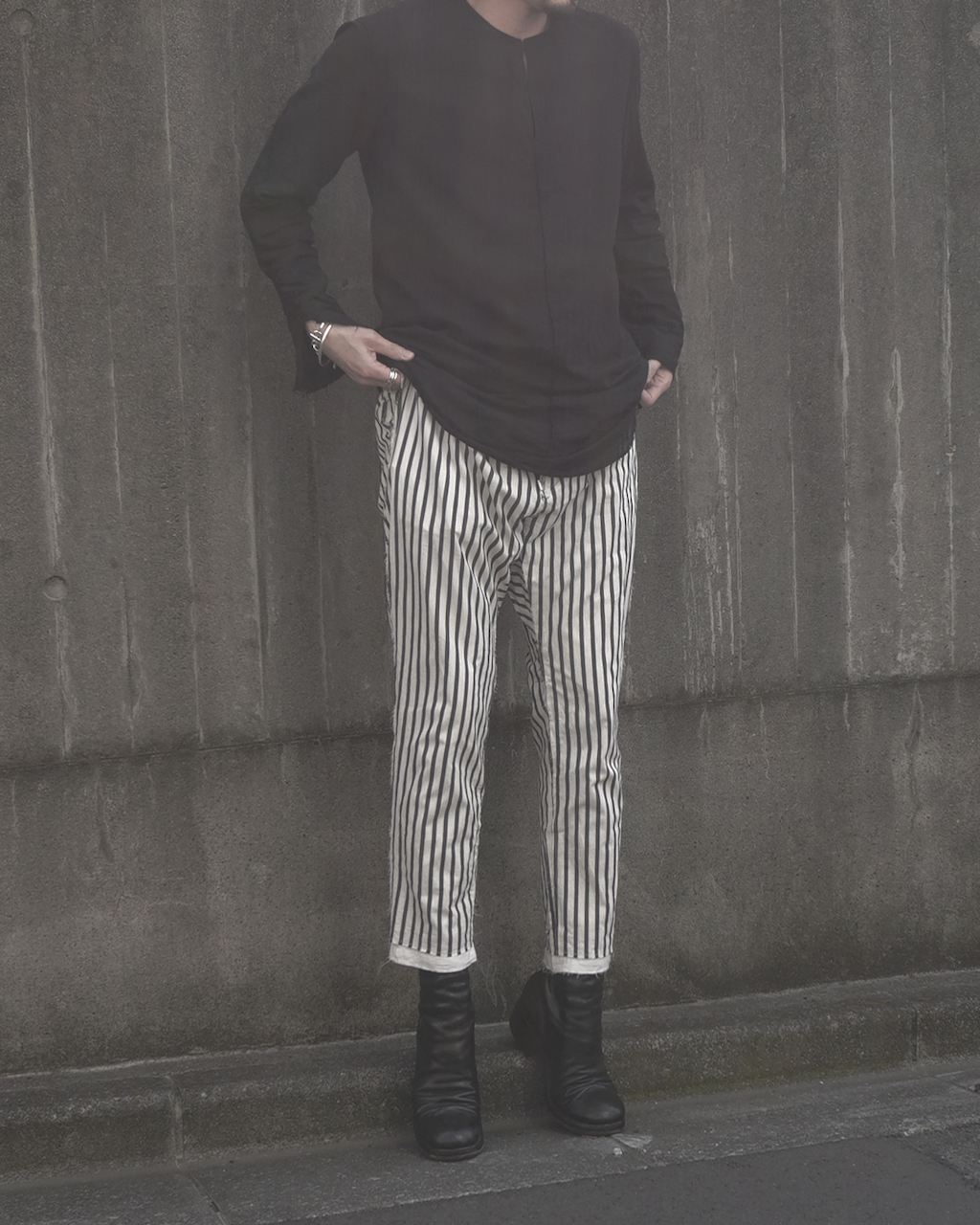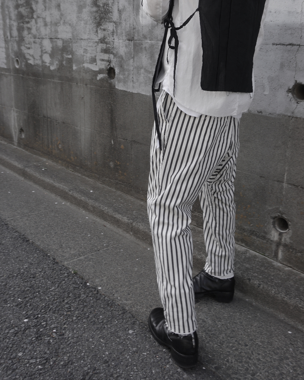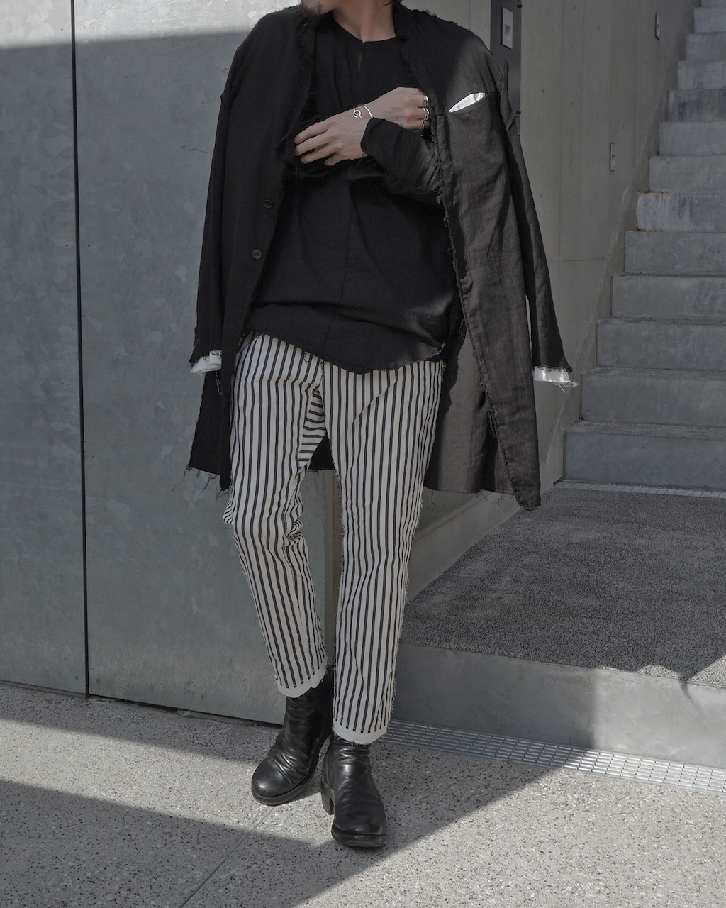 ややルーズなアンクル丈を選択することで、本来ストライプがもつ優等生感を離脱させています。