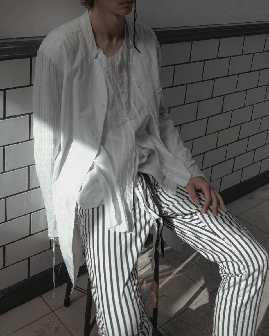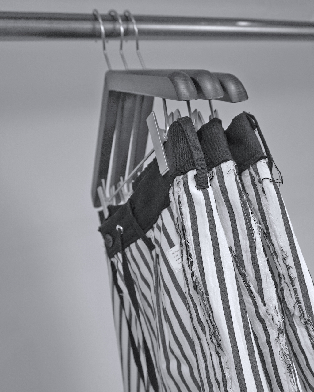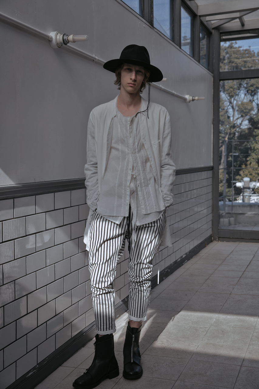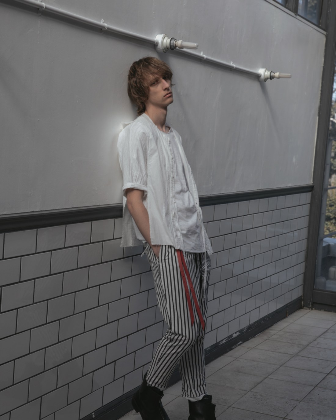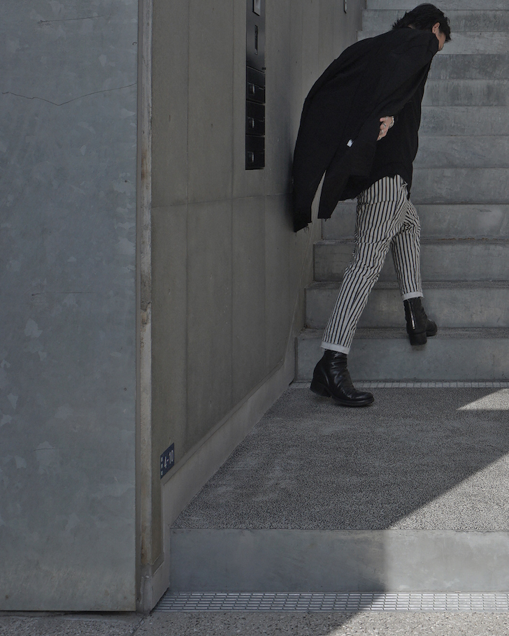 ややルーズなアンクル丈を選択することで、本来ストライプがもつ優等生感を離脱させています。