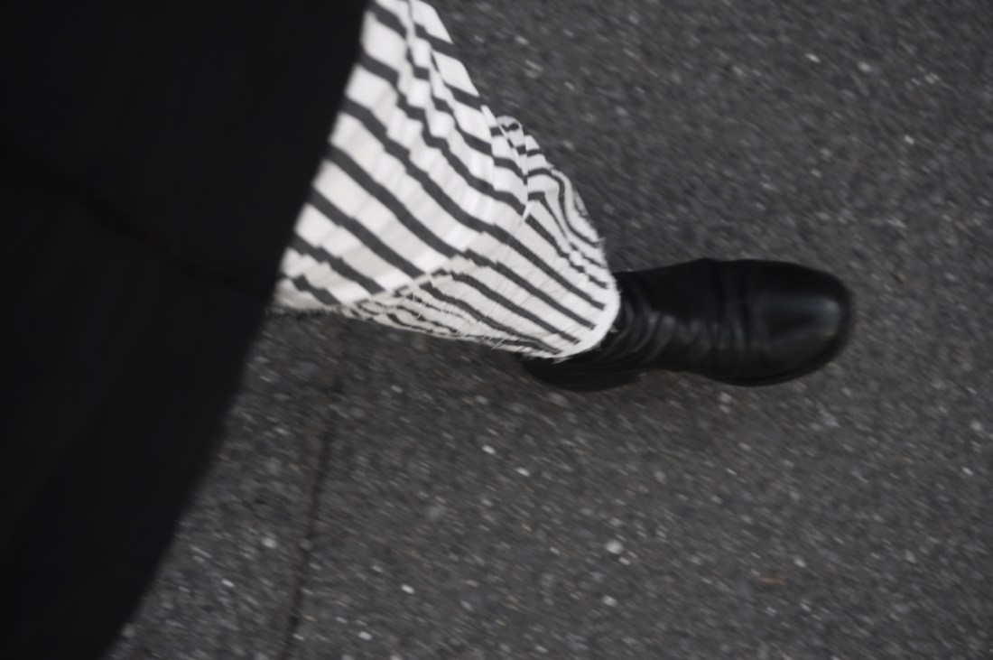 ストライプ柄を緩和しつつ、しっかり足元も引き立てる。