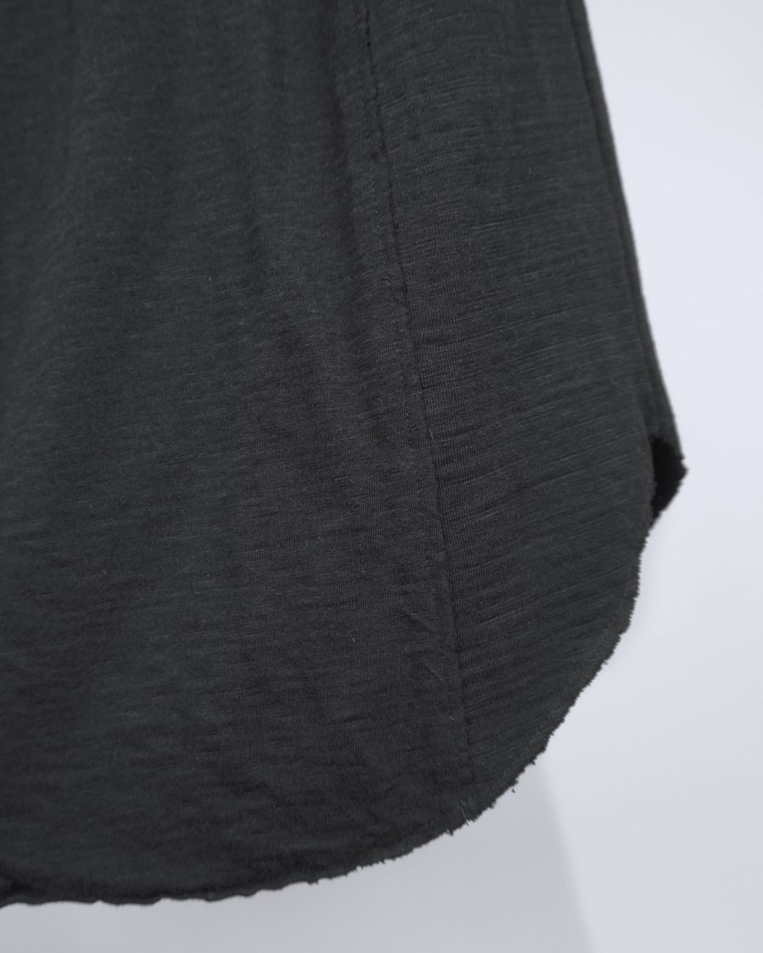 インナーにタンクなど、お決まりのレイヤードもしやすい着丈とカーブ具合かと思います。