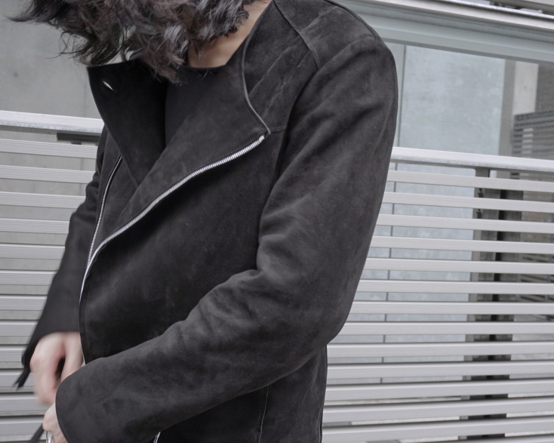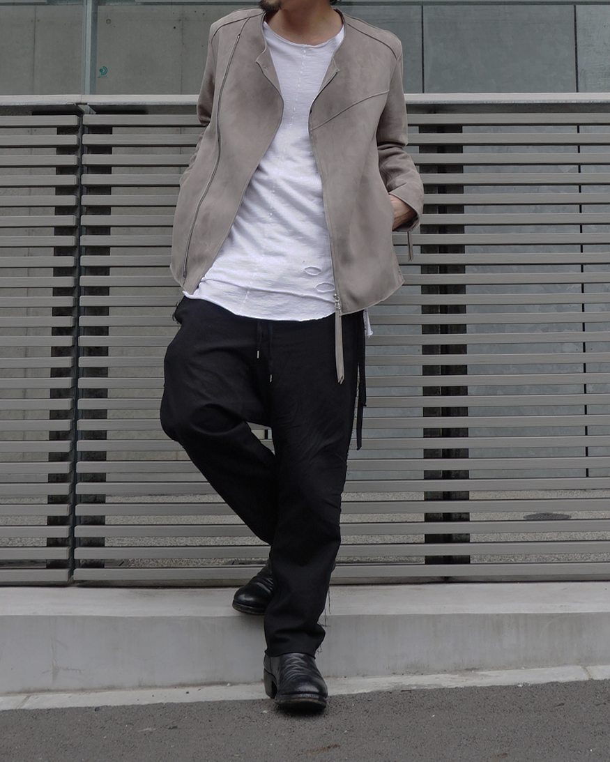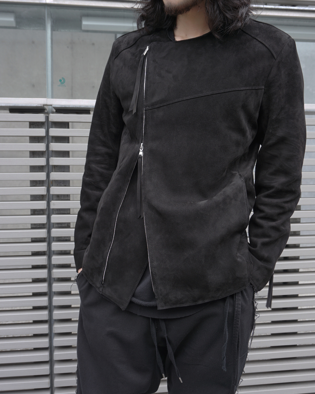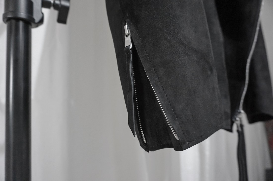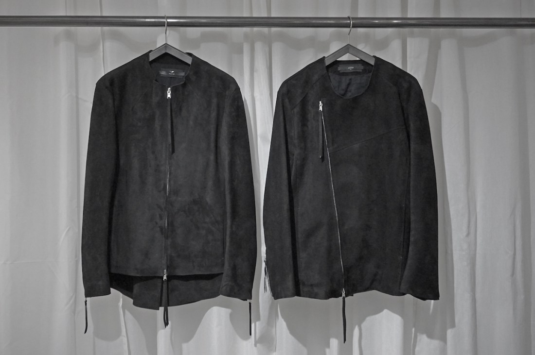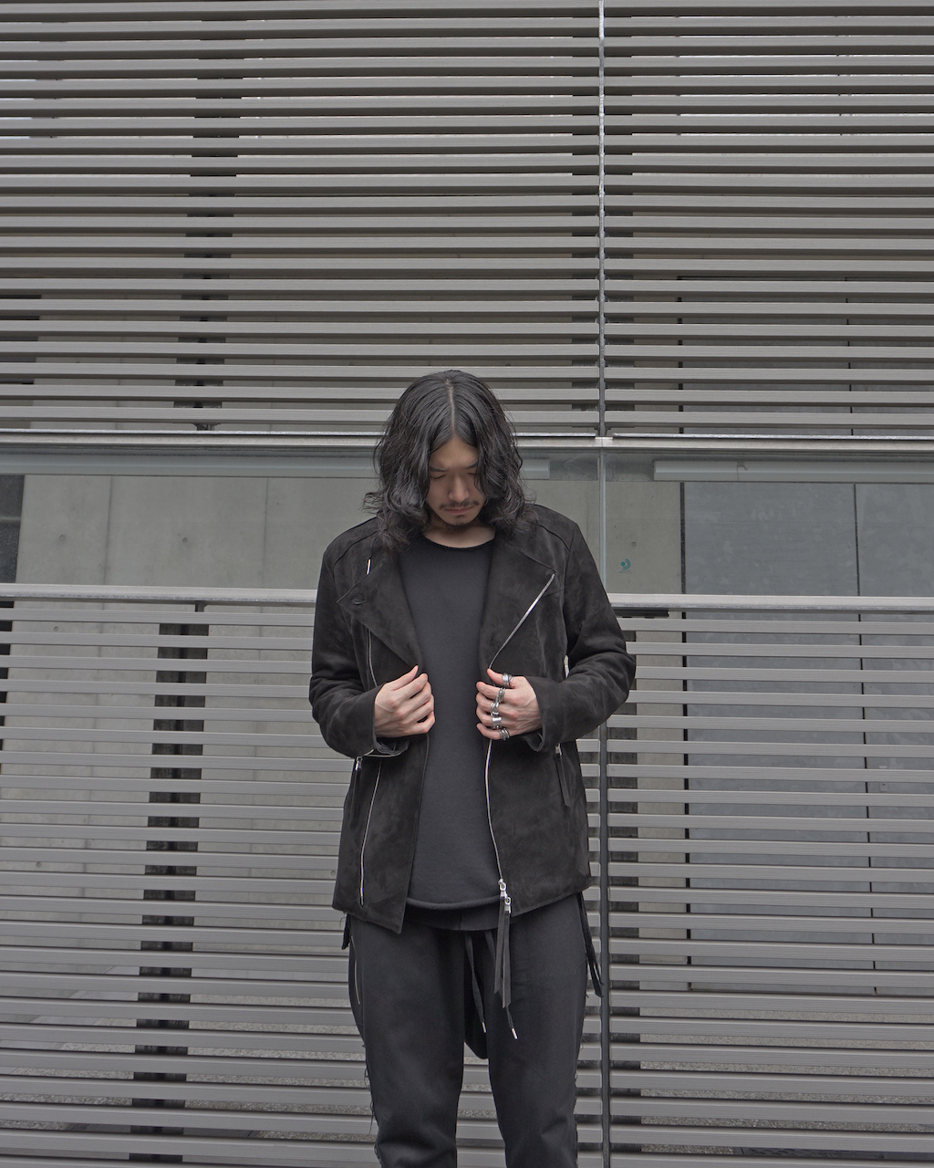 ASKYYといえばのノーカラーをダブルにも採用し、シングルライダースとの親和性を高めています。