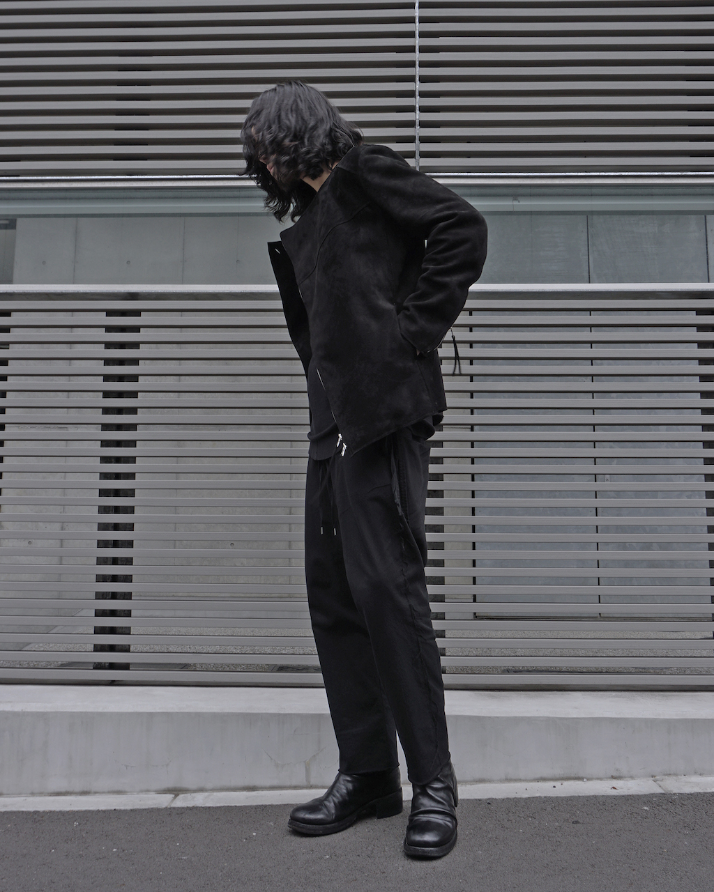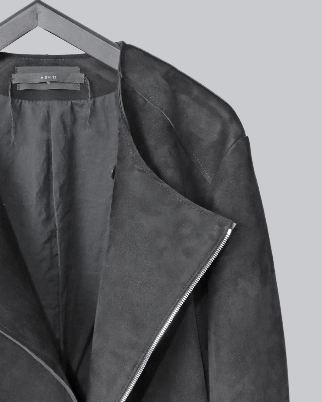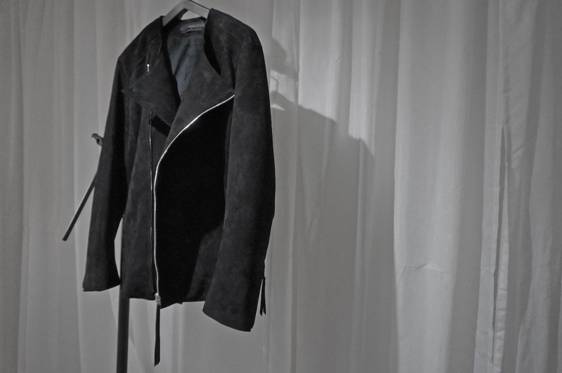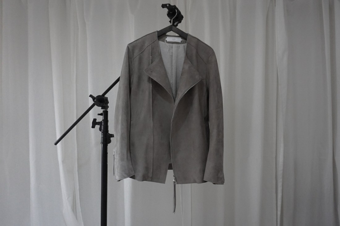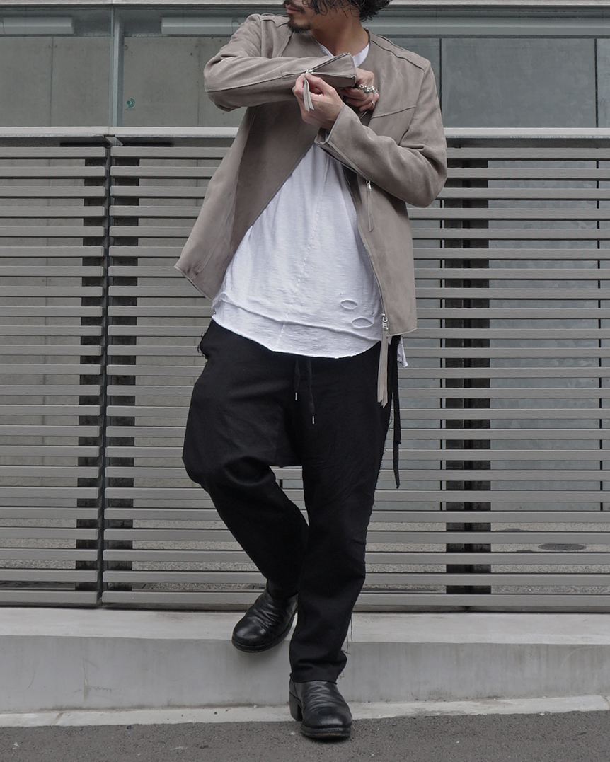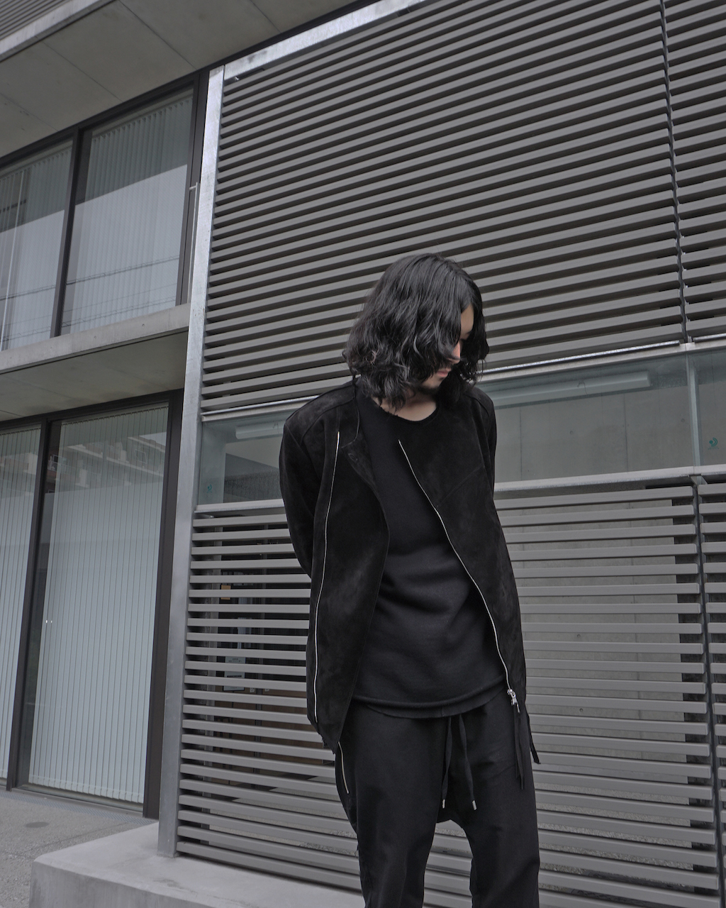ASKYYといえばのノーカラーをダブルにも採用し、シングルライダースとの親和性を高めています。