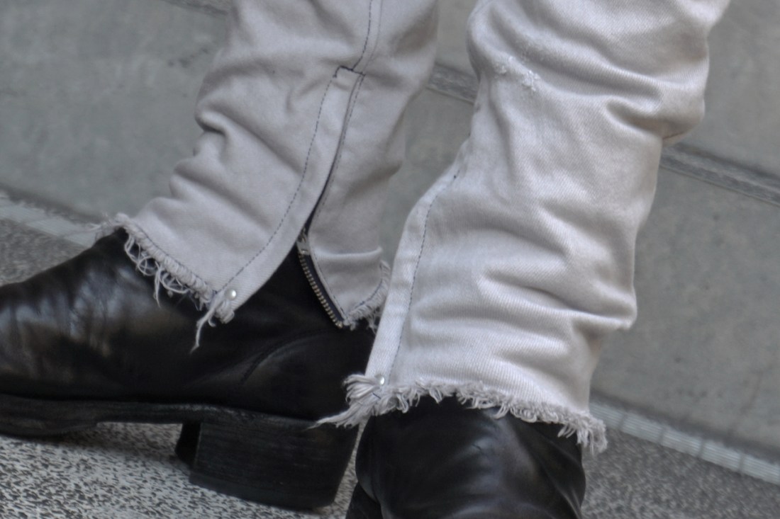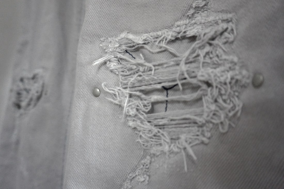 巷でよく見るクラッシュデニムのようにへ激しいリメイクや鬼加工が施された作品と比べれば趣は落ち着いているでしょう。