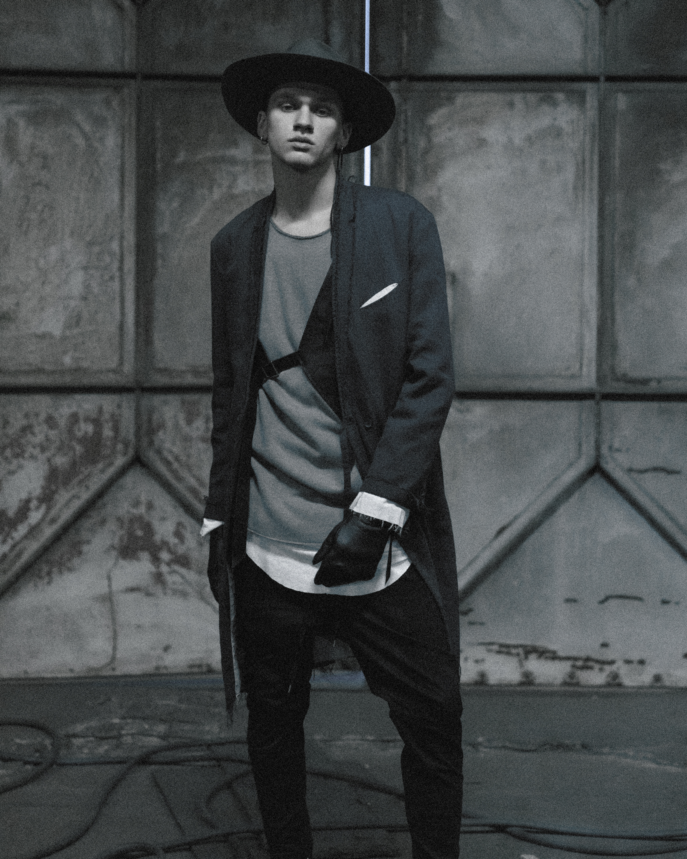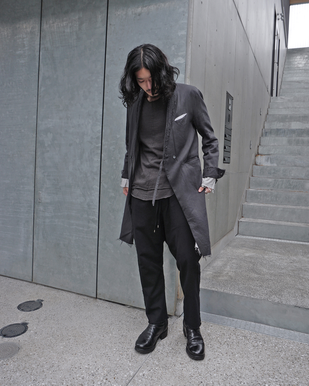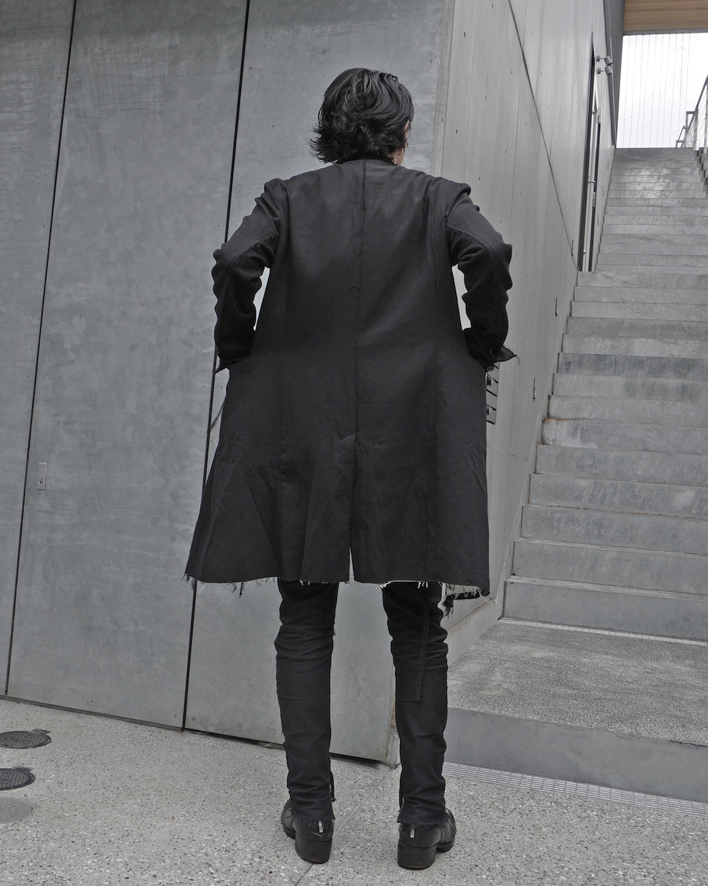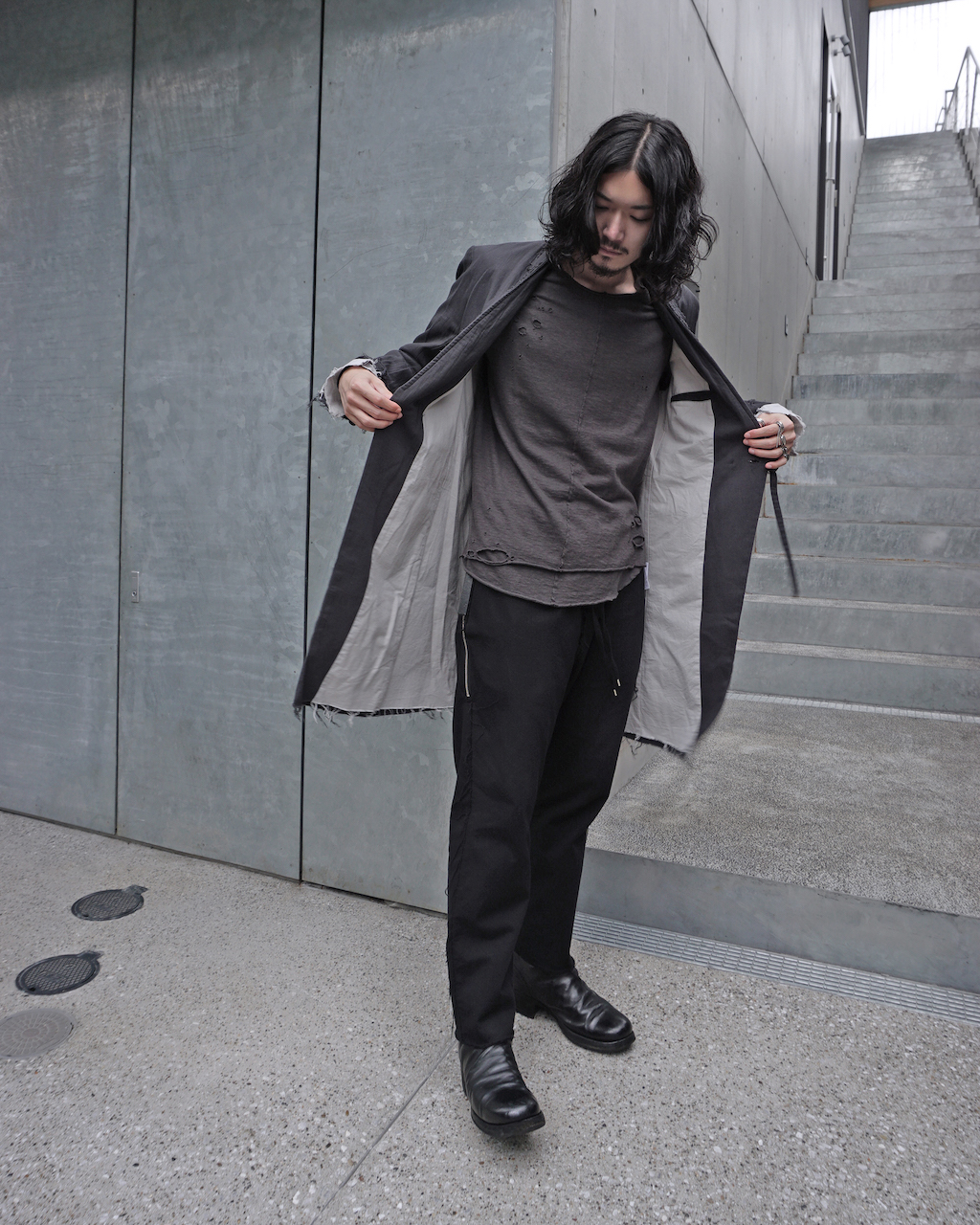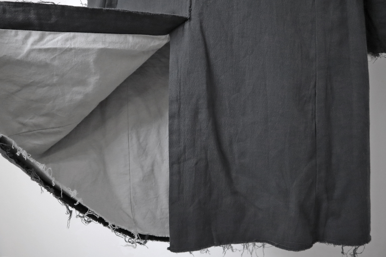 ASKYYらしい退廃的ムードは残しつつ、他の部位は通常のフラットな縫いでクリーンに。