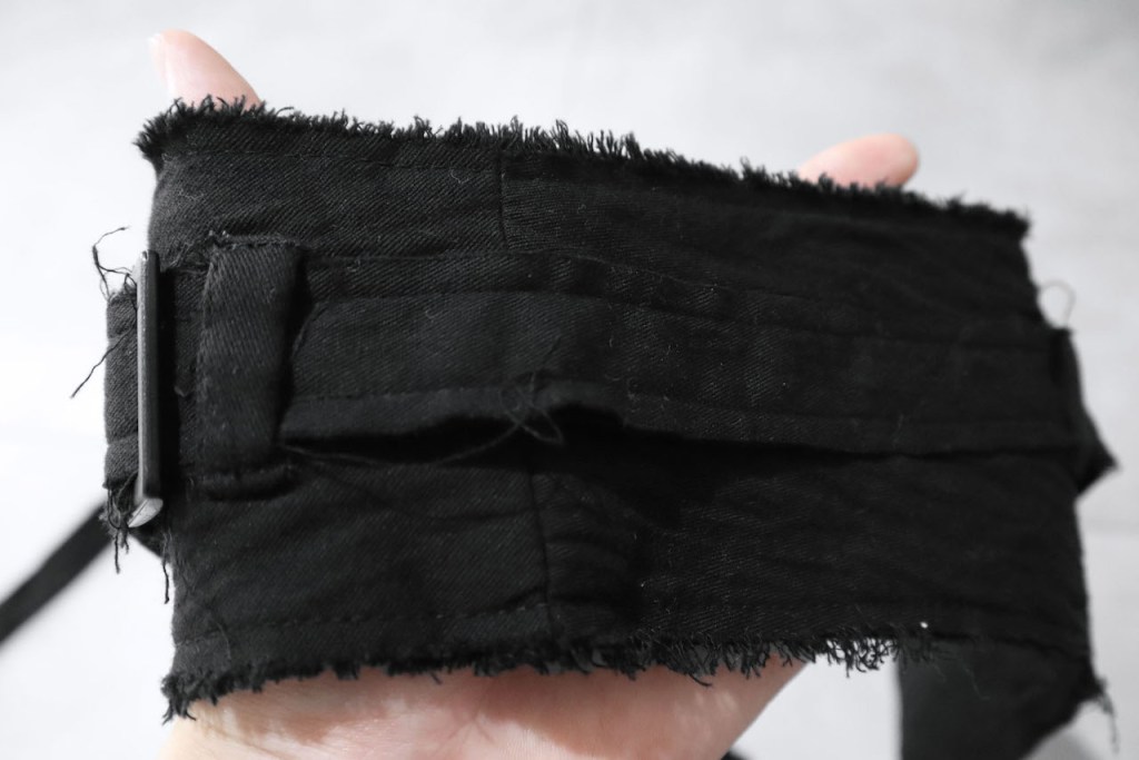 背面にもベルトを垂らし、構築的なフォルムとしました。