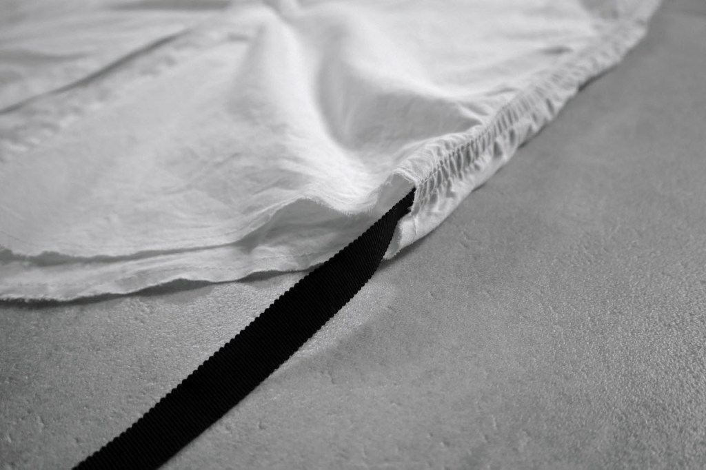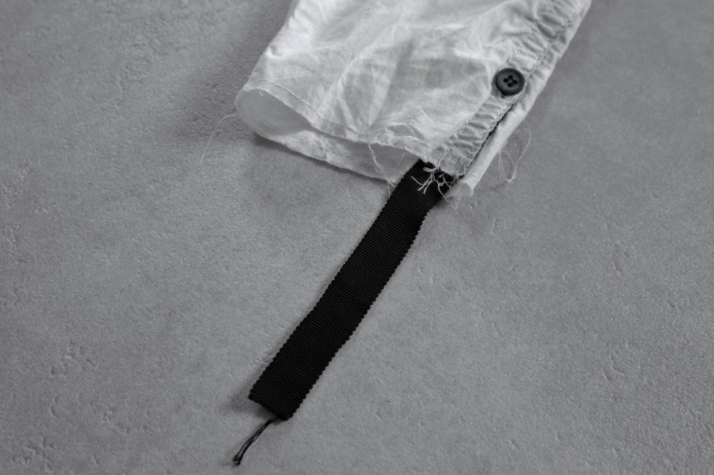 袖口のリボン、そして裾に垂れるリボンによる繊細さの増幅は意図したものであります。