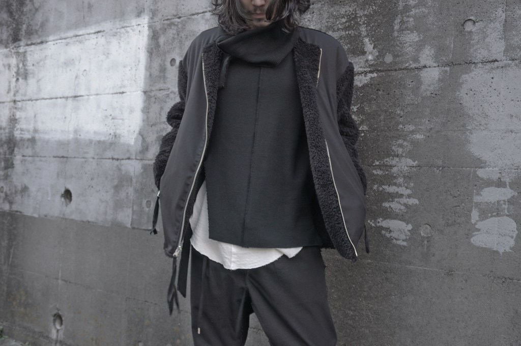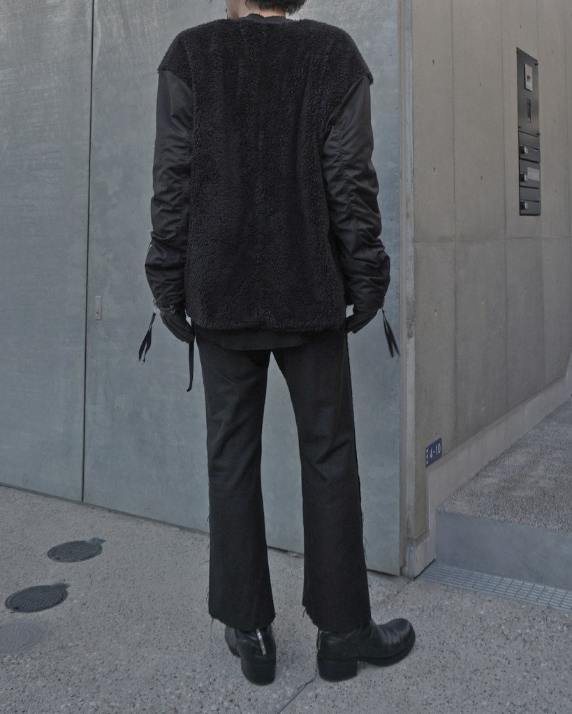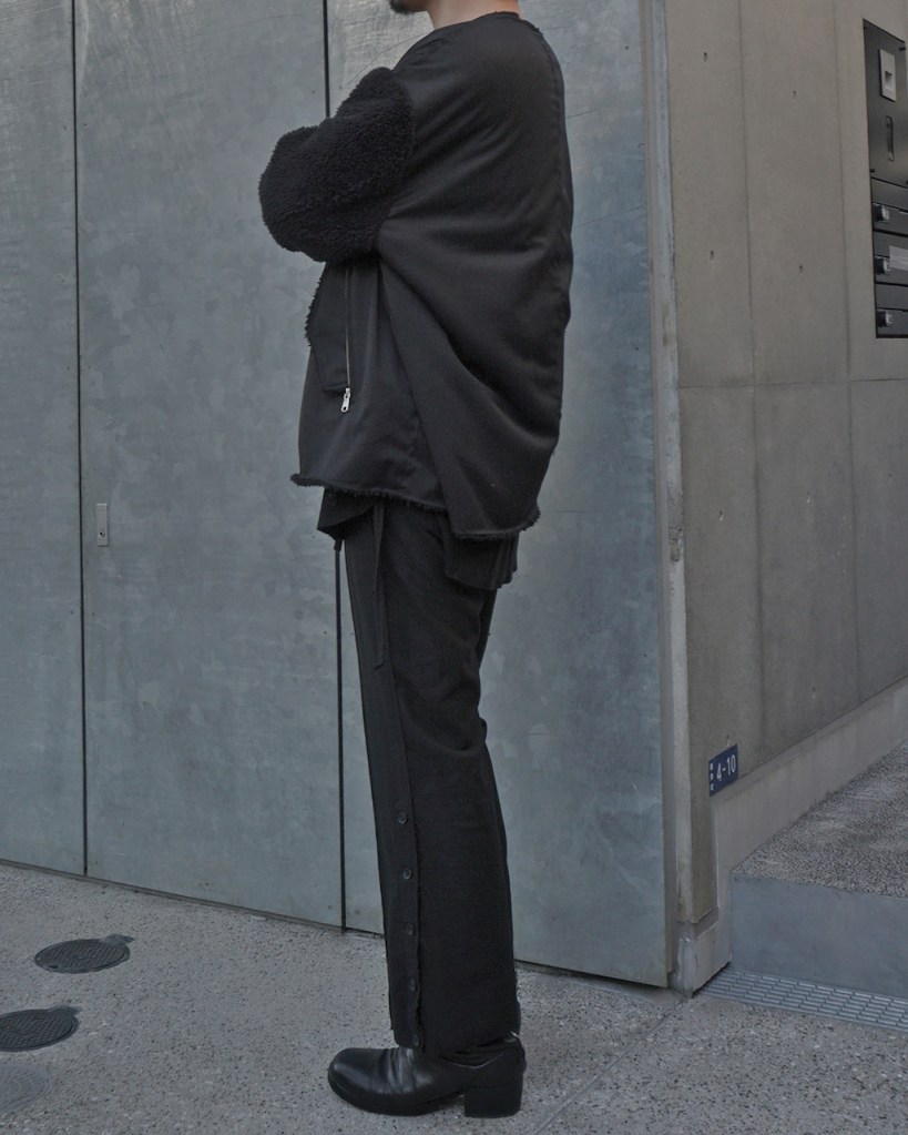 本来あるべきリブの襟は、ざっくりカット。これはいつも通り通常運転。今作はオーバーフィットのため、ノーカラーのすっきり具合がさらに際立つかと思います。これでリブあった場合結構ハードな印象ですしね。