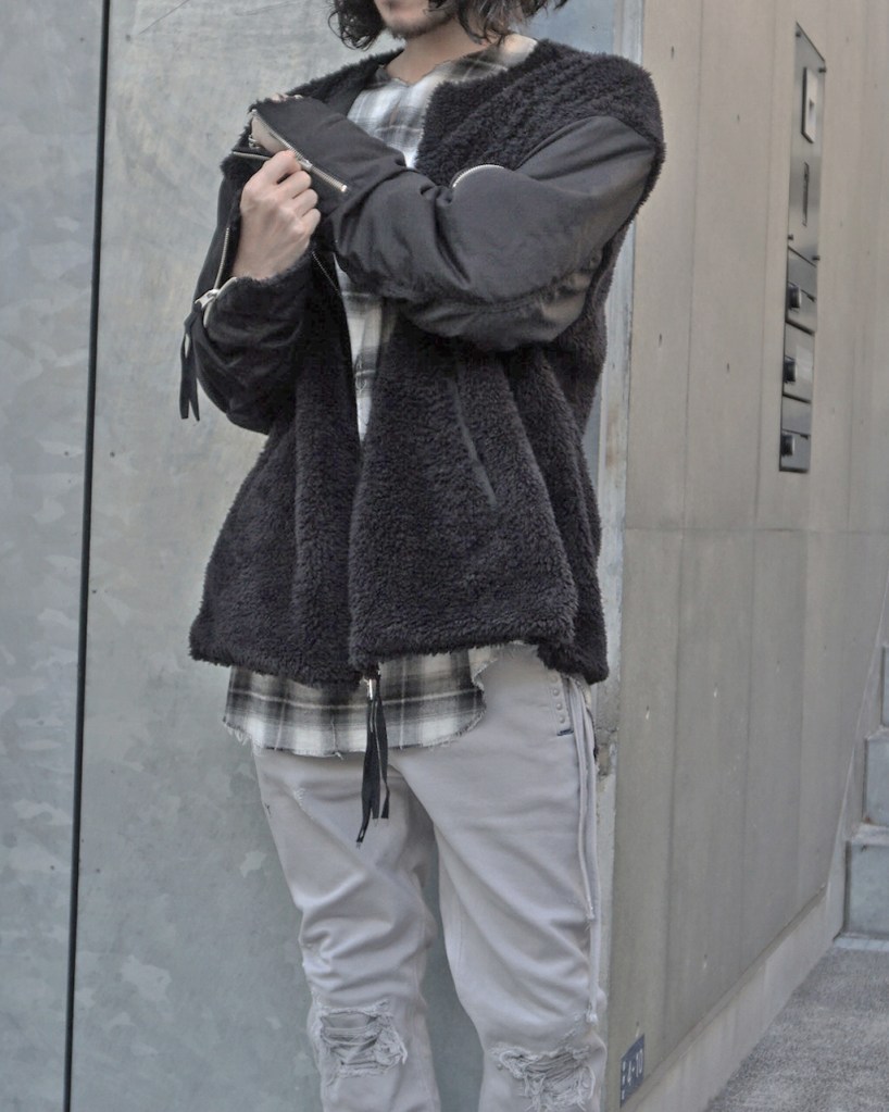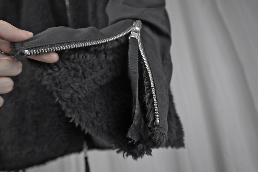 そのボアに関してですが、着用時の最初の方は少し抜けが出ます。面の部分ではなくフチの部分から。こればかりはすみません。ボア素材、縫製上の特性としてご理解くださいませ。まぁフチだけなので徐々に落ち着いてくるかと思います。