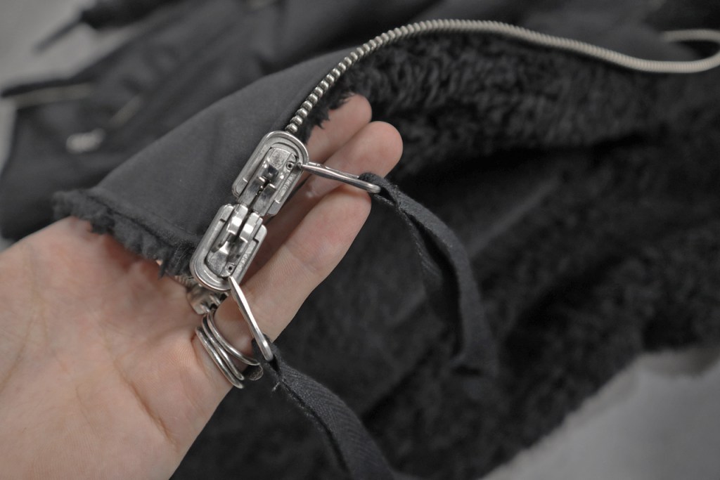 ・引き手がくるっと回転する、リバーシブルでの着用を可能としたファスナー。