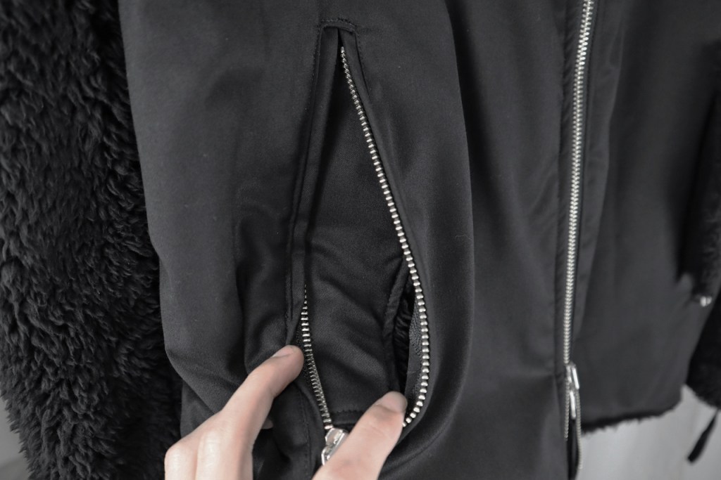 フロントだけでなく、袖のファスナーもリバーシブルにすることでA側でもB側でも同じ雰囲気をまといます。