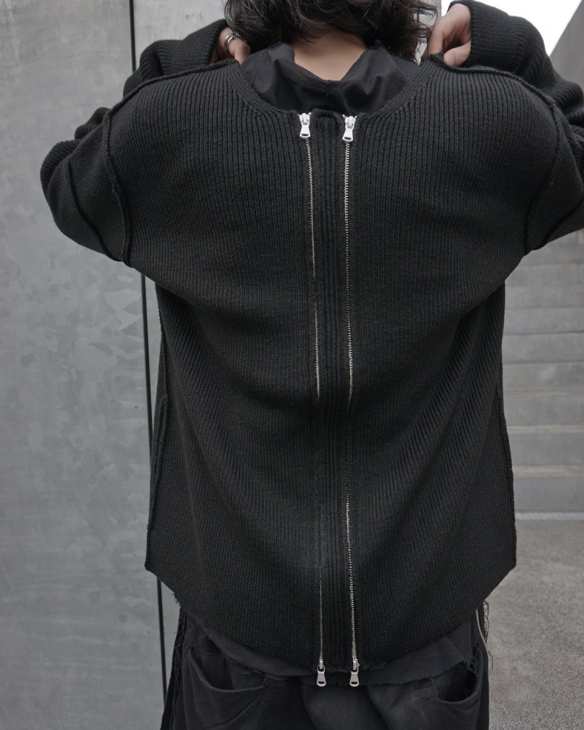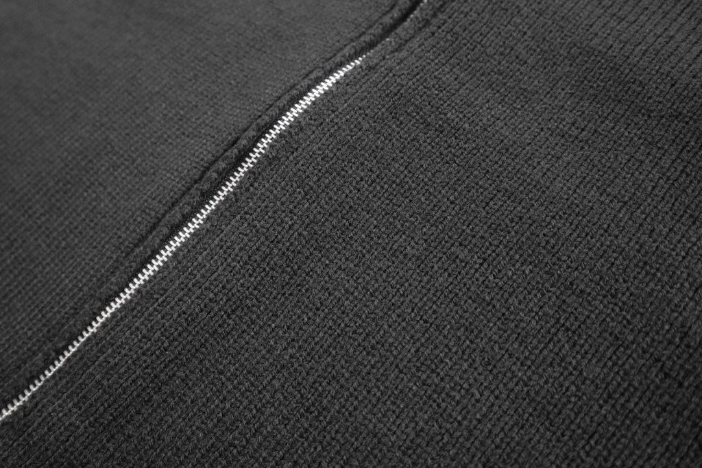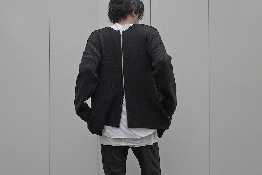 一方で、背面のシングルジップ側はエレメントを敢えて剥き出しにすることで、ニットと金属のコントラストを強調。