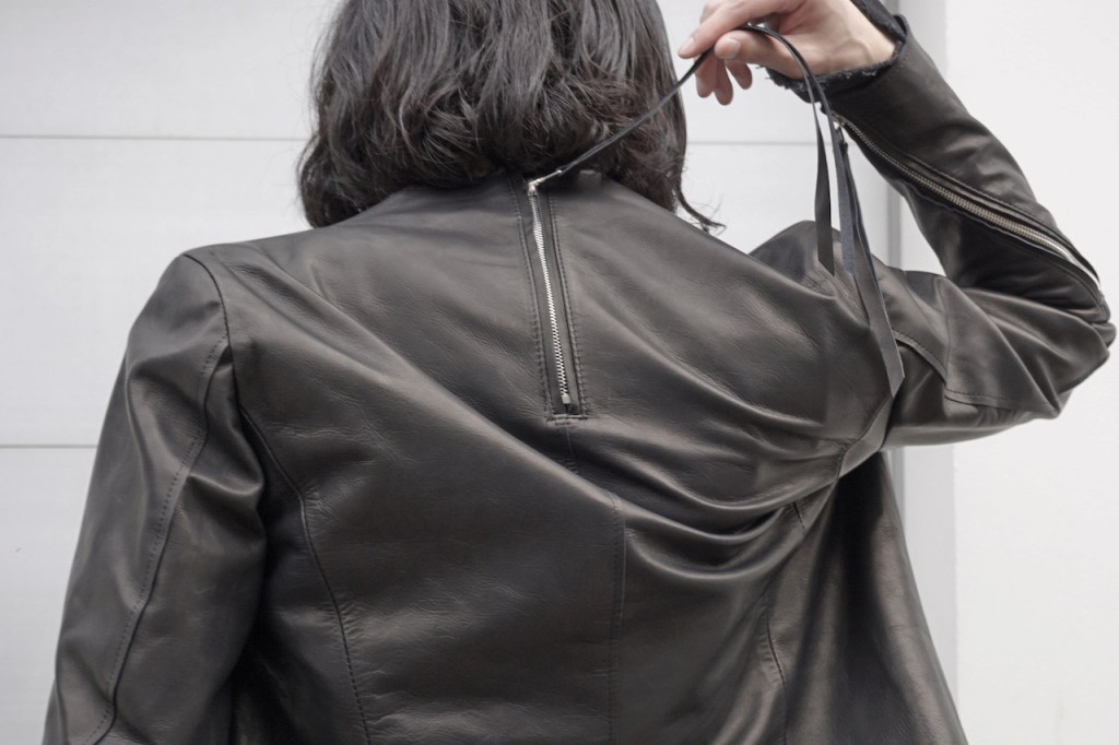 もともとのイメージは無機質なレザーと有機的な曲線を描くカーブジップのコントラスト。