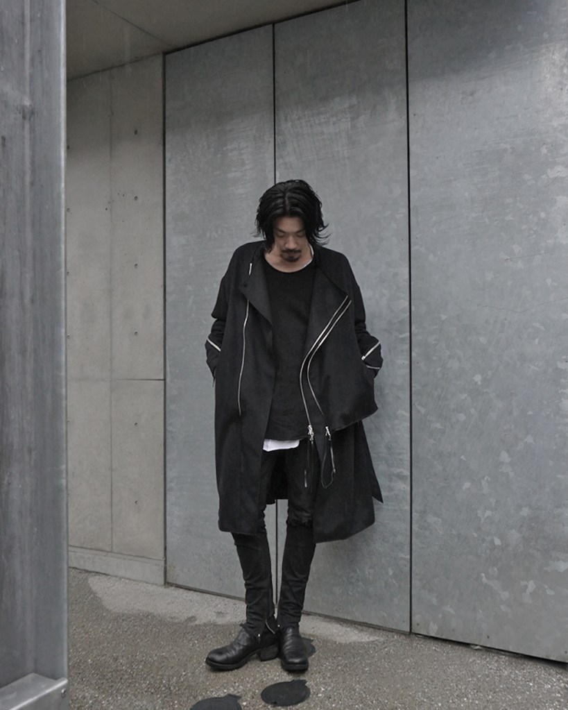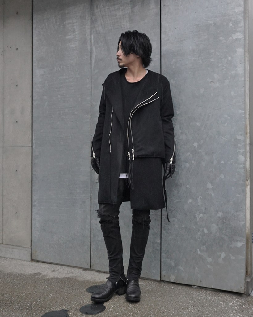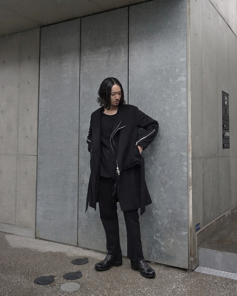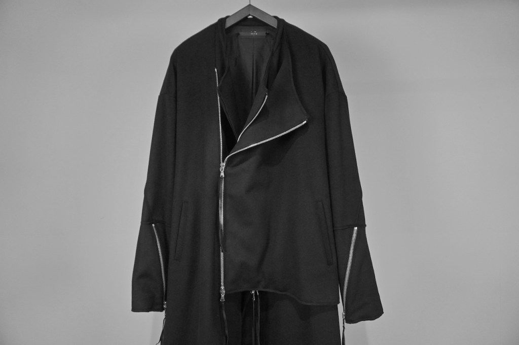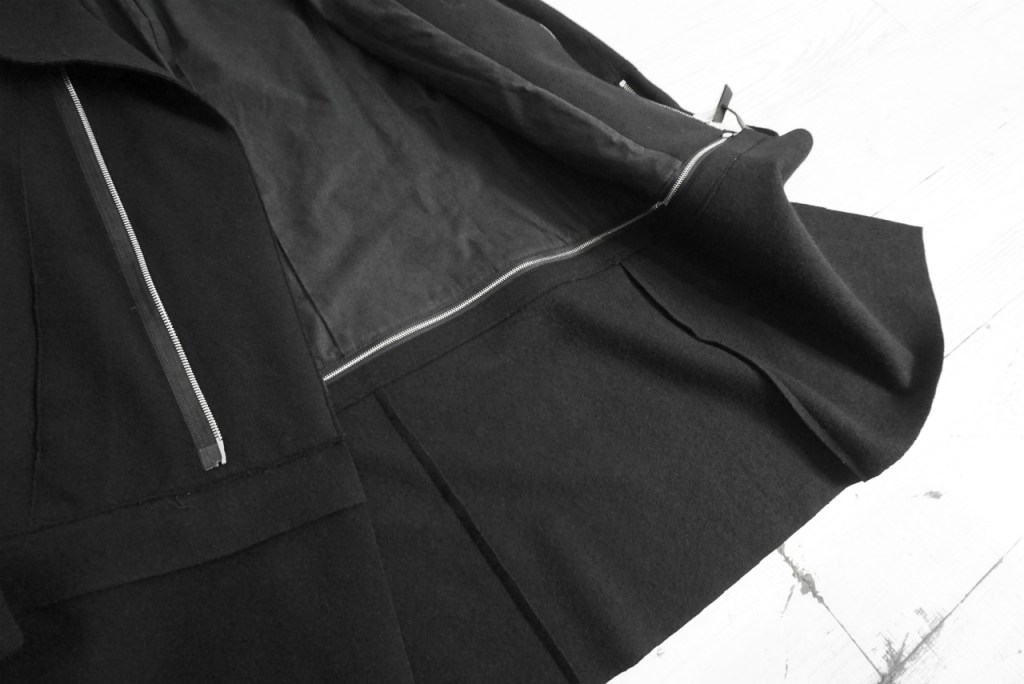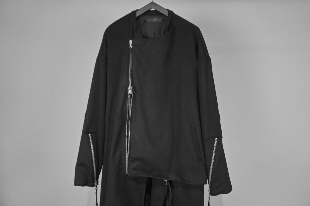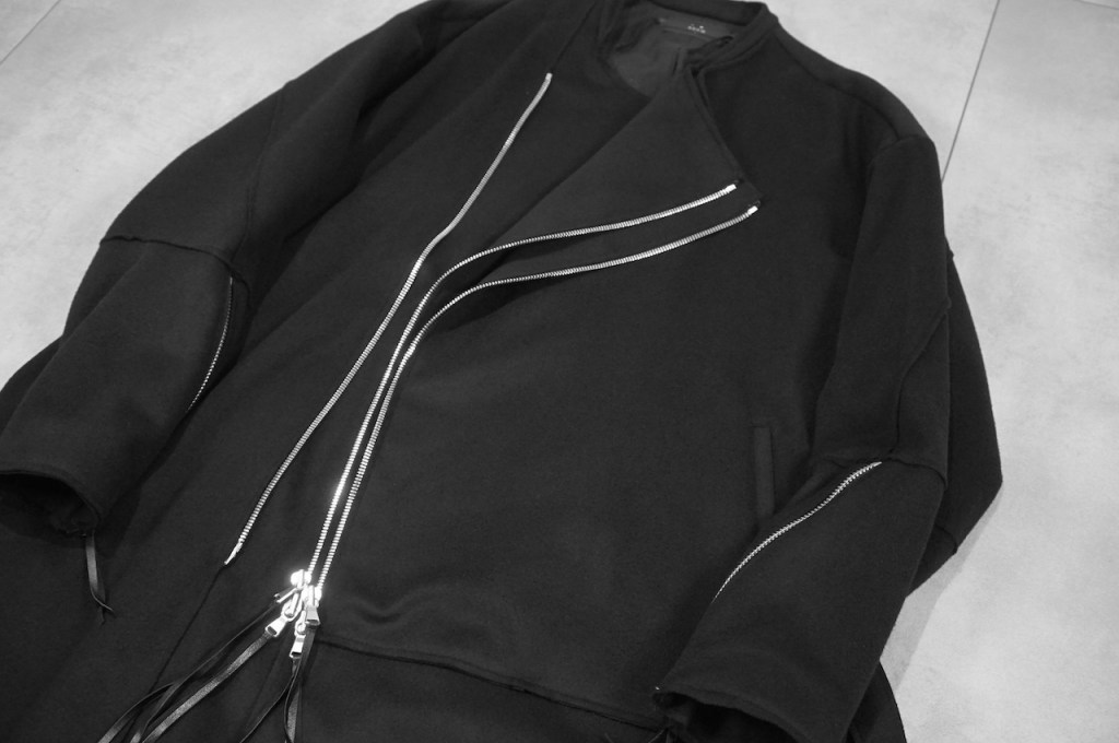 CURVED ZIPPERの袖部分で用いていた長めのジップですね。フロントと袖のジップのリズム感が心地よい。