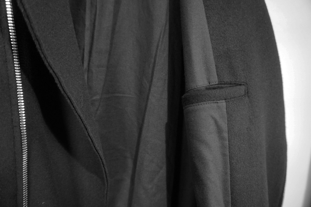 細かい部分で言えば、左身頃のレイヤード部分がめくれても表と同素材で仕立てていることによって見た目も綺麗にしてあります。