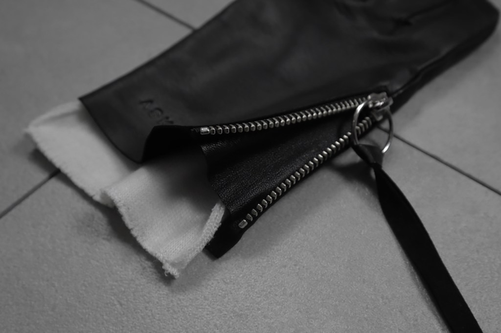 ジップの先には垂れたレザーコード。所作の邪魔をしない長さで設定してます。