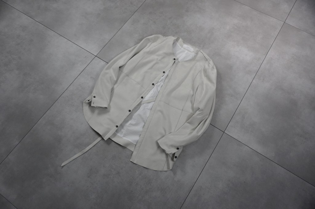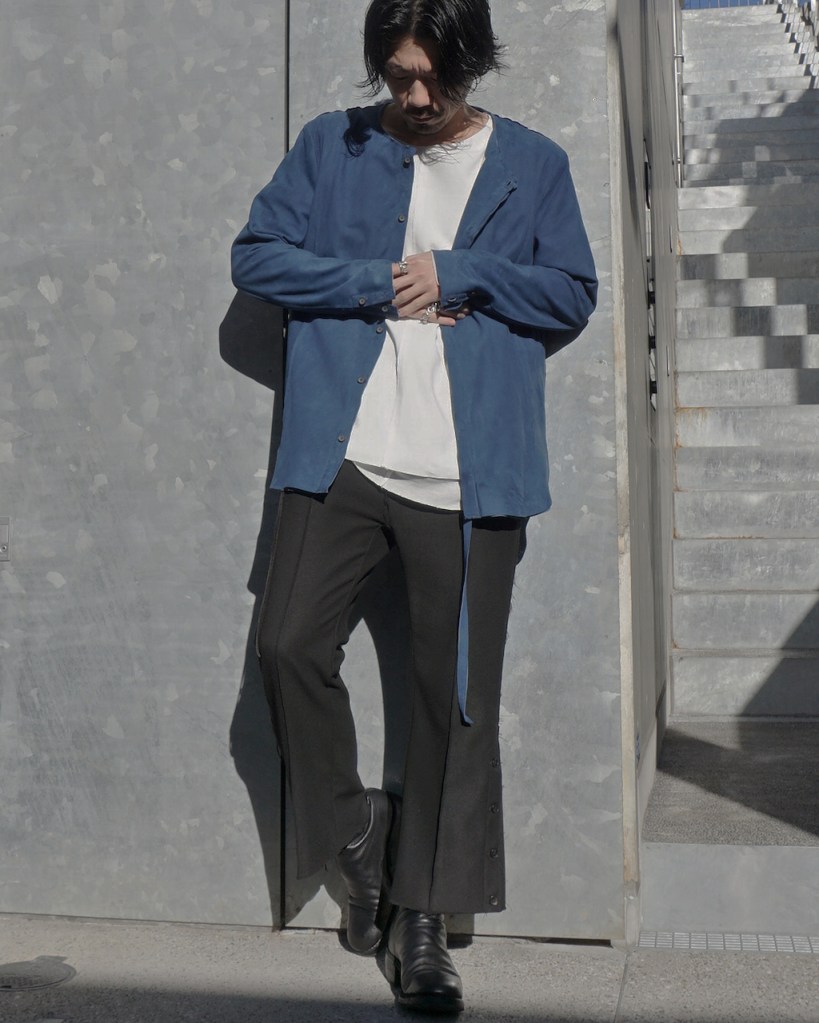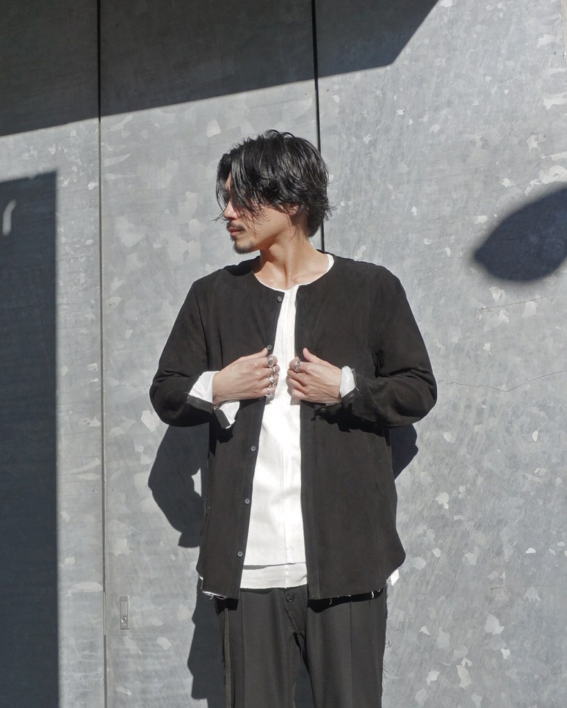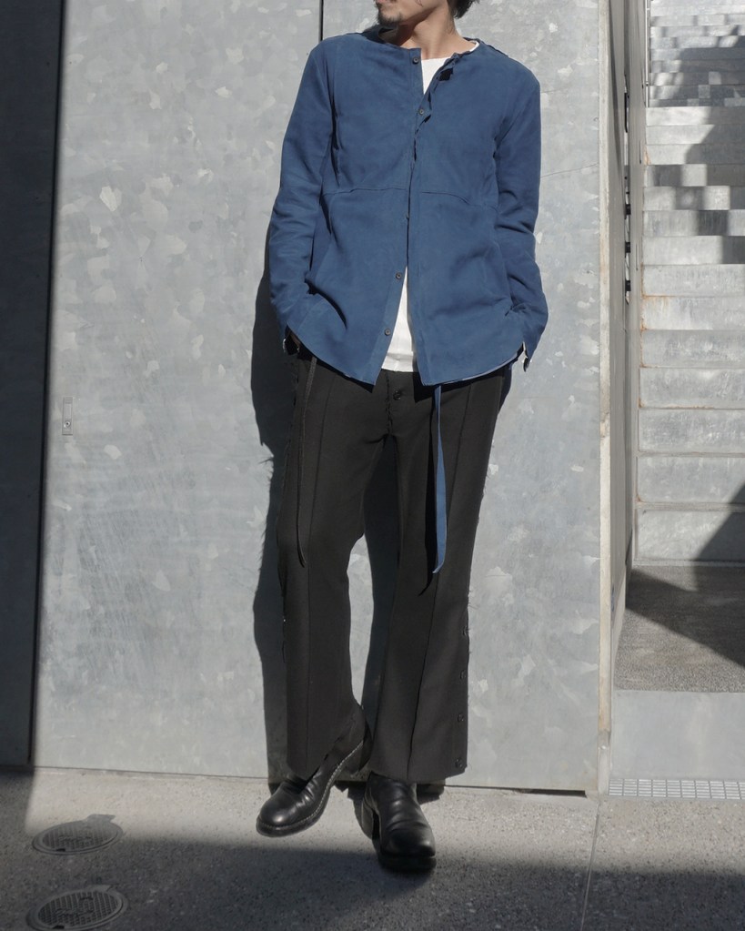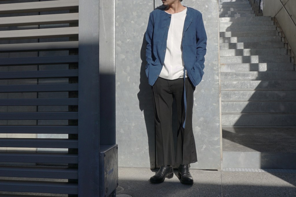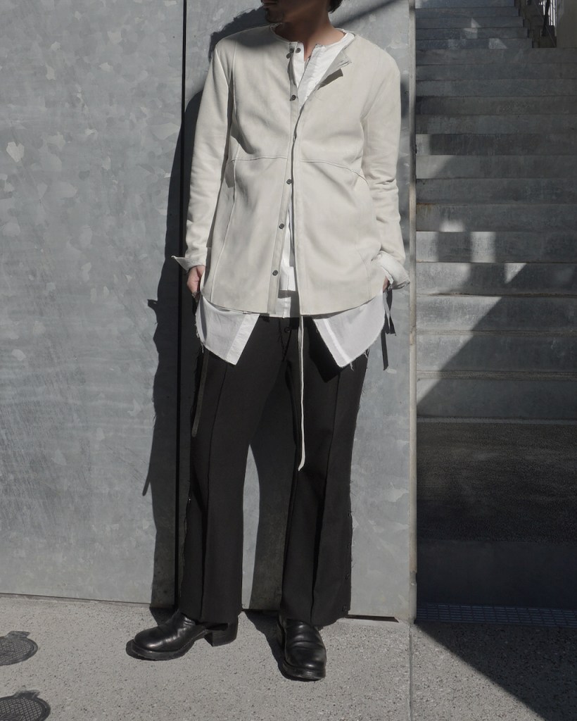 このアプローチ、20awのレザーでも採用していますが前開けのアイテムの場合はさらに引き立ちます。この少しの「癖」がただのノーカラーシャツでは飽き足りない部分を満たしてくれる。