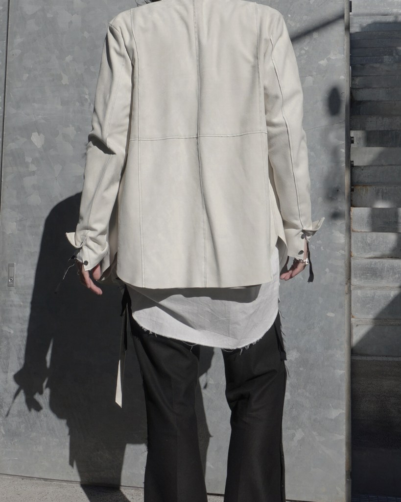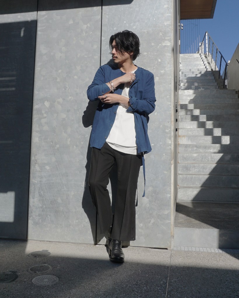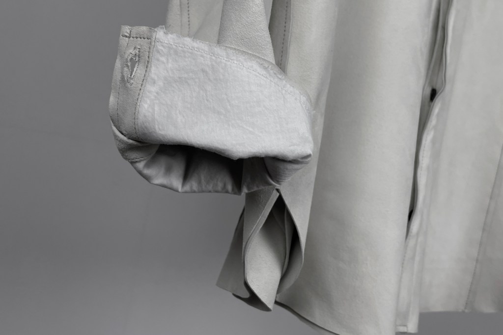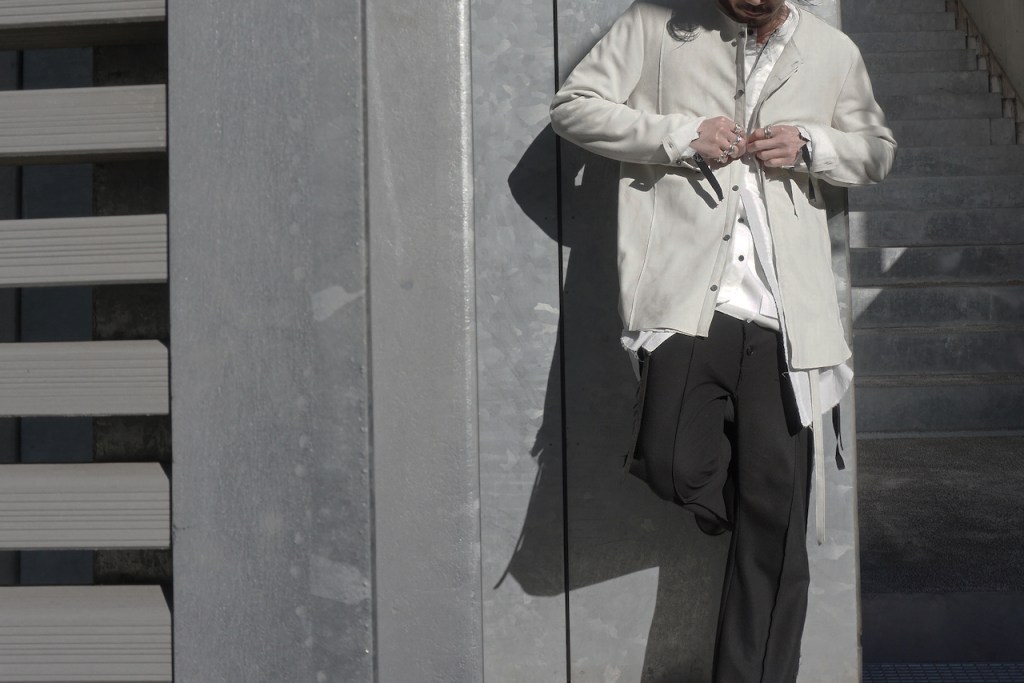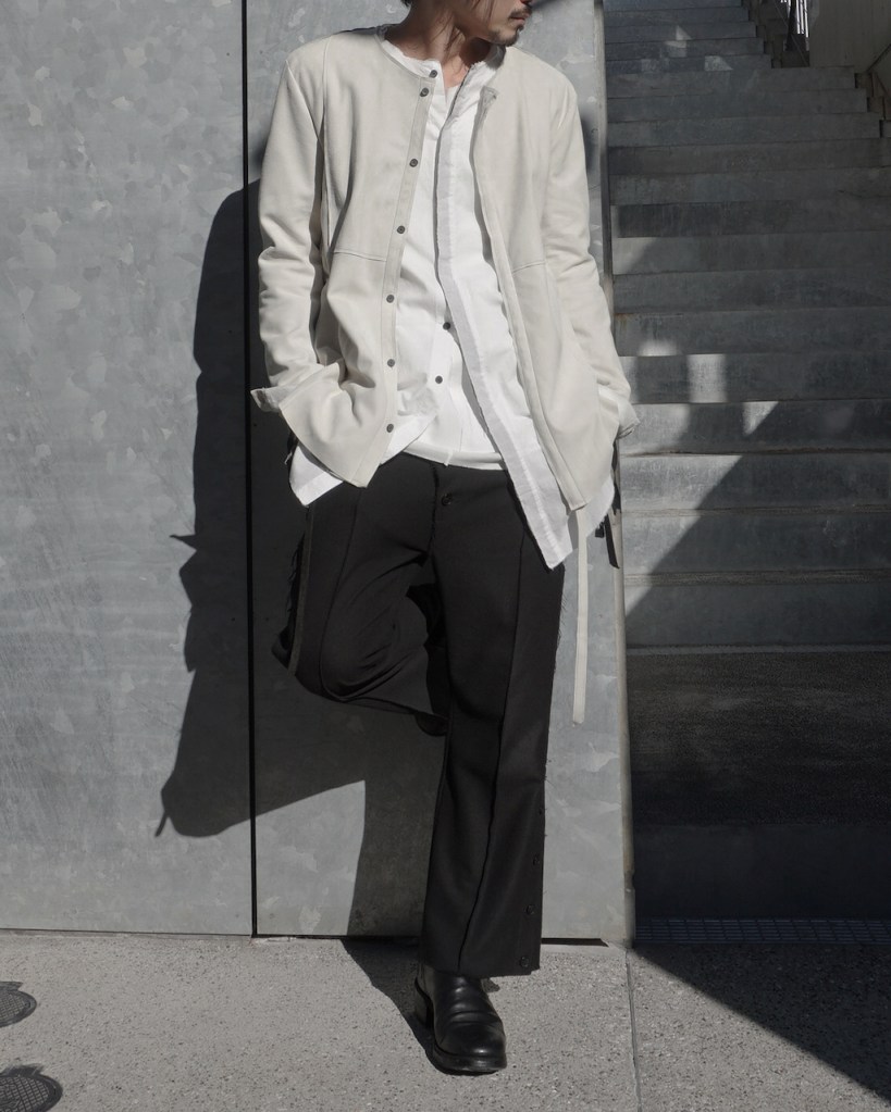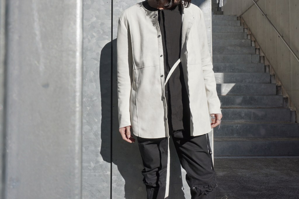 このアプローチ、20awのレザーでも採用していますが前開けのアイテムの場合はさらに引き立ちます。この少しの「癖」がただのノーカラーシャツでは飽き足りない部分を満たしてくれる。