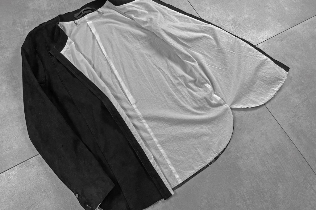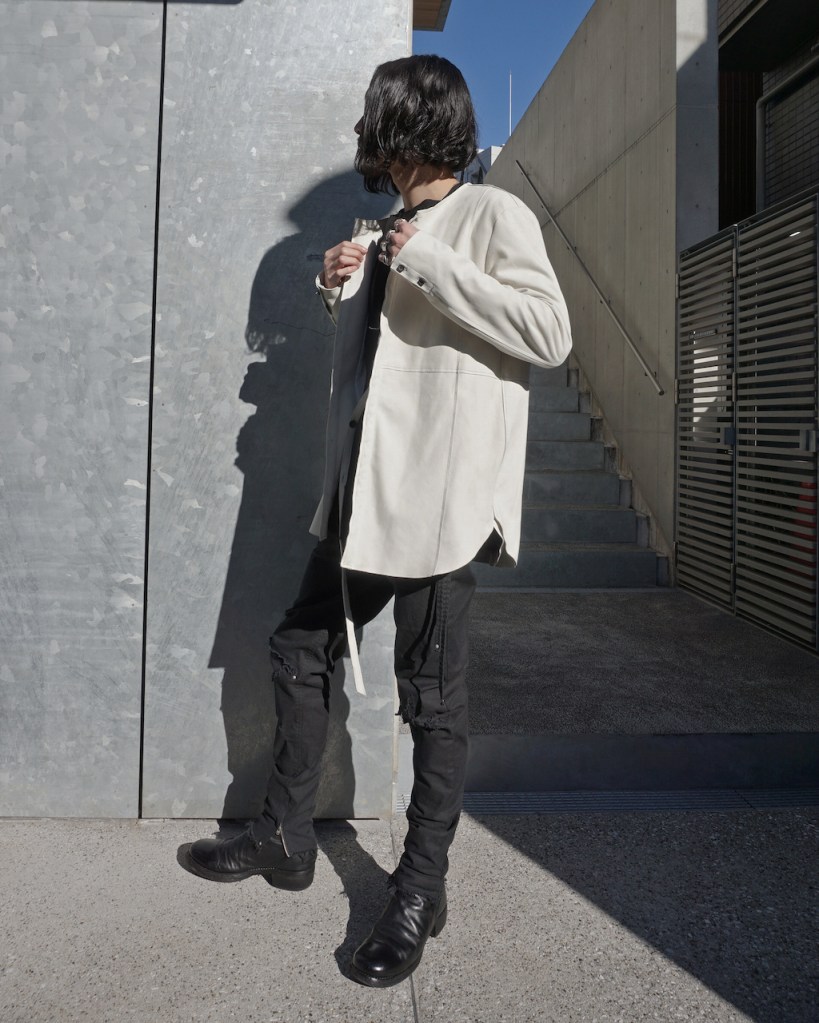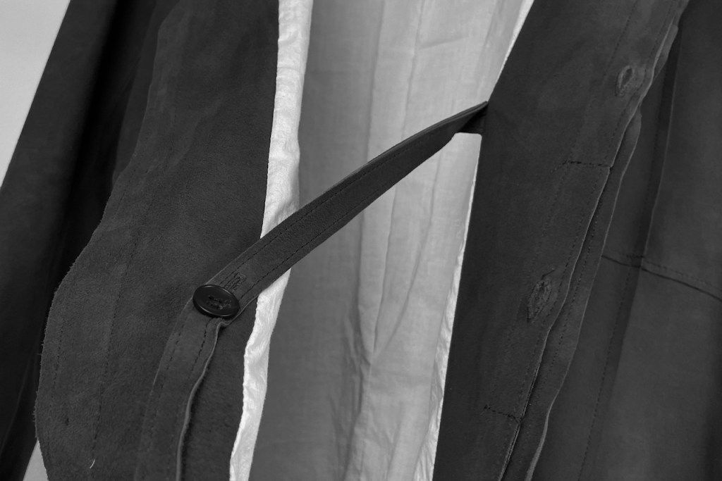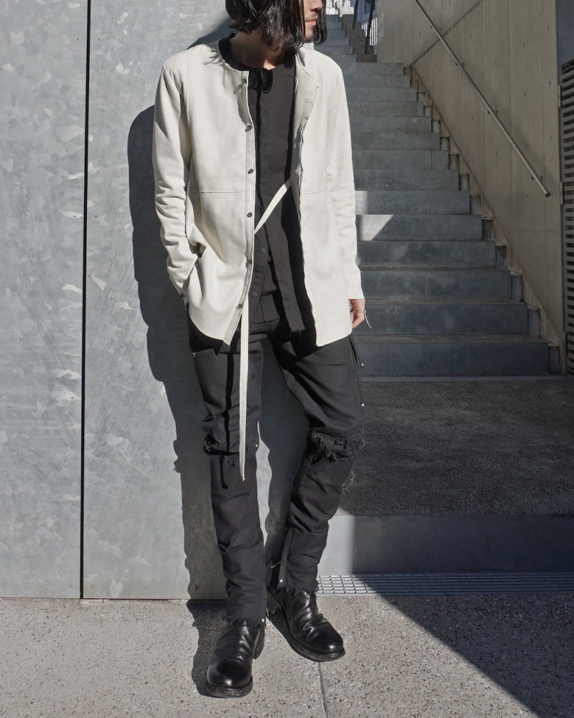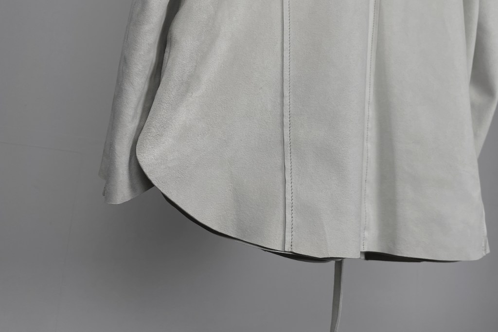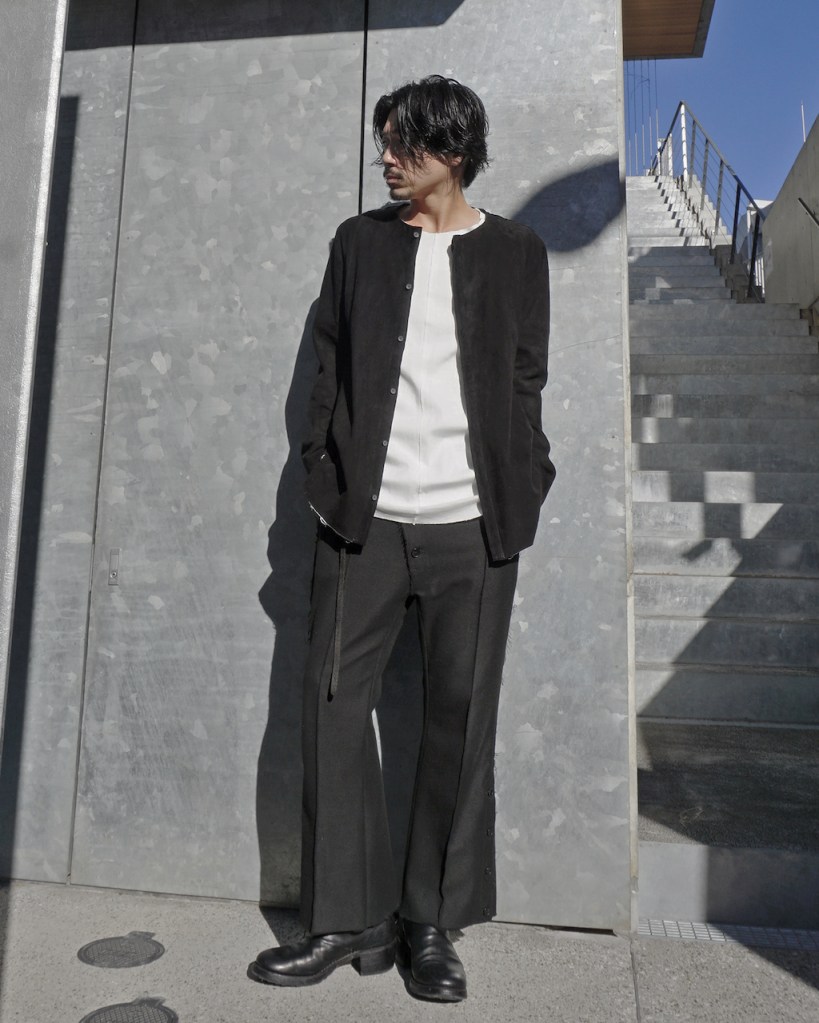 このアプローチ、20awのレザーでも採用していますが前開けのアイテムの場合はさらに引き立ちます。この少しの「癖」がただのノーカラーシャツでは飽き足りない部分を満たしてくれる。