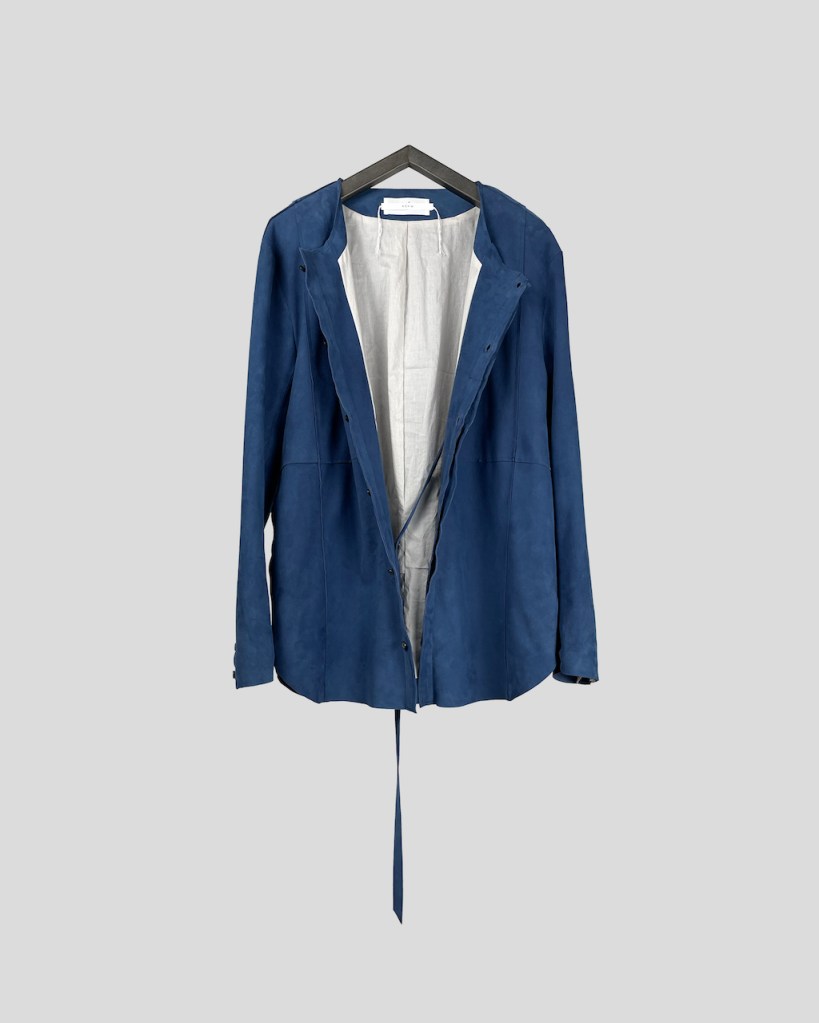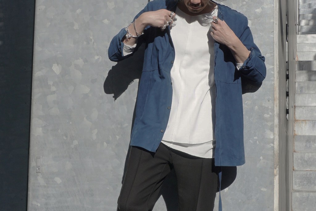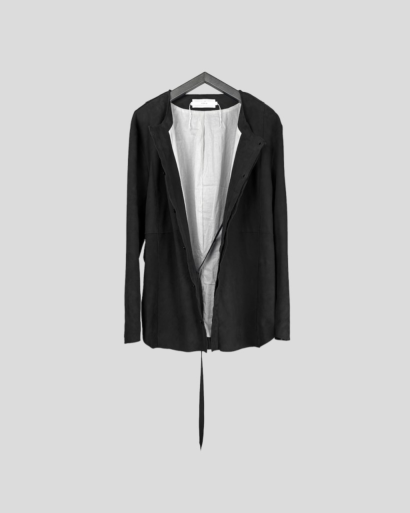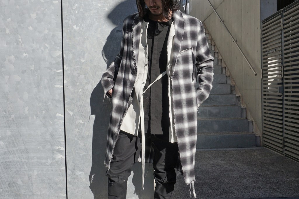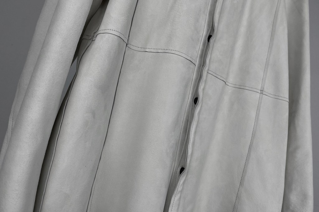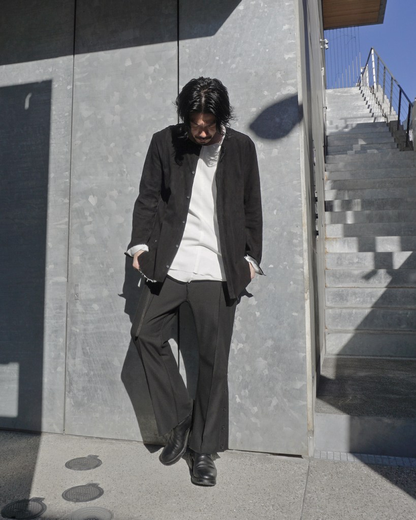 このアプローチ、20awのレザーでも採用していますが前開けのアイテムの場合はさらに引き立ちます。この少しの「癖」がただのノーカラーシャツでは飽き足りない部分を満たしてくれる。