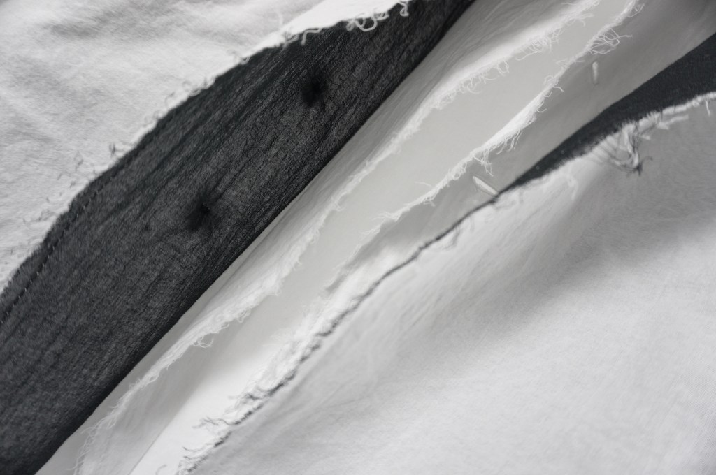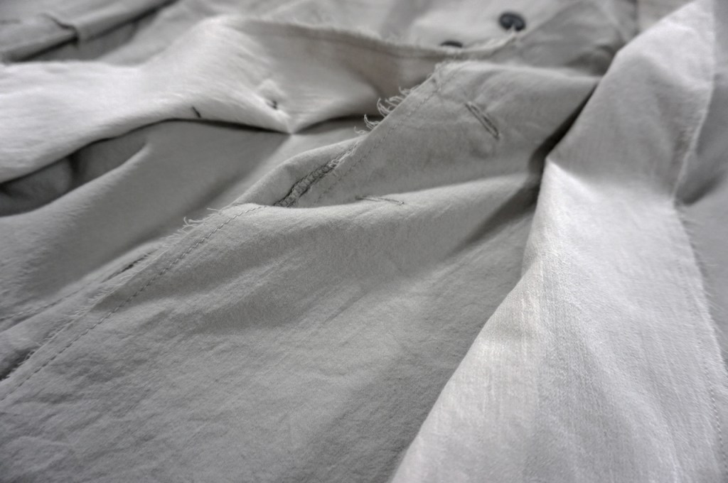 その2種の生地を貼りあわせ、がっつり洗いをかけることでエイジング。洗いざらしのシャツの抜け感を創出し生地の良さを引き出しながら馴染ませています。