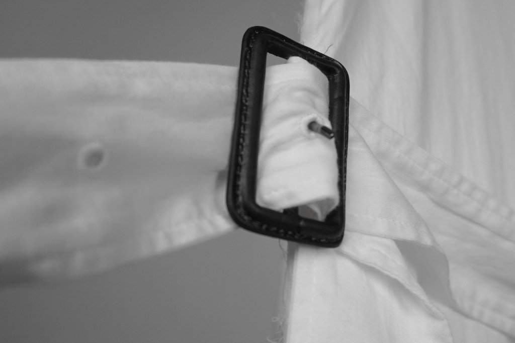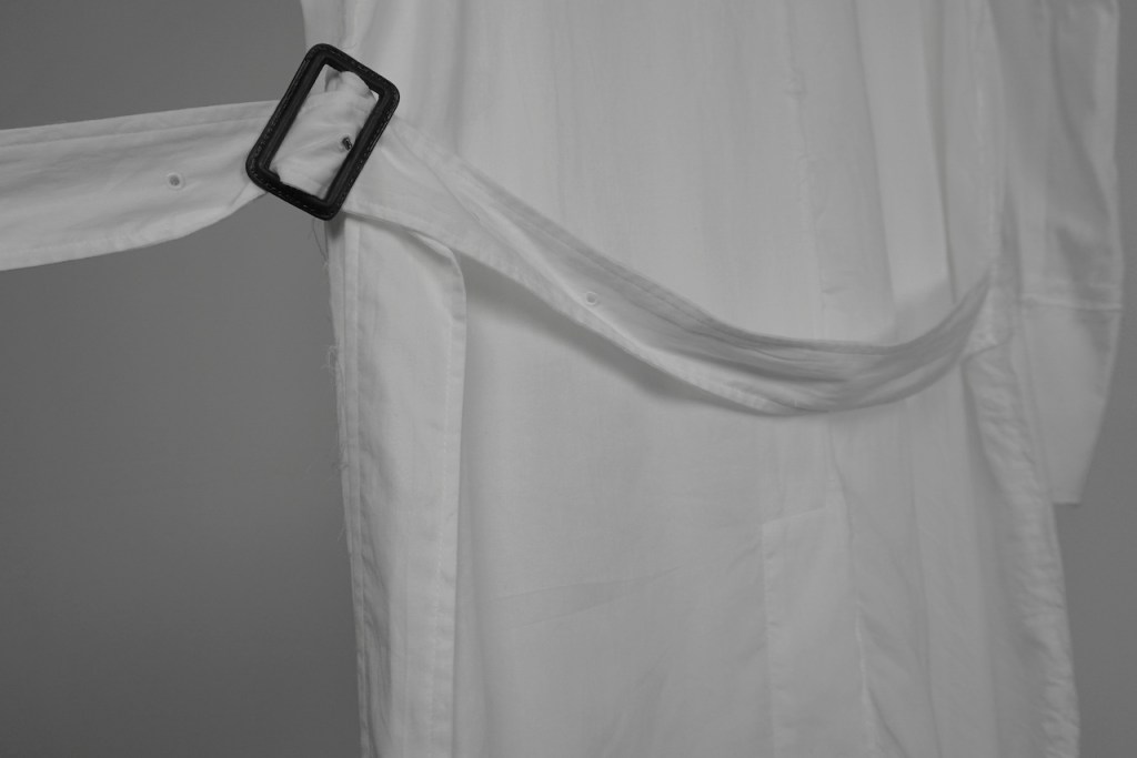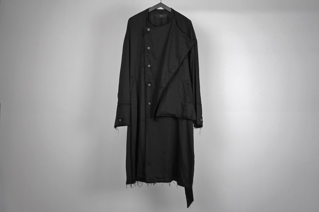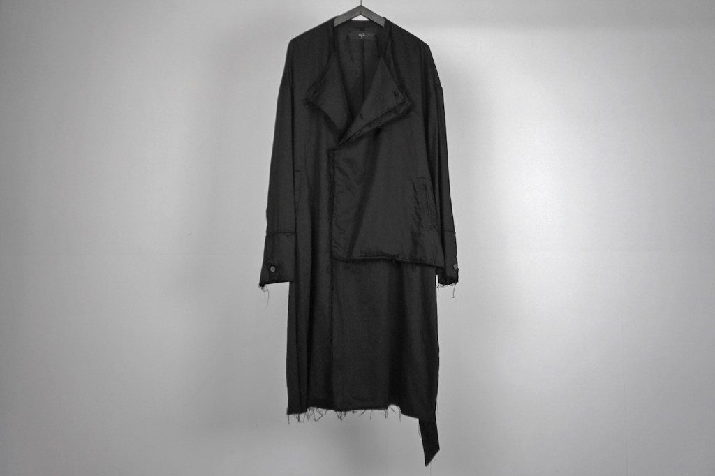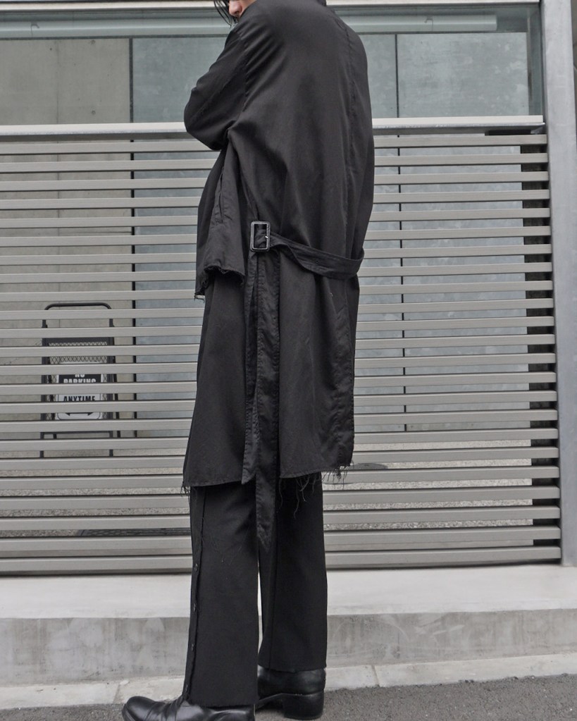 コートのベルトは基本ベルトループで吊るされているものが多く、左右に遊びがある分シンメトリーに調整しなくてはいけないケースも多いと思いますが、今作に関しては予めアシンメトリーで左に2本垂れ下がります。