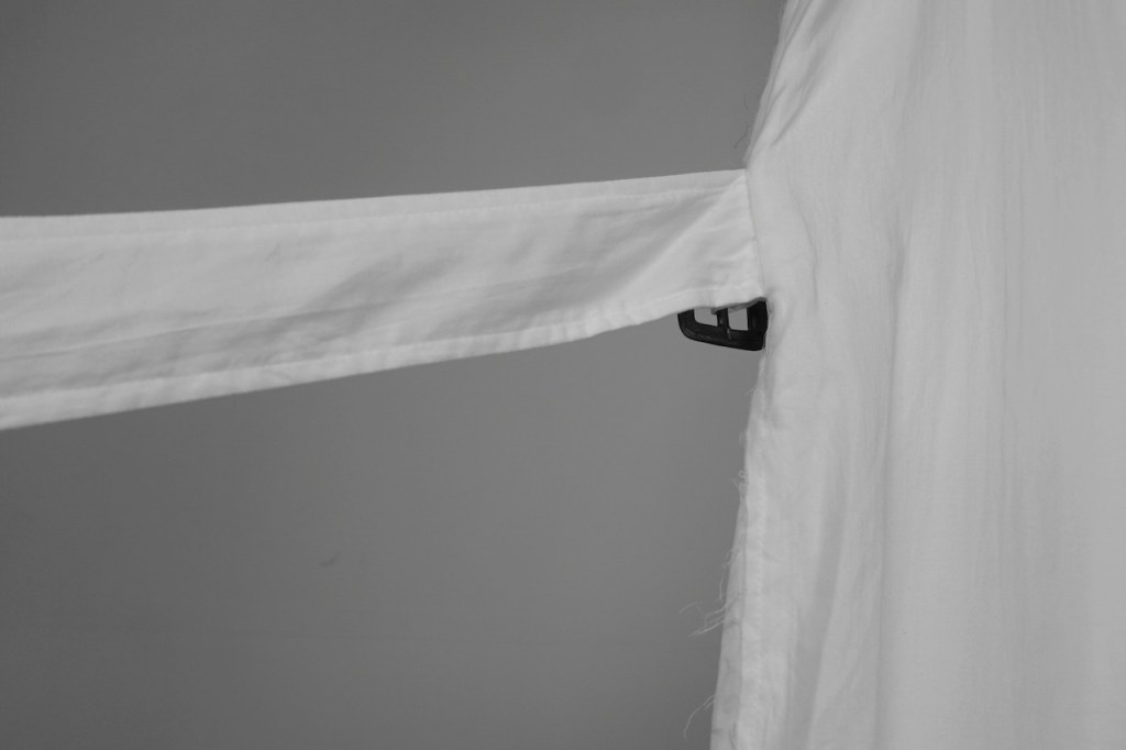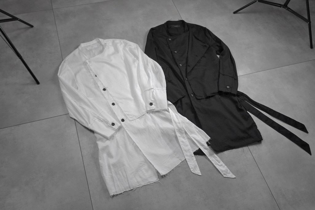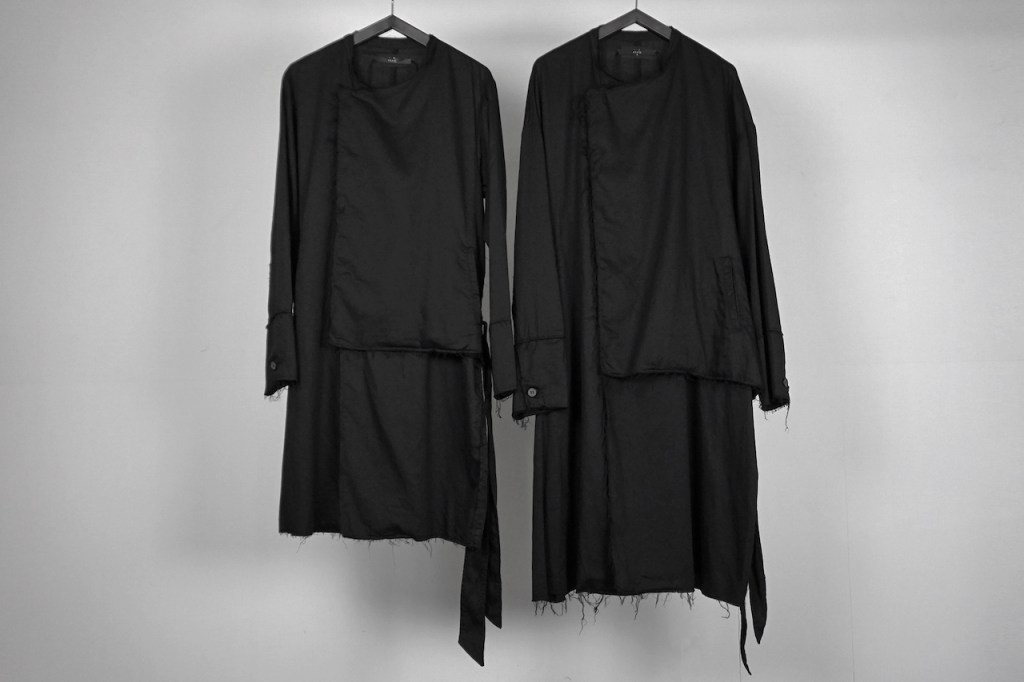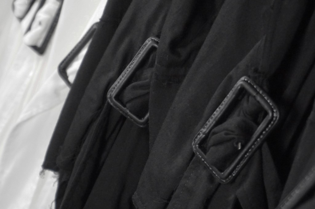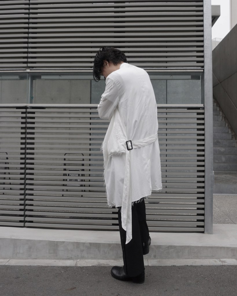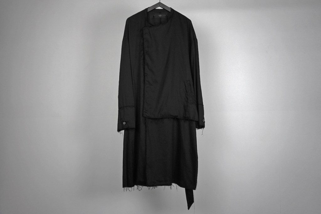 コートのベルトは基本ベルトループで吊るされているものが多く、左右に遊びがある分シンメトリーに調整しなくてはいけないケースも多いと思いますが、今作に関しては予めアシンメトリーで左に2本垂れ下がります。