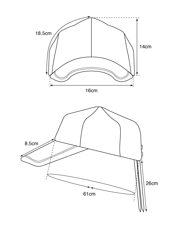 0から作ったので例えばニューエラとかそういった帽子ブランドとの参考比較は難しいのですが、採寸は以下の数値をご確認ください。